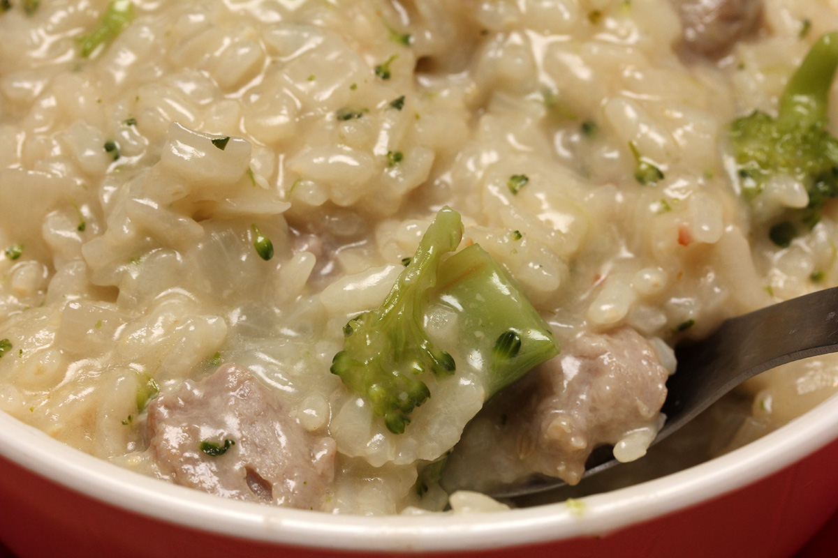 i started making my risotto at 6pm, timed to coincide to when my parents returned home. my mother returned first, got a ride from my reluctant sister who originally told my mother to simply walk home. my father got back from the nursing home right around 7pm when i finished making the risotto. i increased my ingredient portions by half: 1.5 cups of arborio rice, 2 cans of chicken broth + 1 can of water, 1-1/2 cups of white wine, and a whole bag of frozen broccoli florets. instead of a cup of parmesan cheese, i only used 3/4 cups as it was too salty last time. the portioning came out perfect because i made just exactly enough for 3 large bowls of broccoli & italian sausage risotto. i usually squeeze out the sausage to make mini meatballs, but this time i saved the casings and threw them into the pot for a small dose of chewy mystery meat.