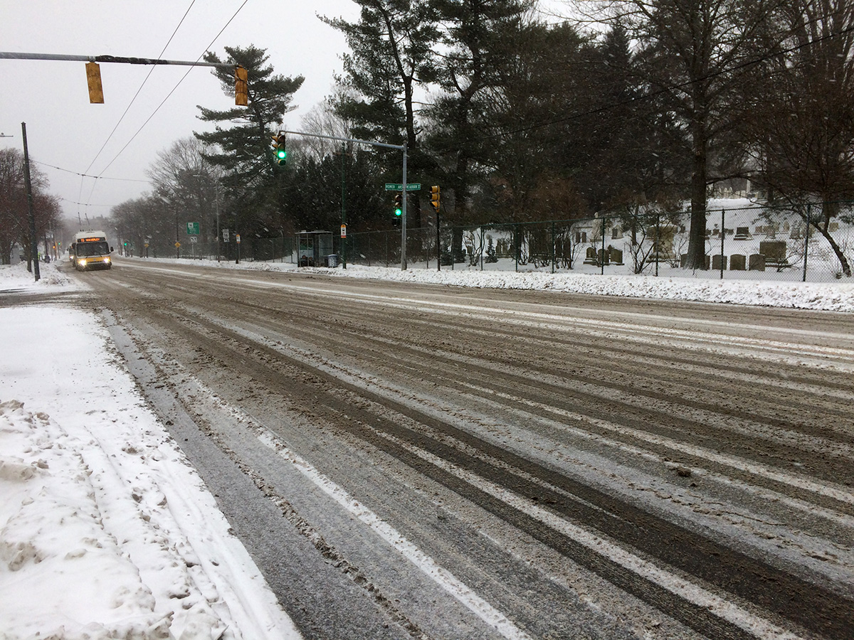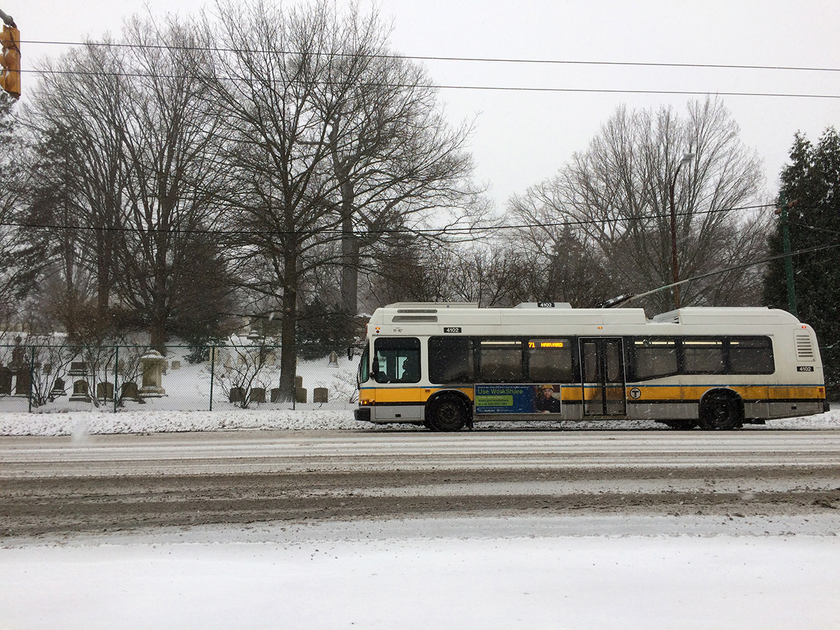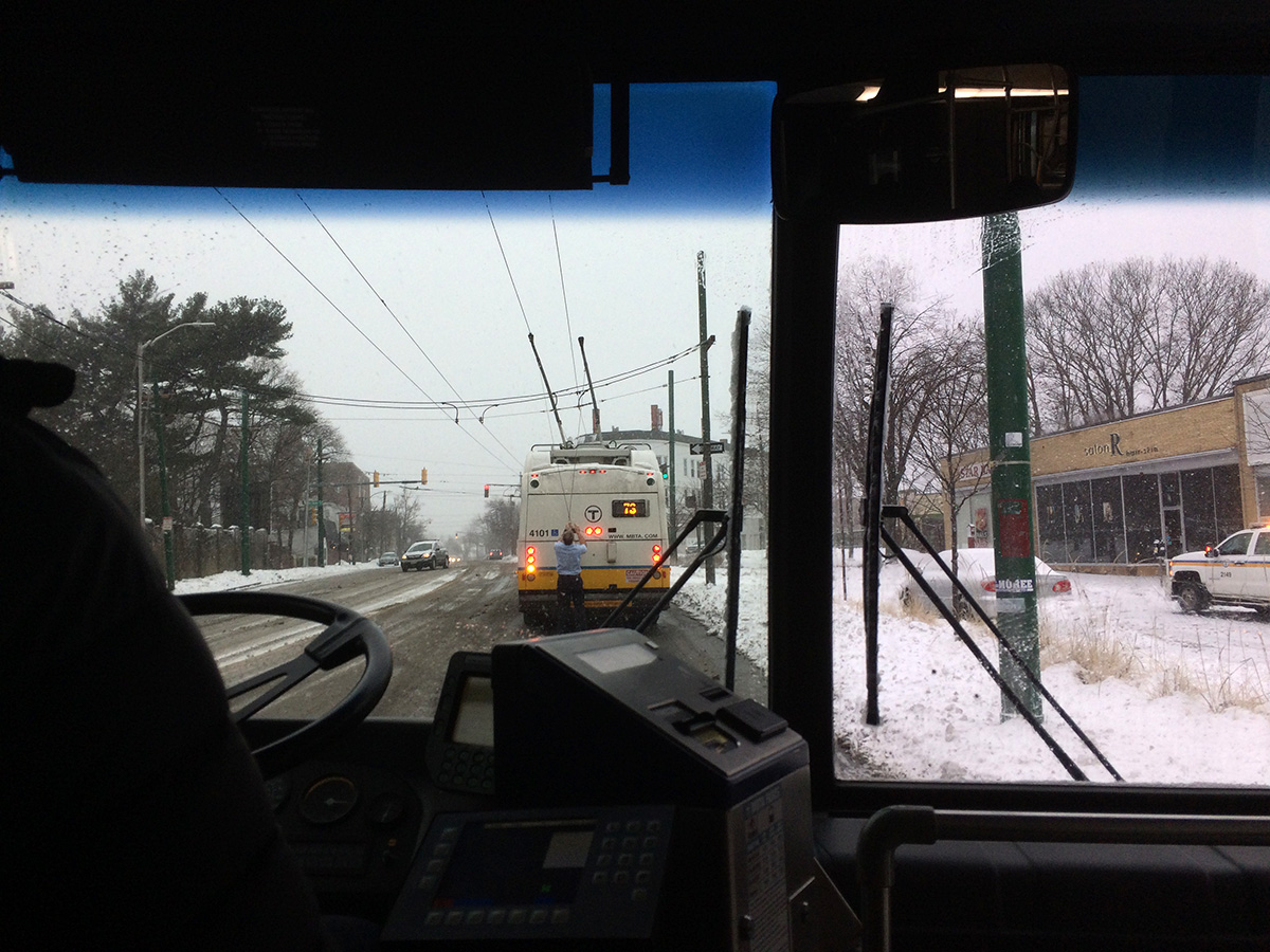 it took about 15 minutes for the next 73 bus to arrive. actually there was plenty of buses as the MBTA was still running a weekday schedule despite the blizzard conditions. there was actually two 73's and the first one pointed to the one behind him and kept on going. "what're you doing out here?" the driver asked me as i climbed onward the second bus. i told him i was going to my parents house to help shovel. i was the only passenger once again. we watched as the first bus came off its electrified railings and the driver had to get out and reattach the lines. little did we know the same thing happened to us as my driver had to get out and do the same. there must've been an malfunction on the wires because there was an MBTA car parked nearby to assist. after that it was smooth sailings. it felt like my own private bus and i was getting chauffeured to my destination. say what you will about our terrible new england winters, but bad weather tends to bring people together.