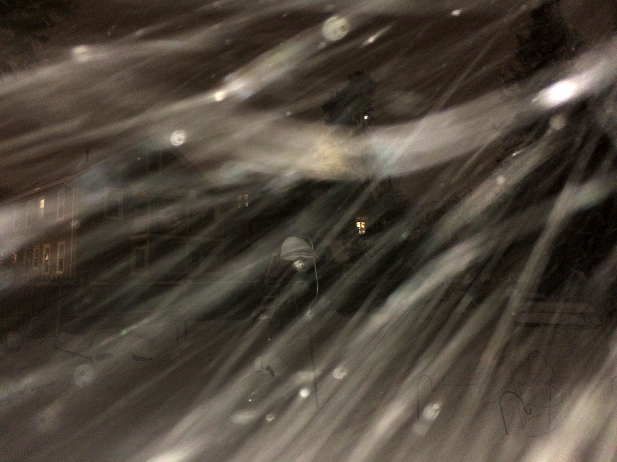 at 7pm my father and i went out to do another round of shoveling. under blizzard conditions, not only was the snow still falling at a quick rate, but the strong winds seemed to be blowing from every direction. we were hoping to clean up here and leave for the cafe close to 8pm with the storm hopefully tapering off. a lot of other neighbors were out shoveling as well, all with snow blowers. the problem with machines was what you blew away had a nasty habit of blowing all back in your face because of the winds.