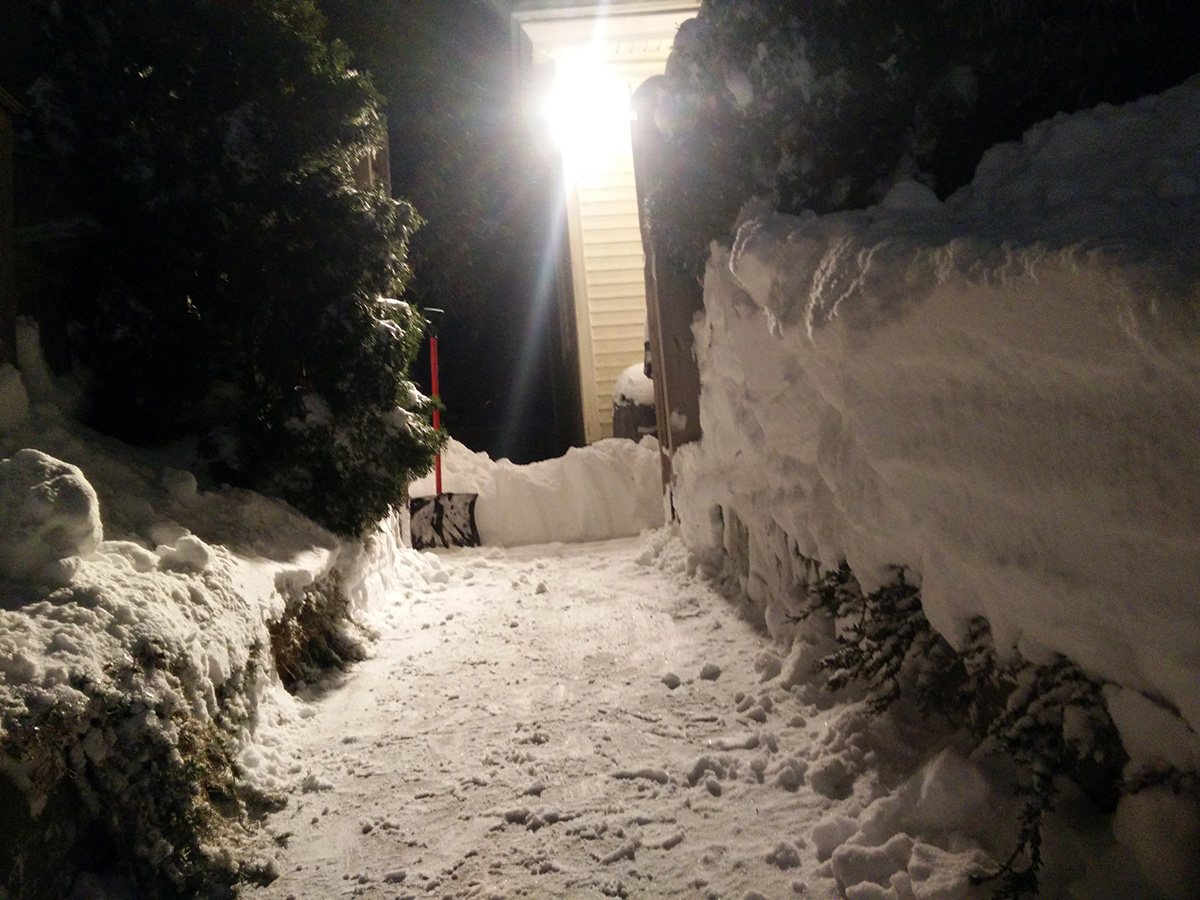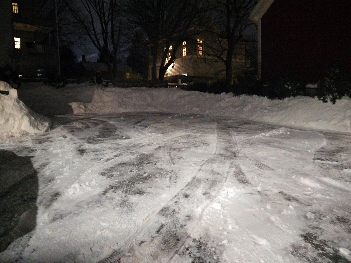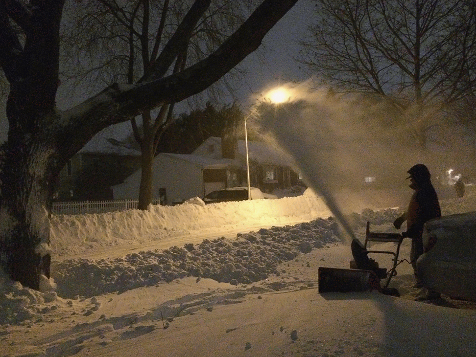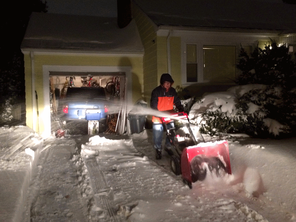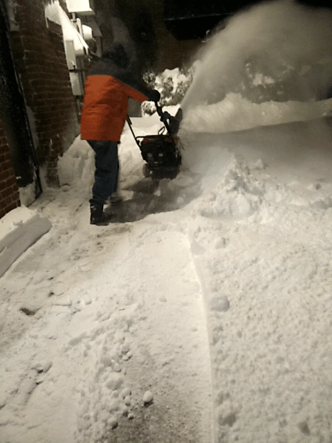 around noontime he went out to work, while simultaneously i started to plow the belmont driveway so his car would have someplace to park when he came back. i tried to use the large snow plow but it was impossible to start, churning out smoke and the gasoline smell. i finally got it started after much swearing, adding a bit more fuel, and using a power cord to jumpstart the engine. by then my father had already came back. because the plow trucks pushed the snow up against the driveway there was no way to get through, so he temporarily parked on the road while he used the snow plower to clear the driveway and carve out an opening so he can pull in. while he did that, i hand-shoveled a path into the backyard to the ladder so i could see how much snow was falling on the roof.