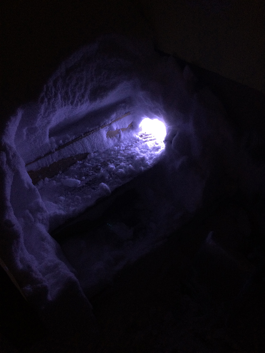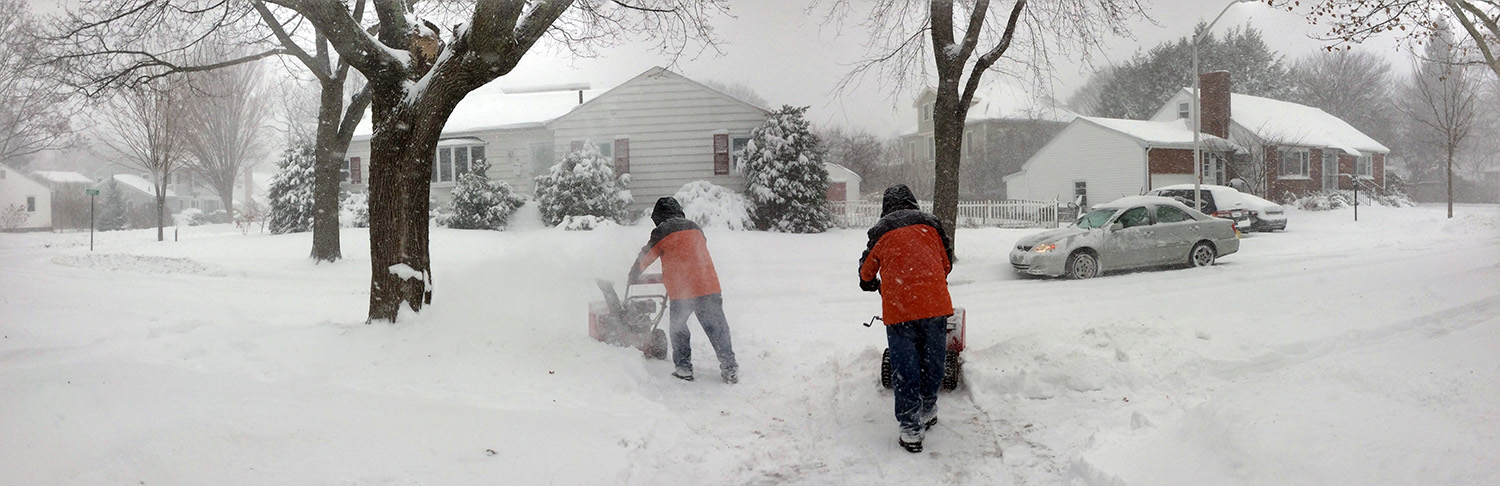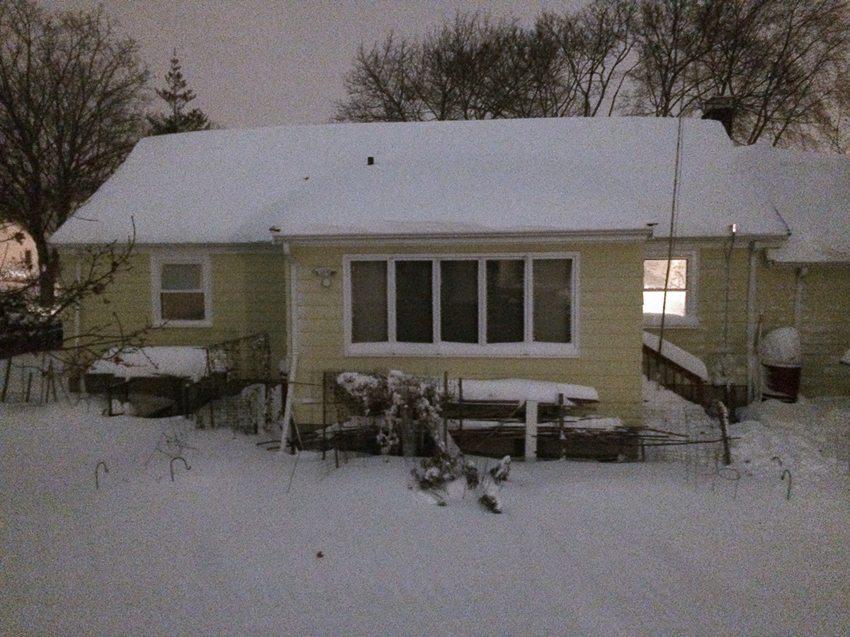 around noontime he went out to work, while simultaneously i started to plow the belmont driveway so his car would have someplace to park when he came back. i tried to use the large snow plow but it was impossible to start, churning out smoke and the gasoline smell. i finally got it started after much swearing, adding a bit more fuel, and using a power cord to jumpstart the engine. by then my father had already came back. because the plow trucks pushed the snow up against the driveway there was no way to get through, so he temporarily parked on the road while he used the snow plower to clear the driveway and carve out an opening so he can pull in. while he did that, i hand-shoveled a path into the backyard to the ladder so i could see how much snow was falling on the roof.