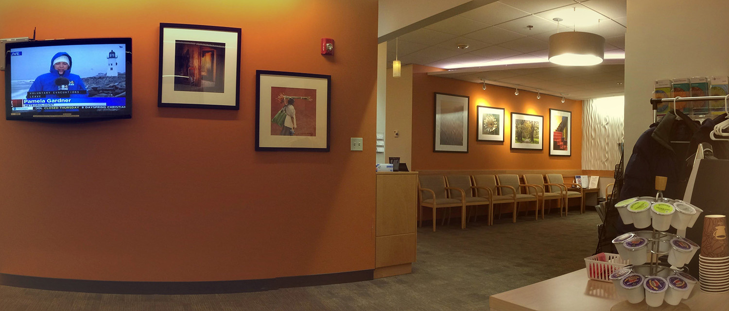 the last time i was here was 2 years ago, also in january. the receptionist was cranky, maybe would've preferred to stay at home. she took my information and i had a seat. there was one other person in the waiting room, an elderly man. i hung up my coat and made myself some tea with the complimentary keurig machine. there was a wall-mounted flatscreen TV turned to local channel 4 which was broadcasting weather news all day along with the other local channels.