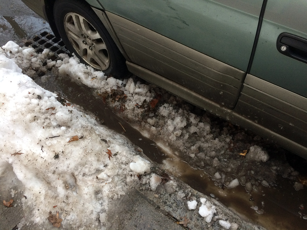 i went to star market to buy some apples on sale. coming back, i noticed an ice dam creating pools of dirty water along the curb by several parking spots outside my house. with a shovel and an ice chopper i broke apart the ice dam and watched the water drain away.