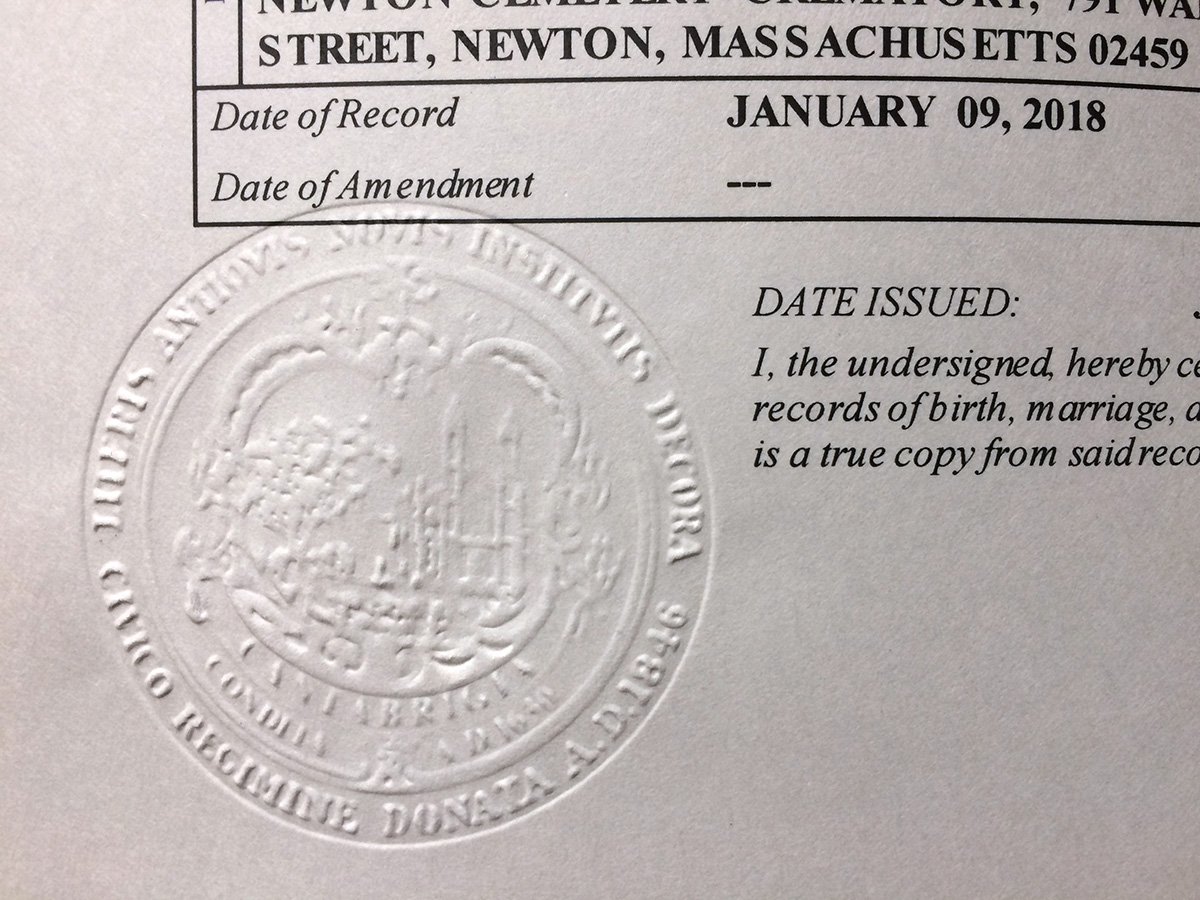 i was tasked with going down to cambridge city hall to get a copy of my grand uncle's death certificate so my father could have it as proof documentation to show the social security office. however when i woke up this morning it was raining, which i wasn't expecting until later in the evening. the forecast did say there would be a brief lull period in the every afternoon. so i waited until after noontime when the rain looked like it stopped, then biked down to central square to the city clerk's office. the whole process took about a minute. "can i help you?" a woman asked me from behind a desk. "i'm here for a death certificate," i said. "date of death?" she asked me, not bothering to get up. i told her. she didn't even ask me for my grand uncle's name so i added that without prompting. they don't check id's for death certificates because decease records are public. "how many copies?" she asked. i told her two. seconds later i heard their large printer firing up. "that will be $20," she told me. the printouts were on this grey color paper with the cambridge seal already embossed on the documents. i placed them in a manila folder and proceded to return home.