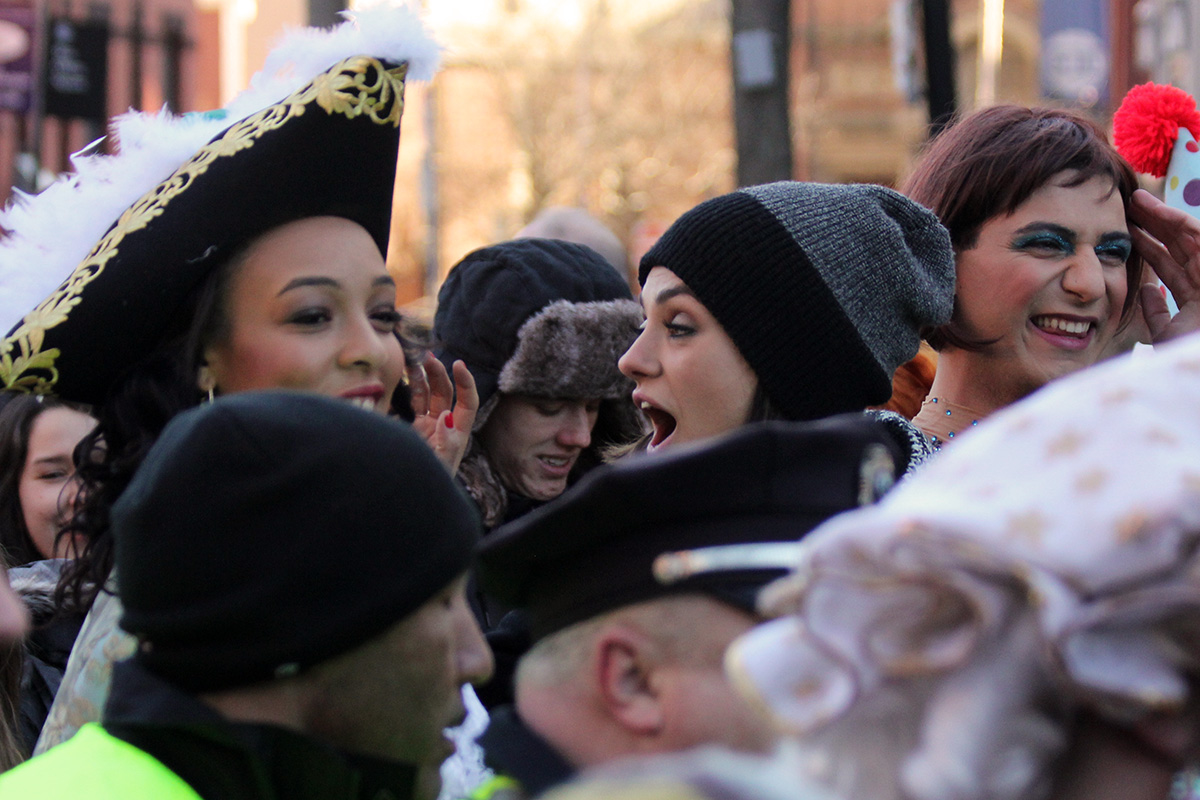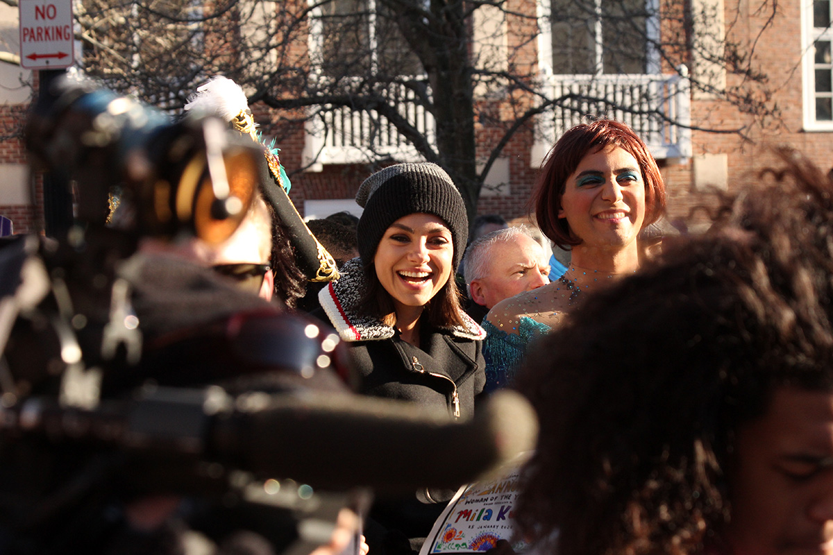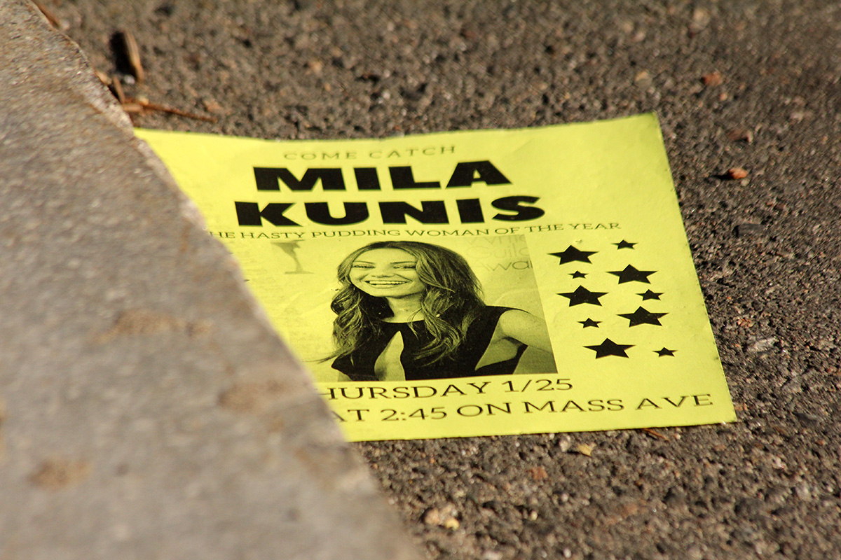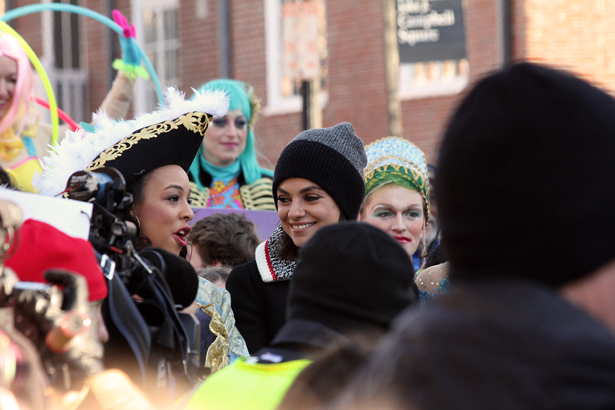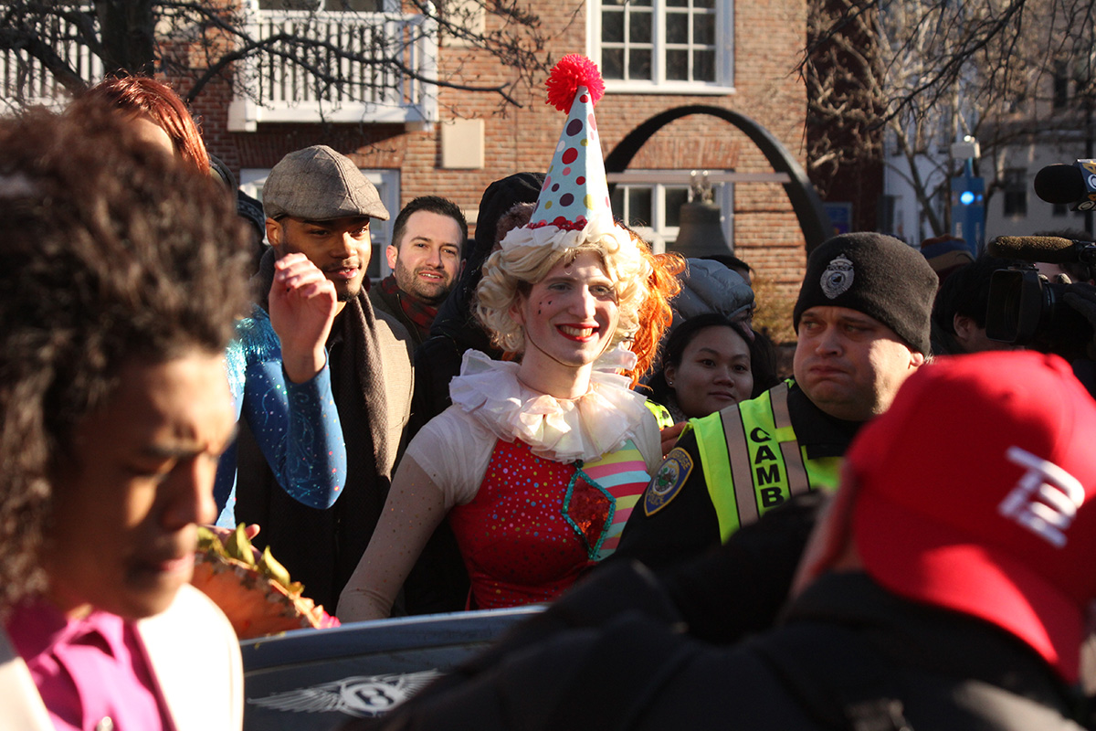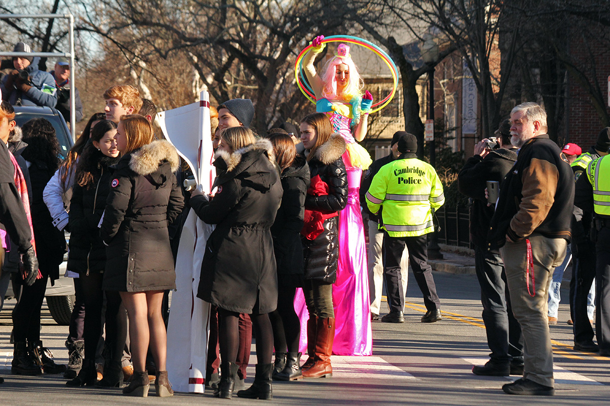 there was a hasty pudding parade happening in the afternoon (2:45pm) that i decided to check out. the honoree this year was mila kunis. i've seen the parade three times before (2009 renee zellweger, 2010 anne hathaway, 2013 marion cotillard), a short stretch of harvard square road with no good place to take photos without jostling for position. it was also a sunny day, which is great for solar but bad for photos because of the harsh contrast between light and shadow. i got a great spot that became less great as people started crowding around me. this year there was a hasty pudding protest, since the club doesn't allow women performers by tradition, and there were those asking for kunis to decline the award. later it was announced that the harvard club would begin allowing women to participate in front of the stage.