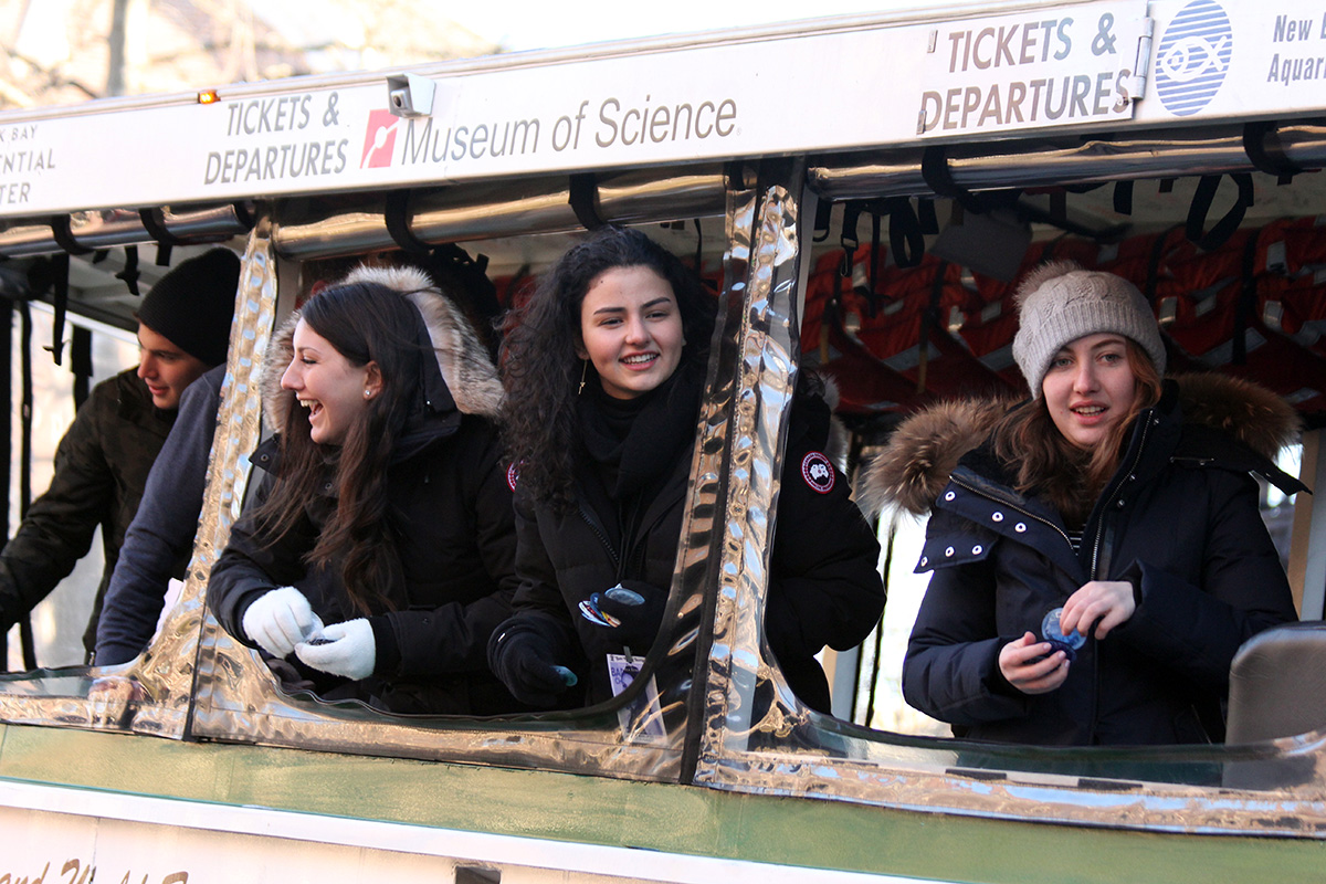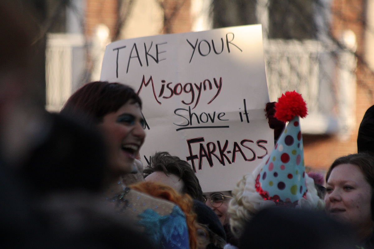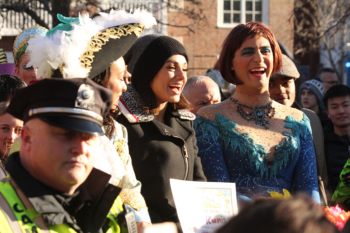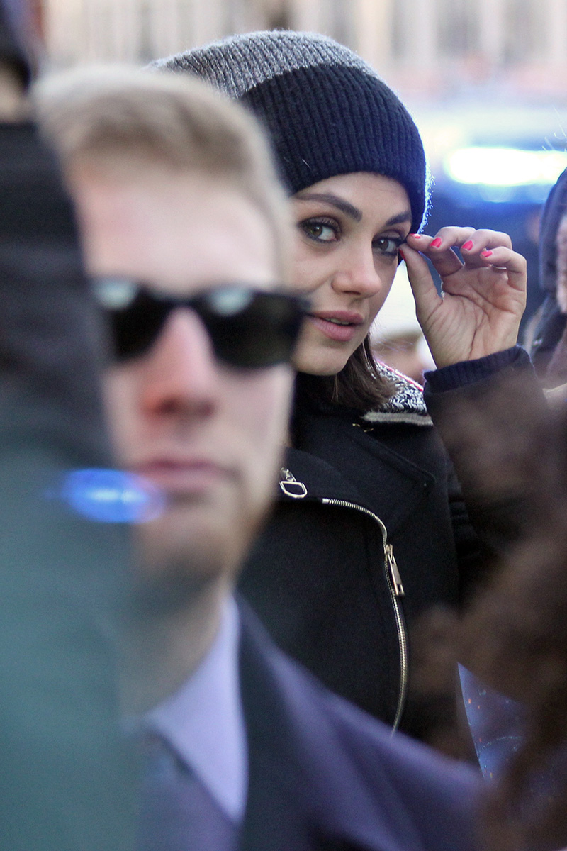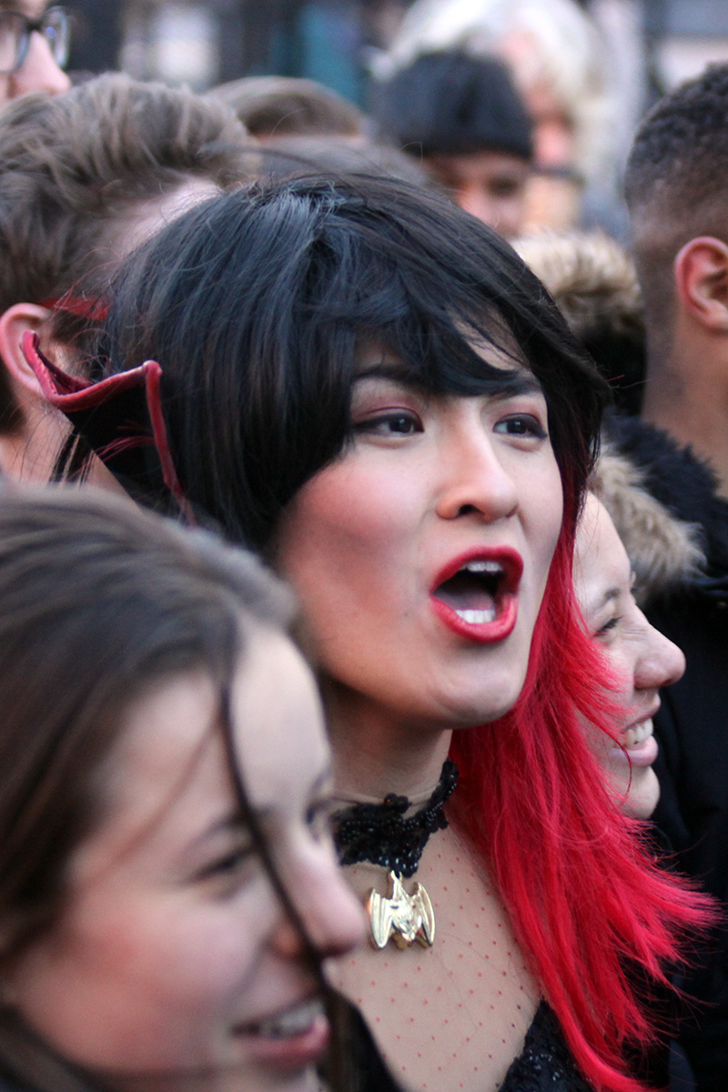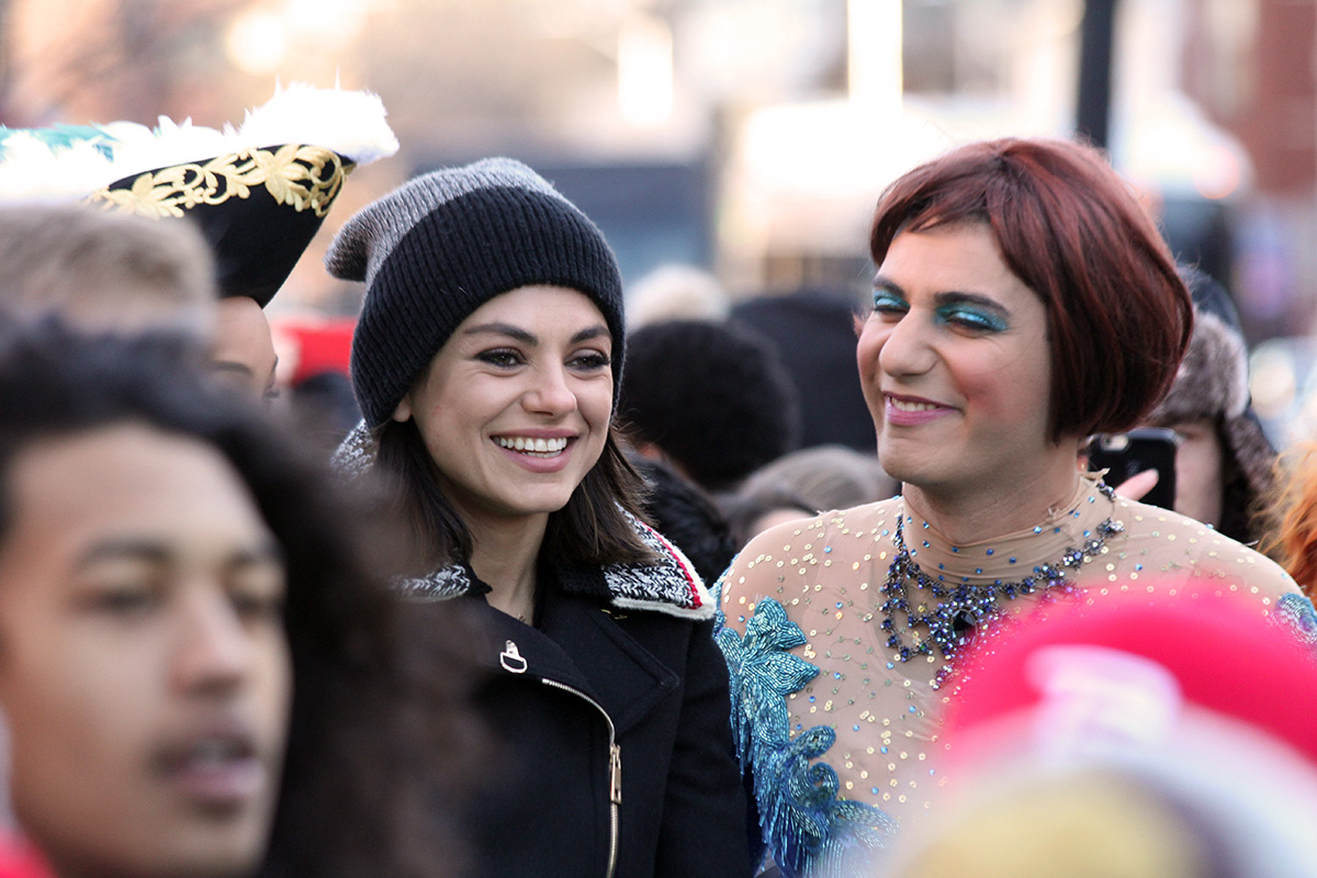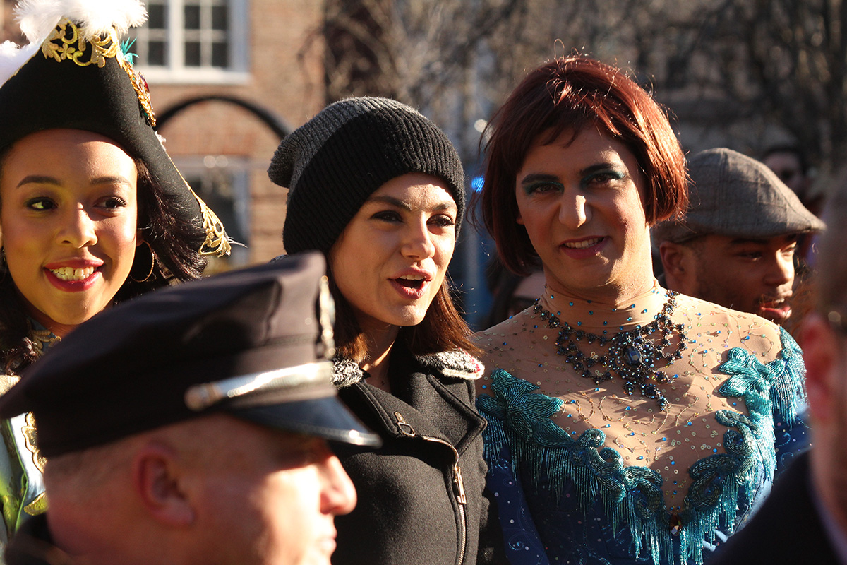there was a hasty pudding parade happening in the afternoon (2:45pm) that i decided to check out. the honoree this year was mila kunis. i've seen the parade three times before (2009 renee zellweger, 2010 anne hathaway, 2013 marion cotillard), a short stretch of harvard square road with no good place to take photos without jostling for position. it was also a sunny day, which is great for solar but bad for photos because of the harsh contrast between light and shadow. i got a great spot that became less great as people started crowding around me. this year there was a hasty pudding protest, since the club doesn't allow women performers by tradition, and there were those asking for kunis to decline the award. later it was announced that the harvard club would begin allowing women to participate in front of the stage.