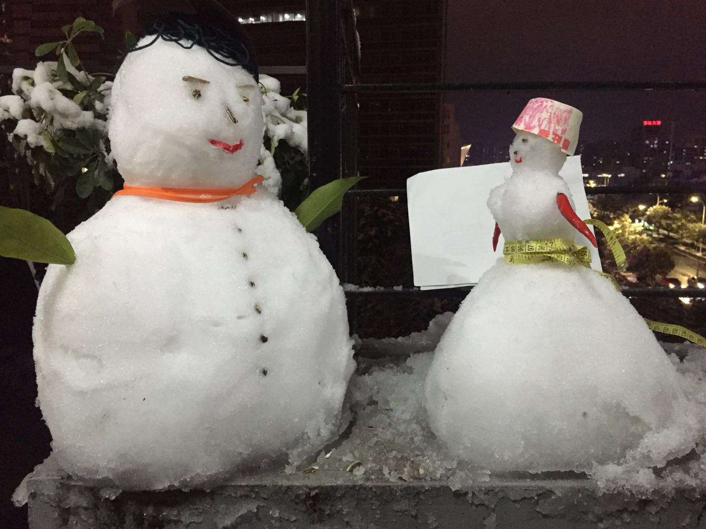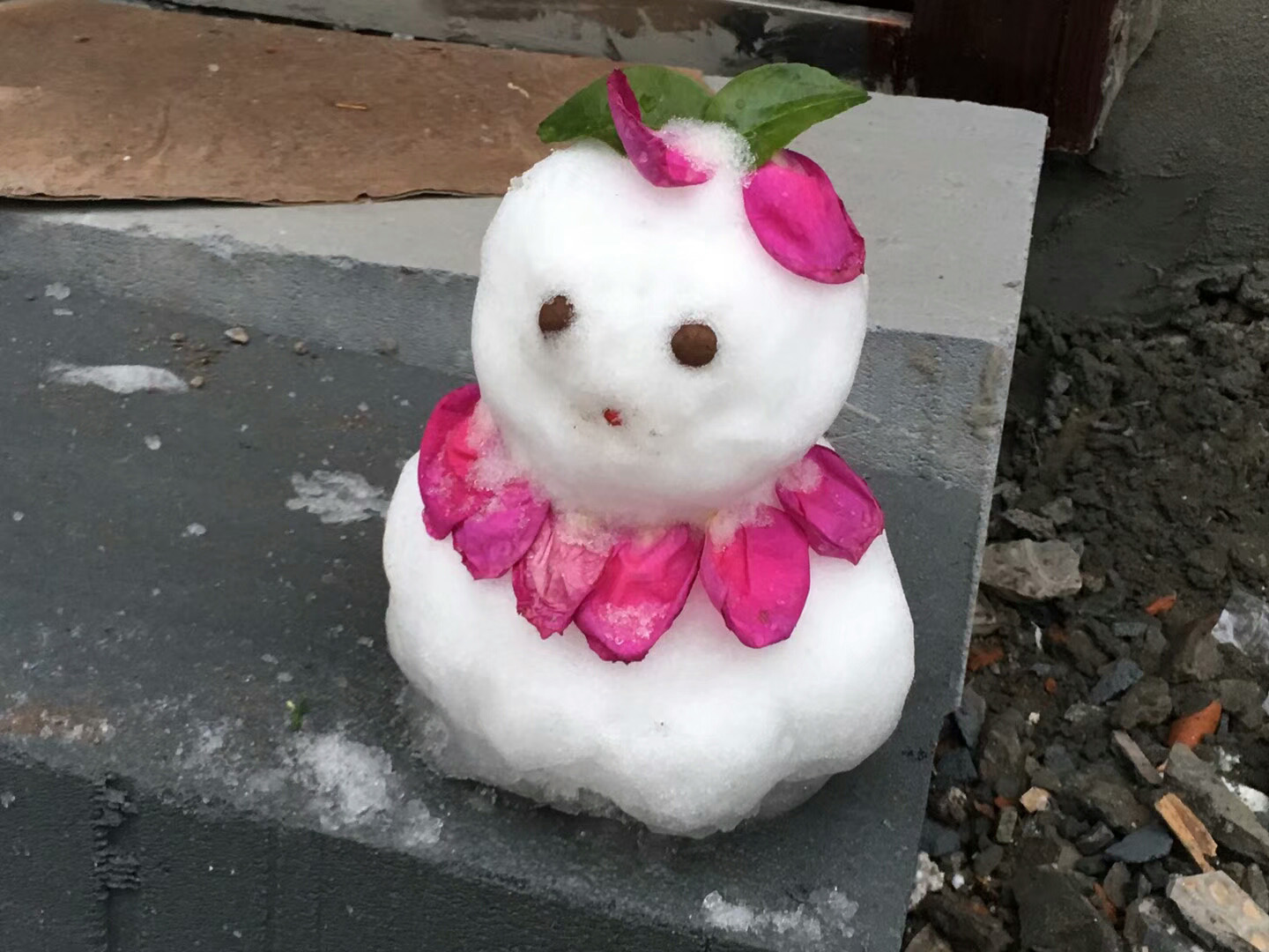 it must've snowed in shanghai a few days ago because i was seeing a lot of snow photos on qq and wechat. it doesn't snow very often there, and almost never enough to play with, but enough fell that i saw a lot of creative snowmen. unlike the snowmen we build here, they were all fairly small, but people got very creative decorating them with sticks and food and flower petals.