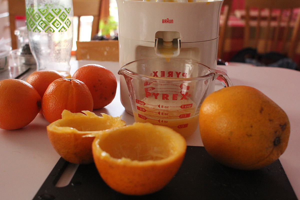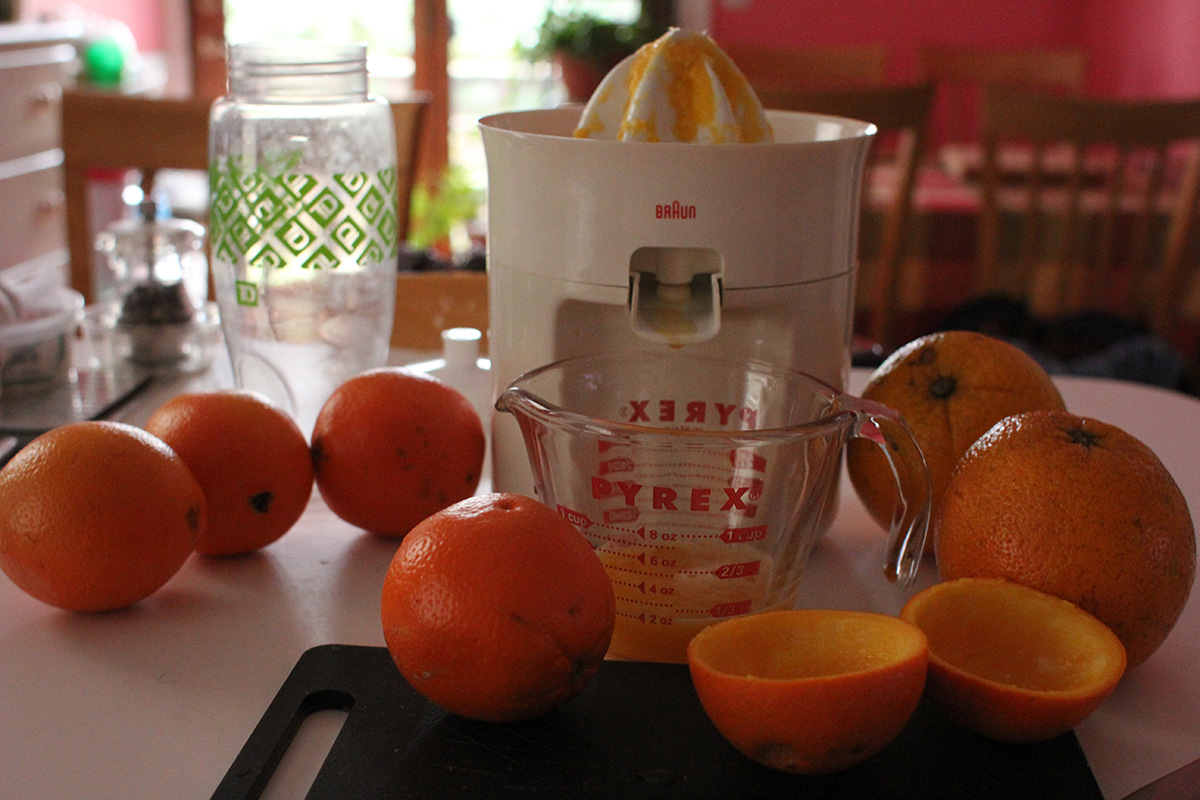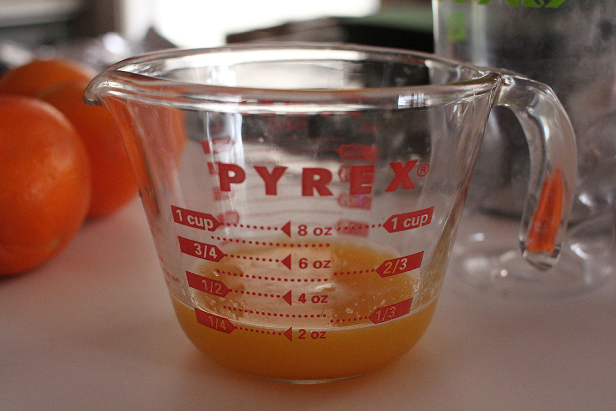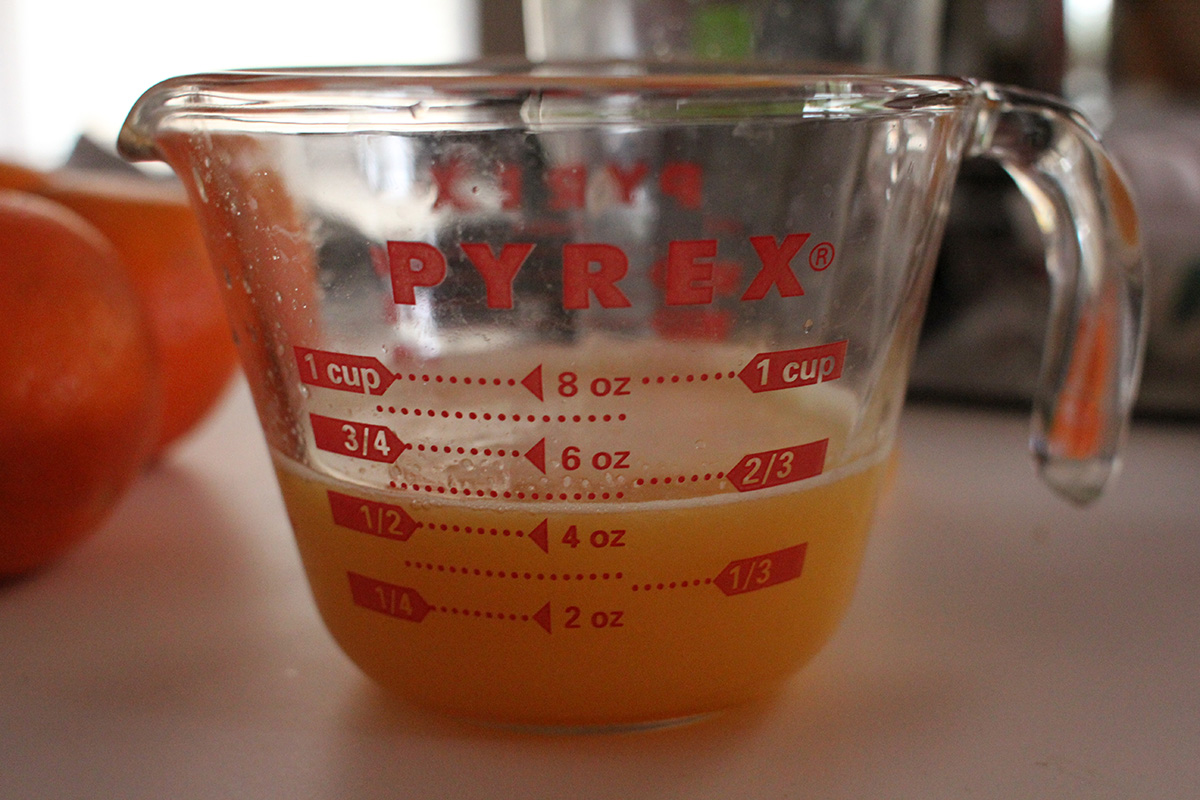 i squeezed some more fresh orange juice this morning, measured the amount of juice i got between the large and small navel oranges. the small ones gave me 2-3 ounces, while the large one gave me 5 ounces. next weekend at haymarket i should just focus on large oranges since they're a better bargain in terms of juice production. after squeezing 5 smalls and 1 large, i ended up with about 18 oz. of fresh orange juice.