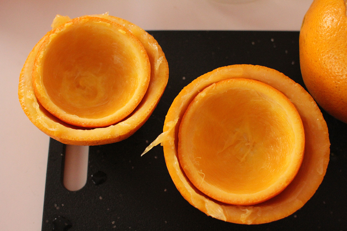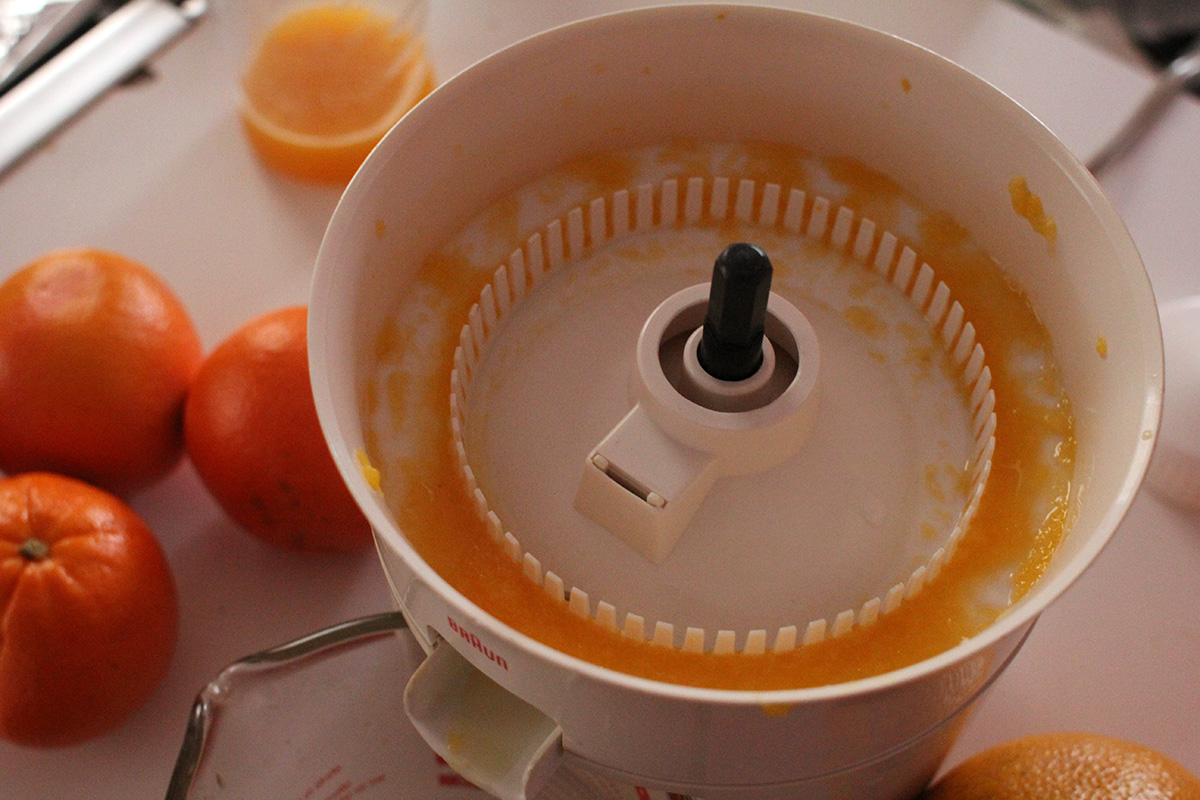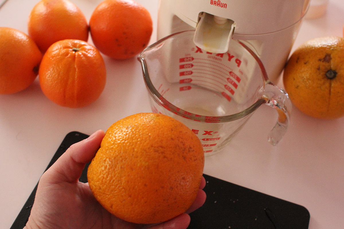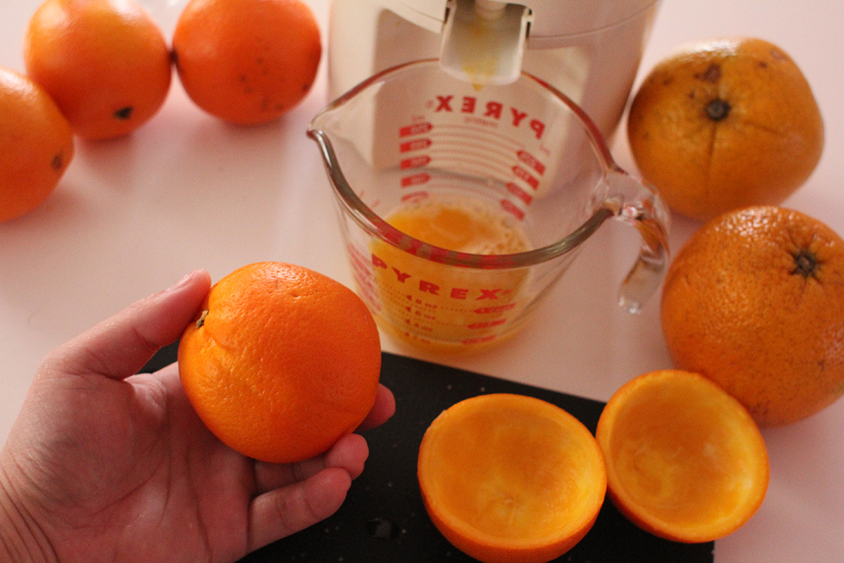 i squeezed some more fresh orange juice this morning, measured the amount of juice i got between the large and small navel oranges. the small ones gave me 2-3 ounces, while the large one gave me 5 ounces. next weekend at haymarket i should just focus on large oranges since they're a better bargain in terms of juice production. after squeezing 5 smalls and 1 large, i ended up with about 18 oz. of fresh orange juice.