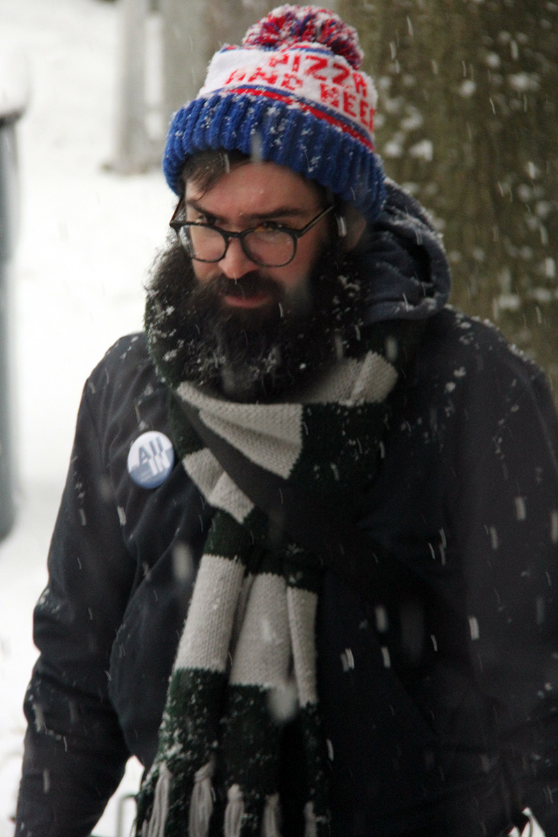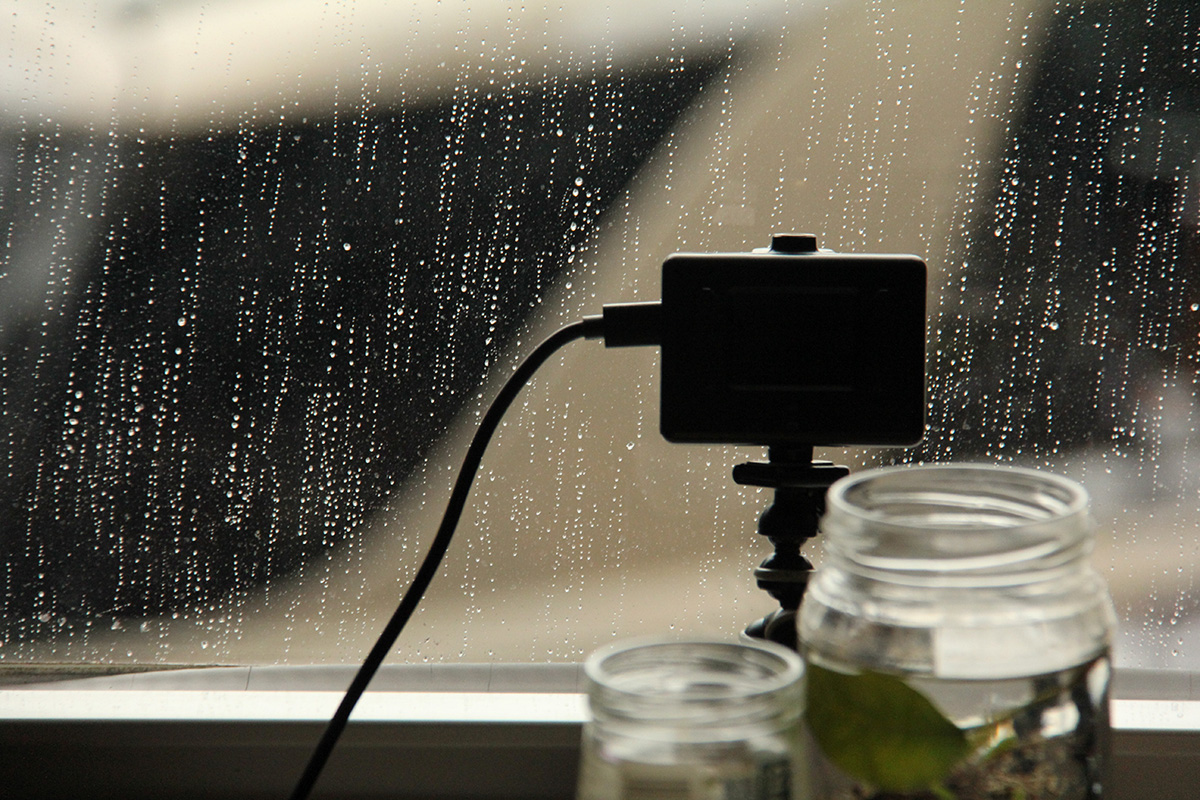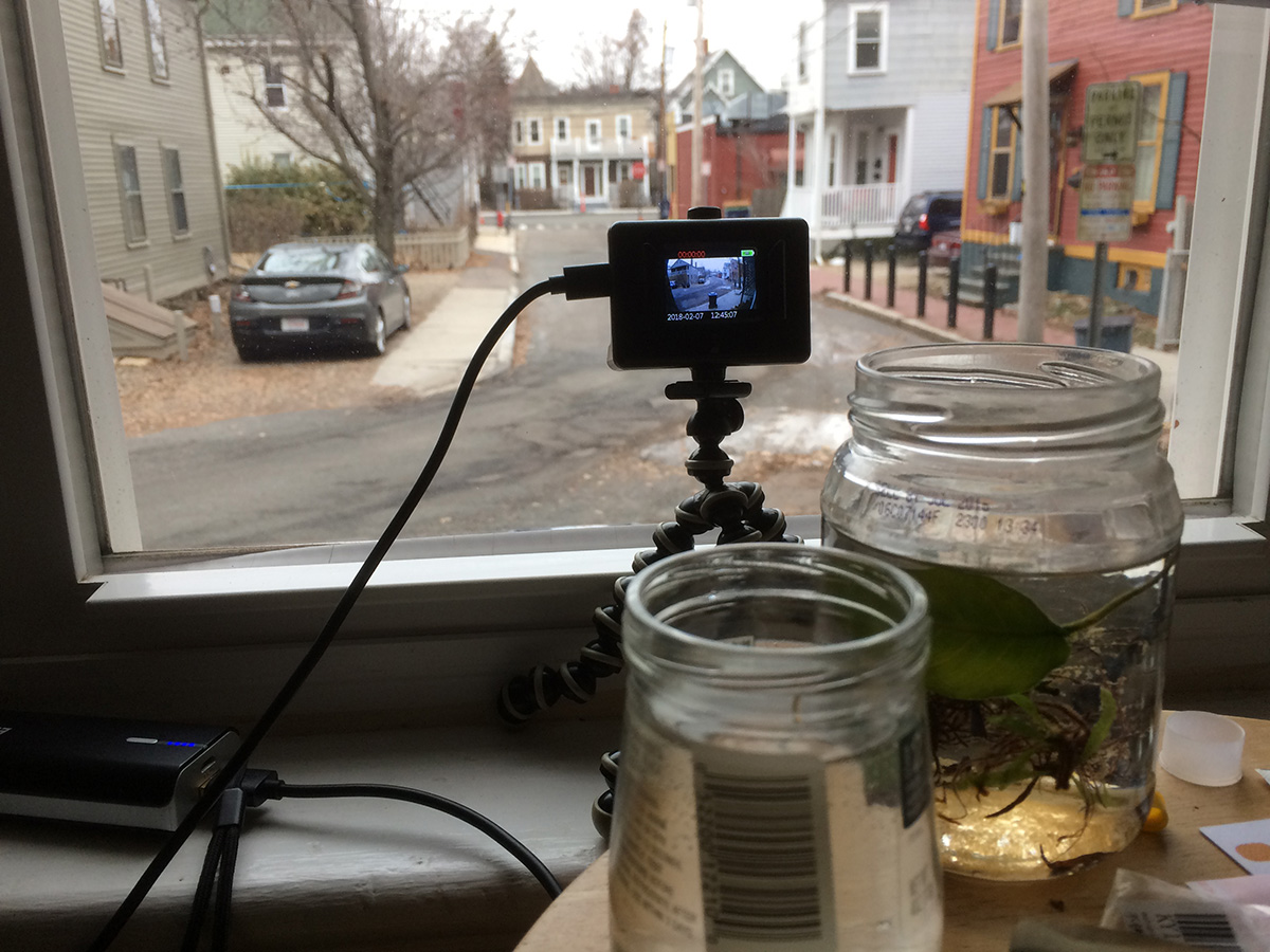 close to 11am it finally began to snow. not some small flurry but a steady snowfall, making everything outside look like it was viewed through a static filter. i set up the action camera to take a time lapse video.