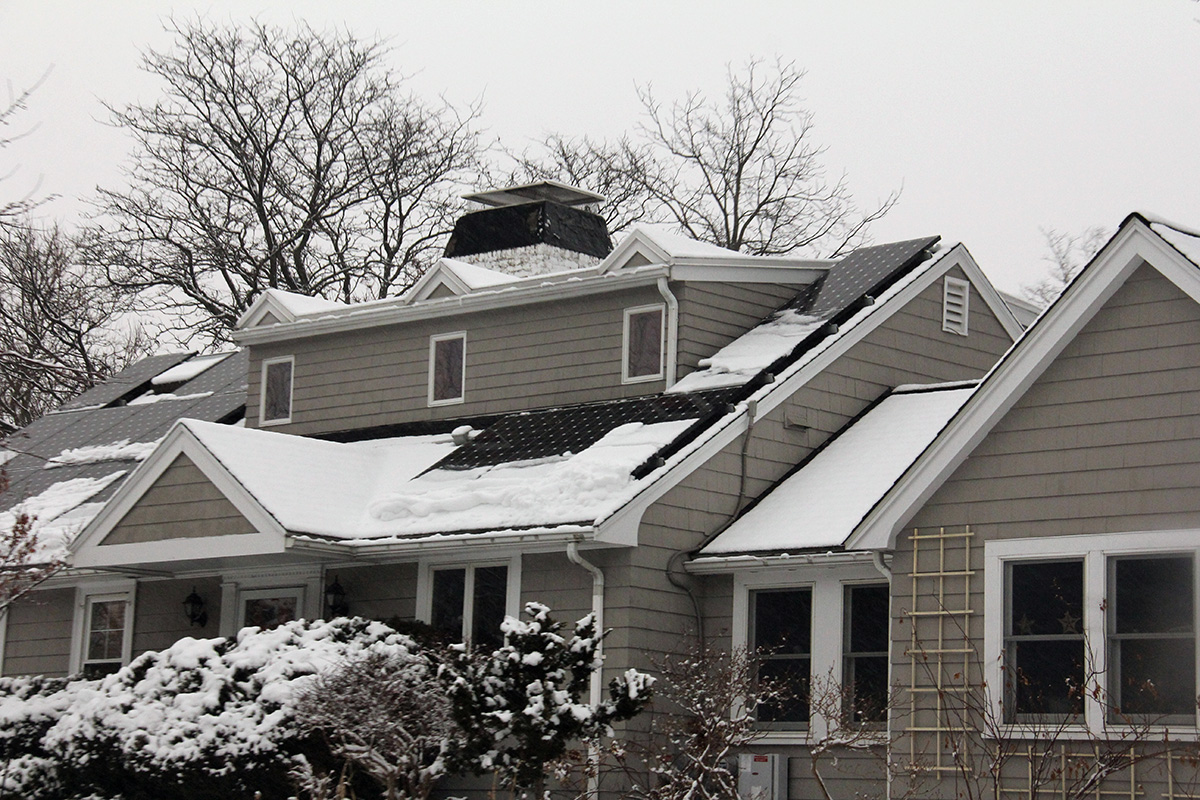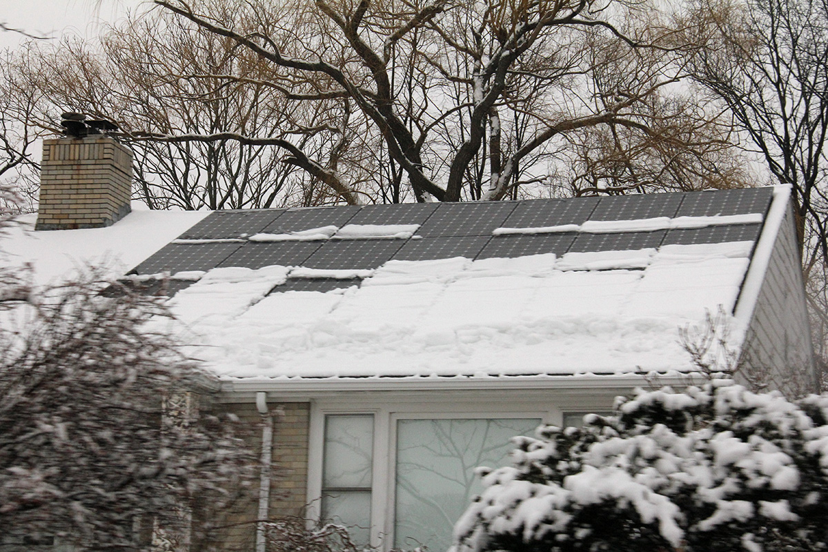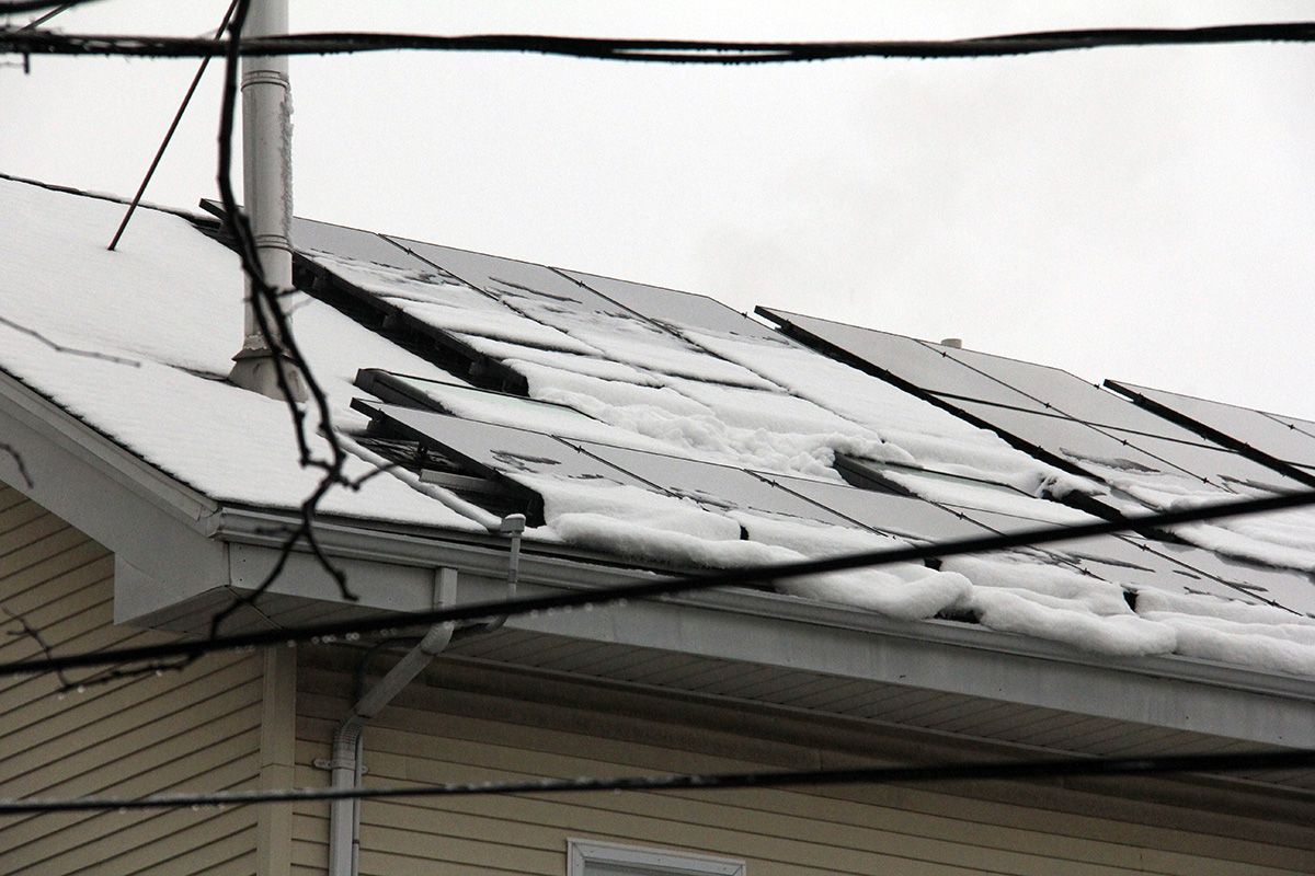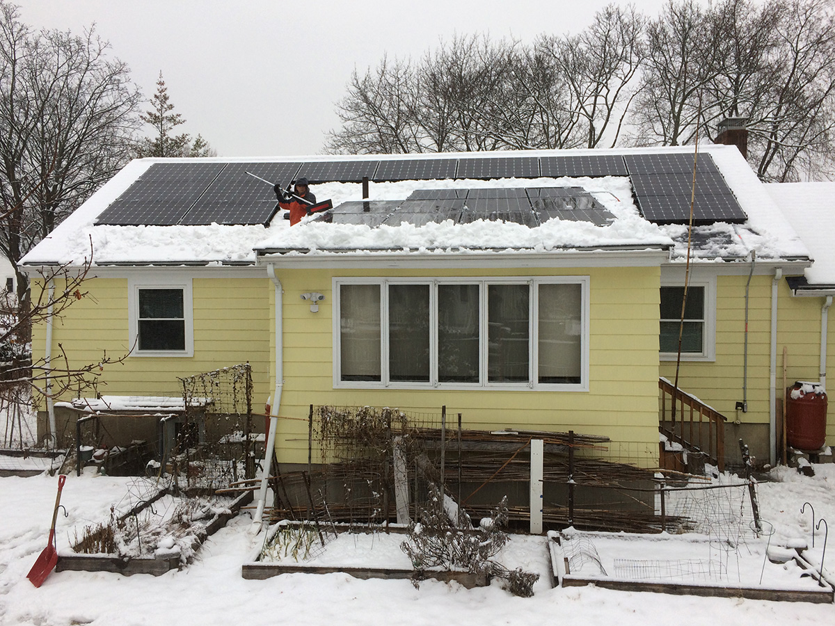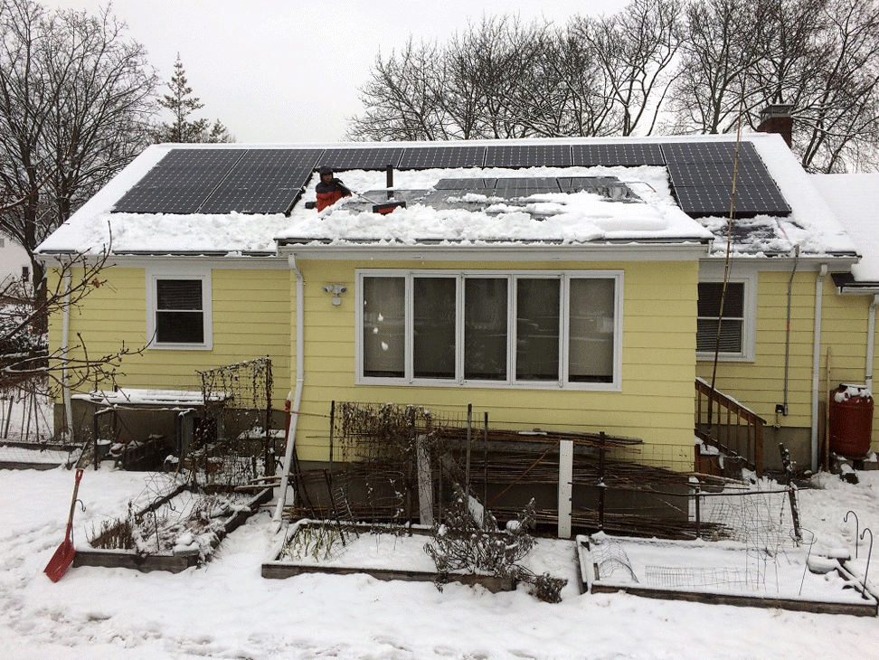 since we discovered last time that one person along with a ladder can clean the panels without needing to climb on top of the roof, my father was in charge of cleaning while i went to the front of the house to shovel the driveway and sidewalk. i managed to work up a sweat, on top of my jacket and clothes, which by then were rain-soaked. my father had cleared most of the panels, first working from one side then the other. greased by the rain, the snow slid off the panels easily, just needed some extra push to clear the downslope clumping.