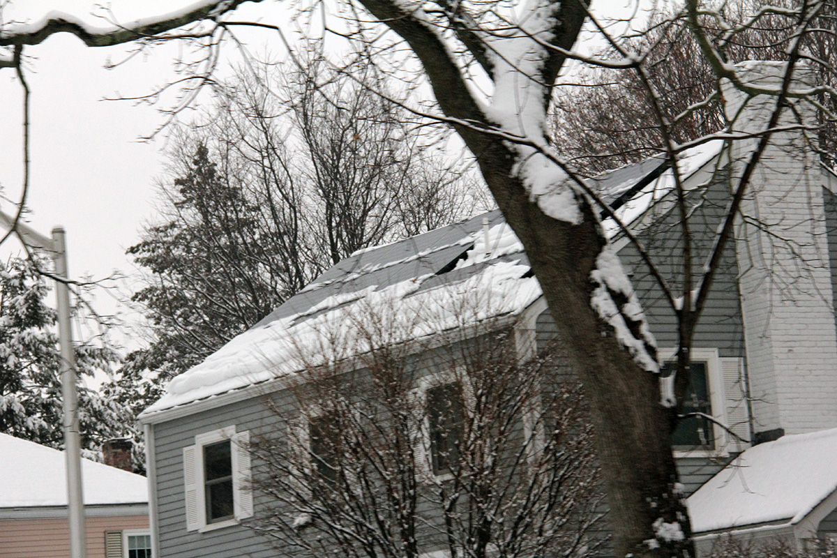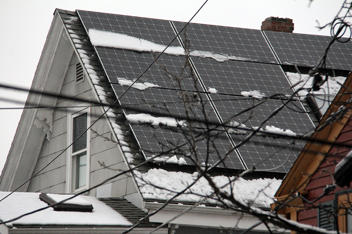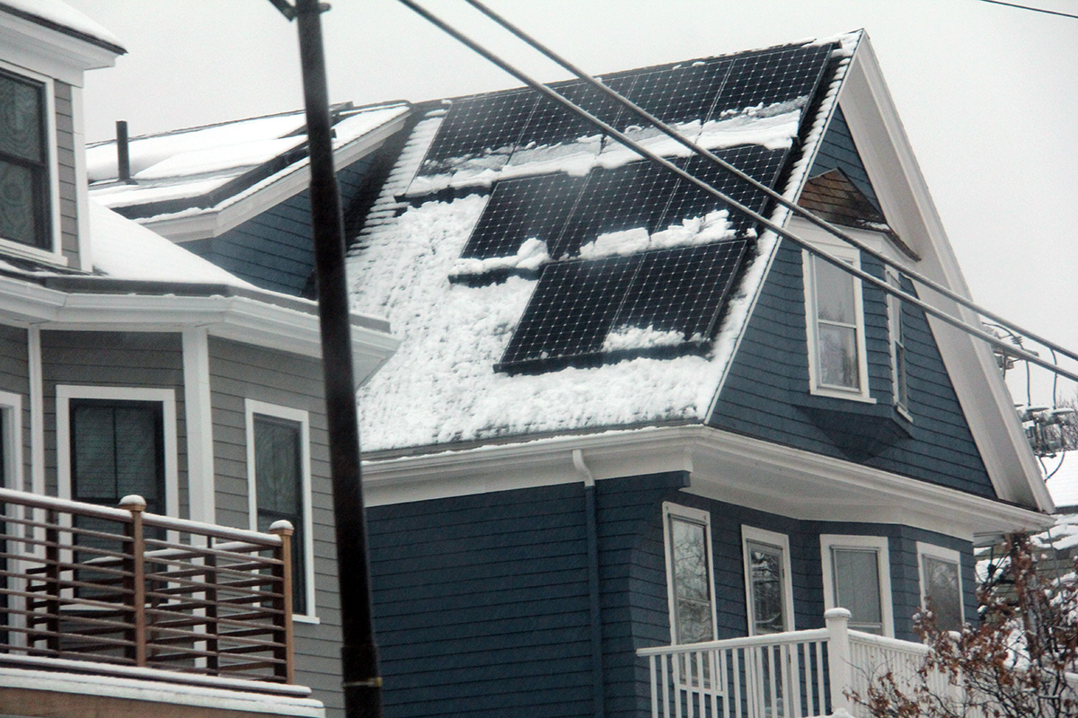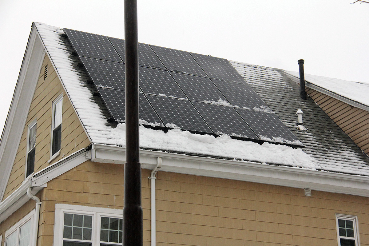 since we discovered last time that one person along with a ladder can clean the panels without needing to climb on top of the roof, my father was in charge of cleaning while i went to the front of the house to shovel the driveway and sidewalk. i managed to work up a sweat, on top of my jacket and clothes, which by then were rain-soaked. my father had cleared most of the panels, first working from one side then the other. greased by the rain, the snow slid off the panels easily, just needed some extra push to clear the downslope clumping.