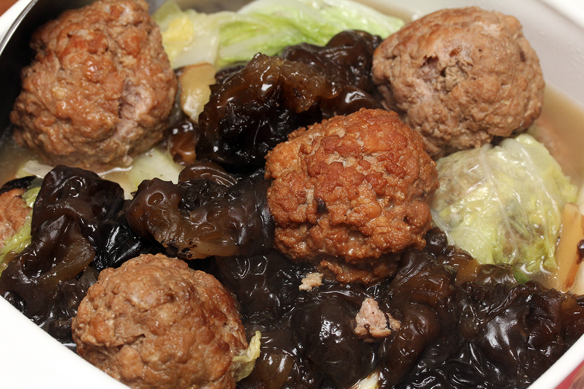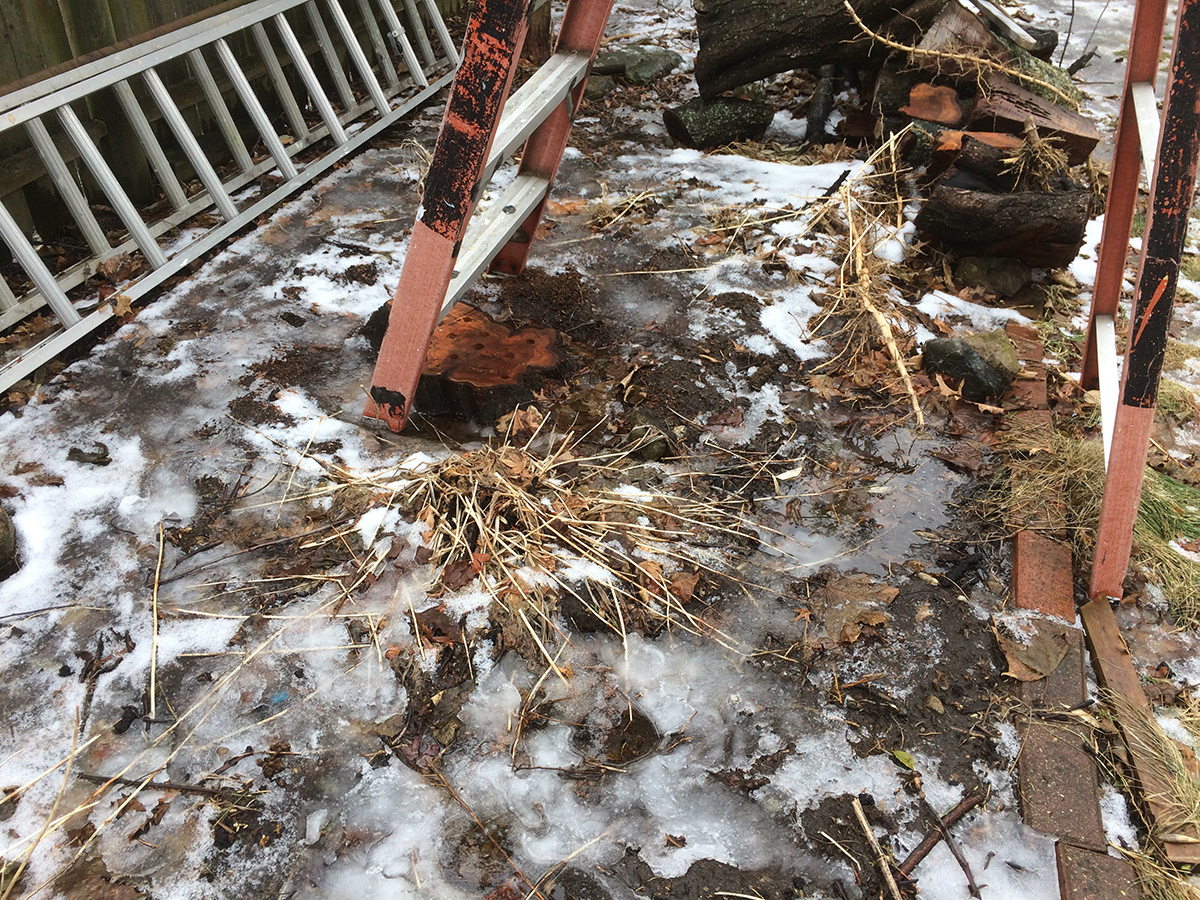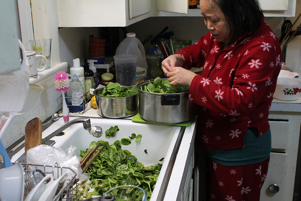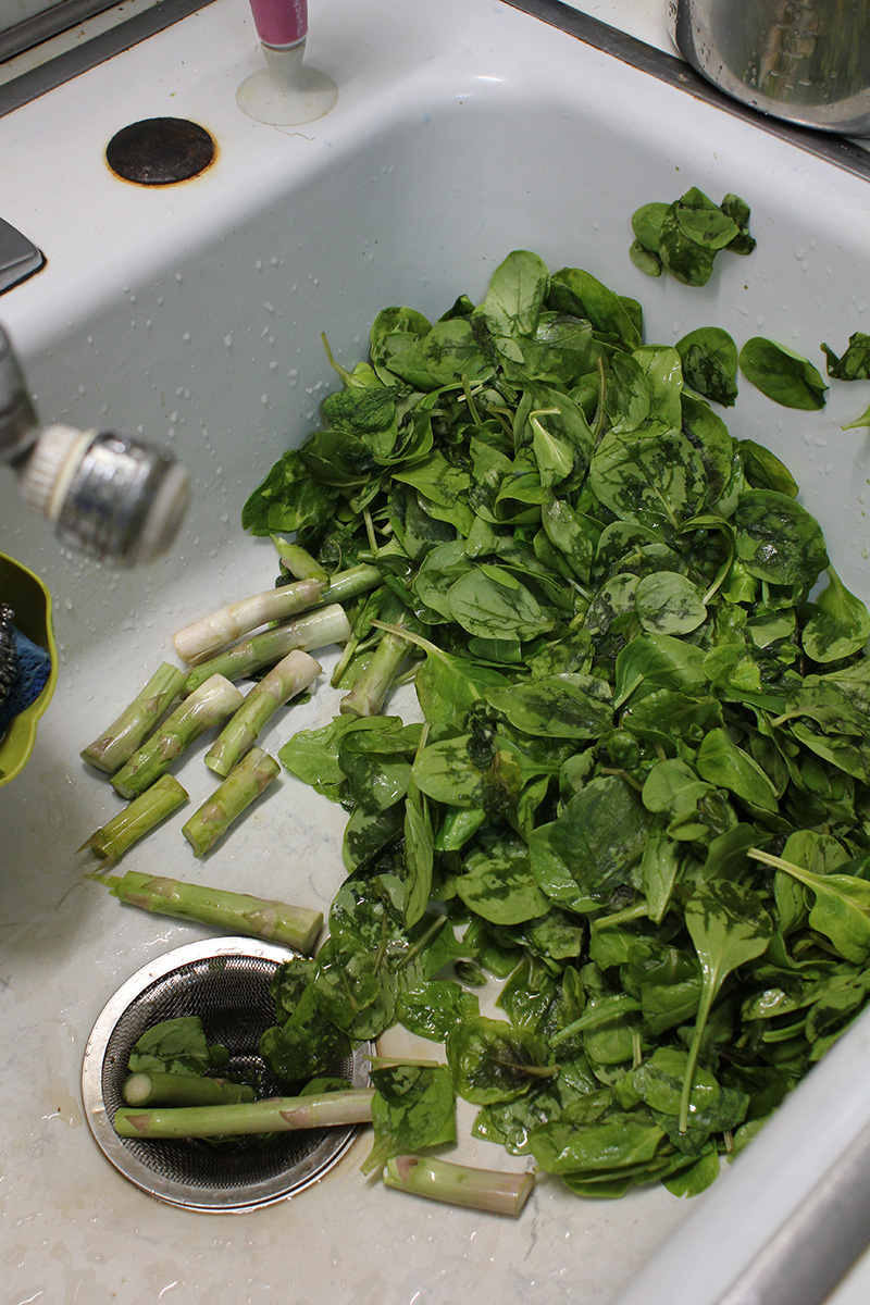 my mother had also been simmering some chinese lion's head meatballs all day long (i could smell it when i came into the house). when she went to prepare the spinach i'd bought, she told me that nearly half of it had gone bad, whether through expiration or freeze damage i don't know. she spent some time picking through the whole bag, tossing out all the bad spinach. i thought it'd be a waste to toss it all out so i took the bad spinach and added it to the backyard compost pile, which normally just gets leaves and grass clippings, hardly any kitchen scraps.