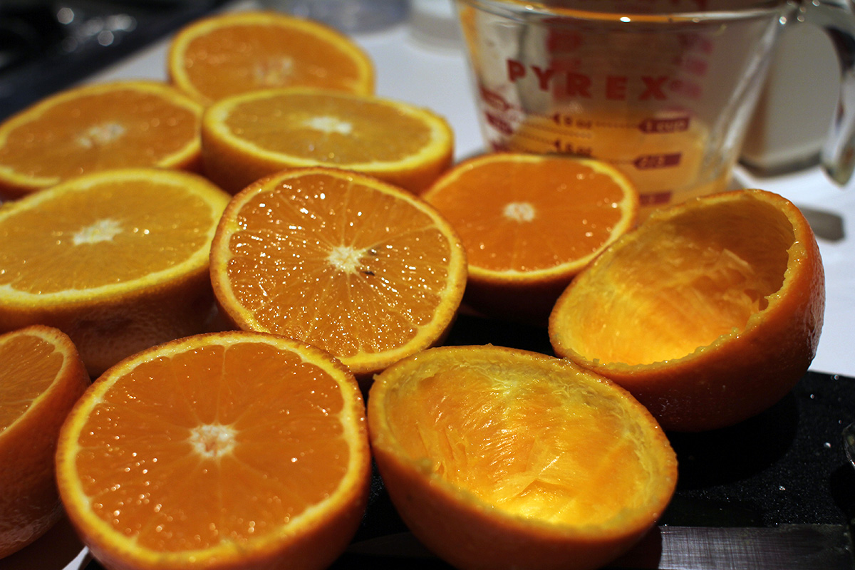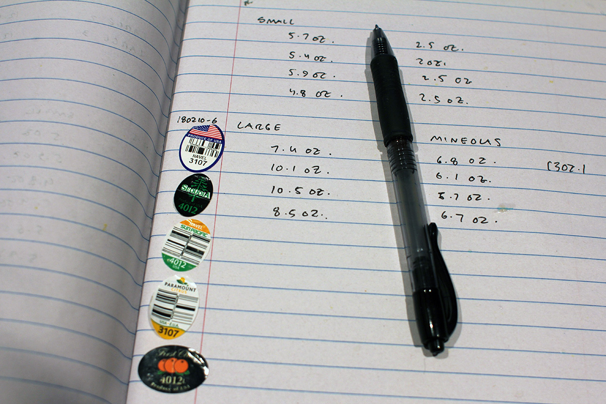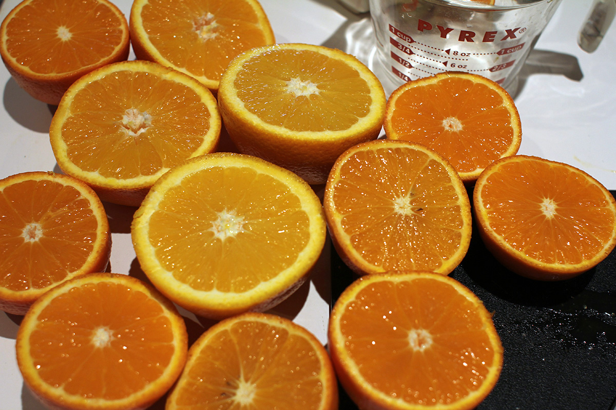 it took me 24 minutes to ride home, by then it was 12:40pm. i squeezed some fresh orange juice using 2 medium navels and 4 minneolas. the navels ranged in weight from 7-10 oz., while the minneolas averaged 6-7 oz. the navels had a nice fragrance about them, the minneolas i couldn't smell anything. the minneolas were harder though, and a very shiny waxy skin. sliced open, the navels were a light orange while the minneolas were a darker orange. the navels had a nice smell to them sliced open, the minneolas nothing discernable. navel juice was sweet but diluted. minneola juice was sweet but also tart. in fact, when i was squeezing the minneola oranges, they smelled more like lime than orange. i was afraid this latest batch of fresh OJ would be too tart, but my mother will be the judge of that.