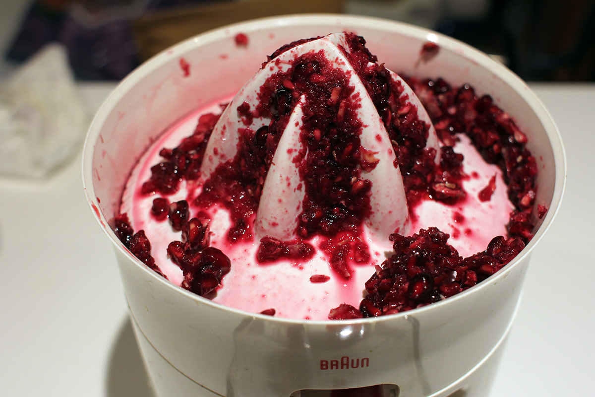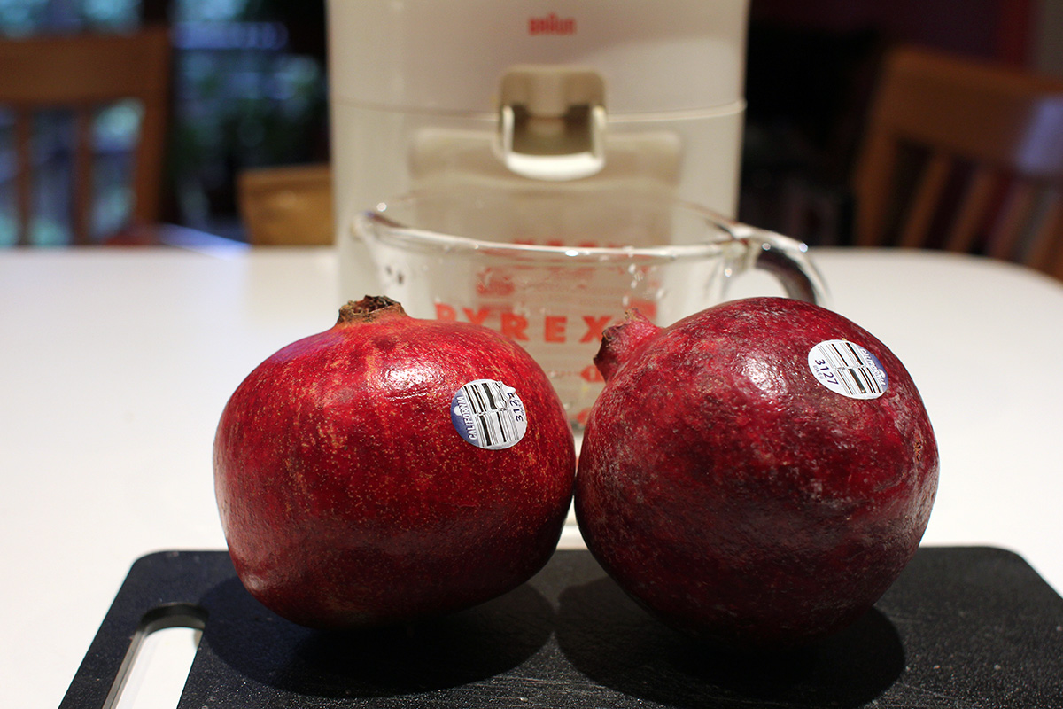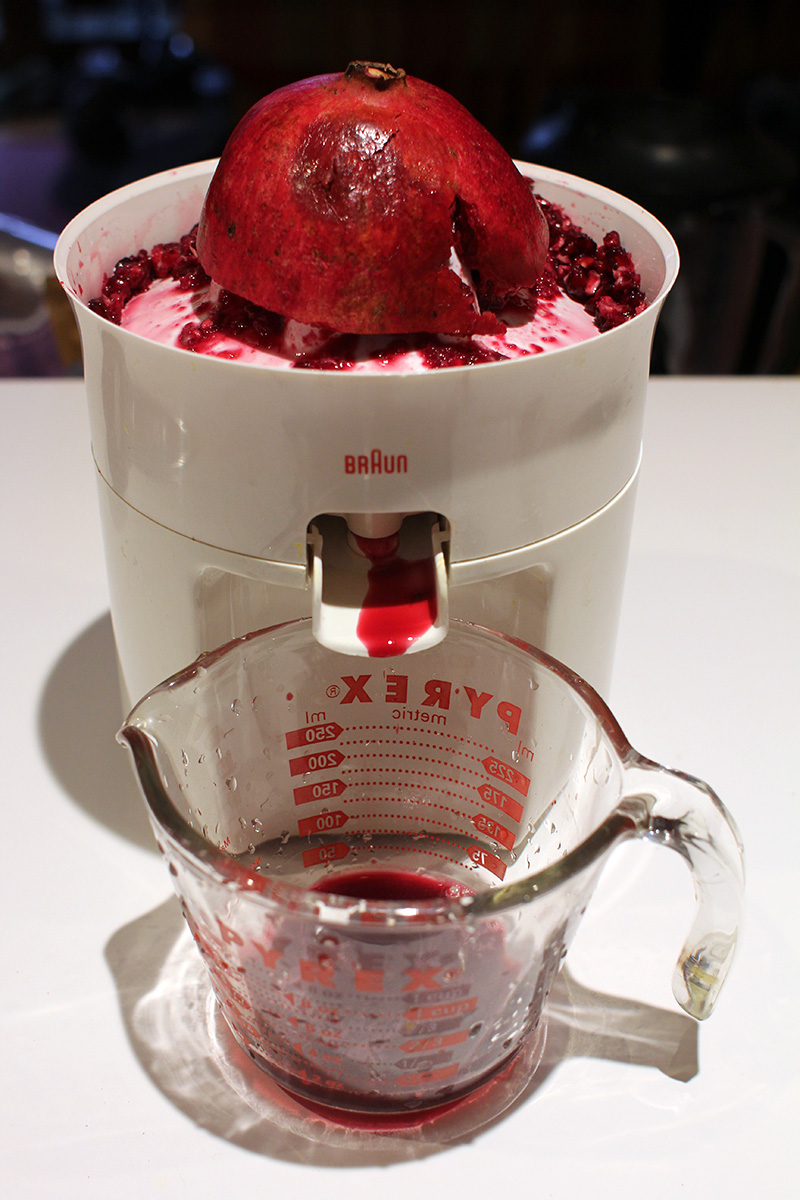 looking to try something different, i decided to juice some pomegranates. i saw a video online which made it look easy, but even before i began, i knew it could be a potential nightmare. pomegranate juice stain is nearly impossible to remove. so i wore only dark clothes and even put on an apron. i then sliced 2 pomegranates in half. although pomegranates are juicy and make a fine juice, the inside of a pomegranate is completely different than an orange. an orange has a fleshy pulp that more or less stays in place during juicing; a pomegranate is all seeds inside that has a tendency to fall off and fly away. stray seeds are wasted since they can't be juiced anymore even though they still contain plenty of juice. worst of all, the juice stained the lip of the juicer and i only managed to clean most of it off using a magic eraser sponge. pomegranates are better for pressed juicers than spinning juicers. that's how they do in xi'an, where they grow a lot of pomegranates, they use a pneumatic press to extract the juice. i did the best i could with my equipment and only got 6-8 oz. of juice, which i managed to find a small glass sauce bottle to keep it in. i also squeezed a fresh container of orange juice.