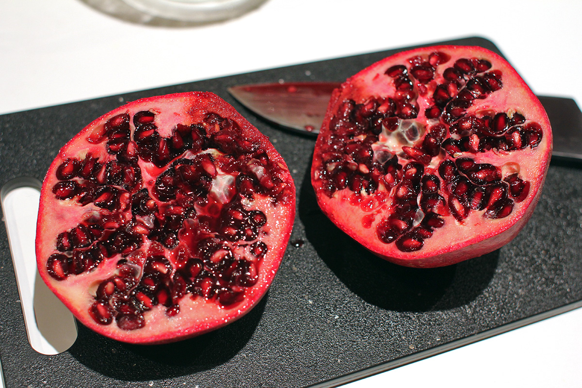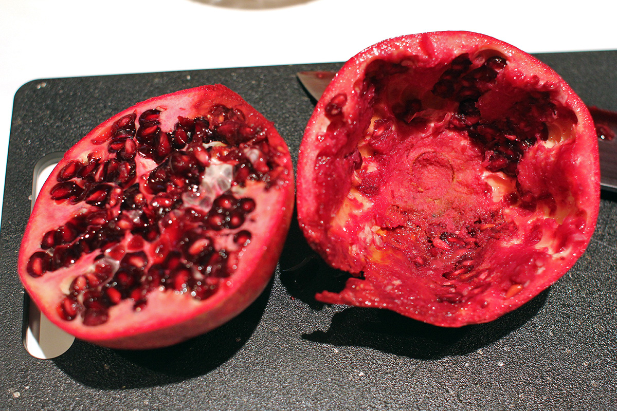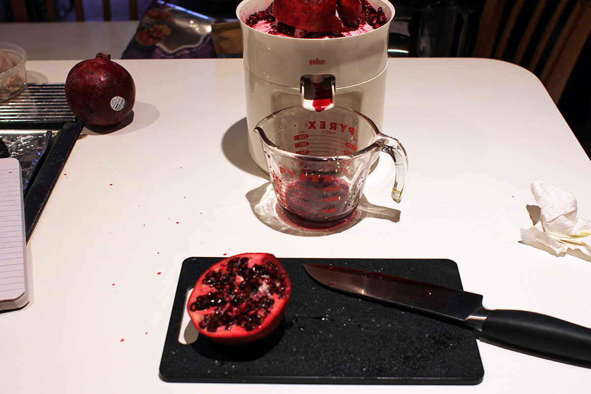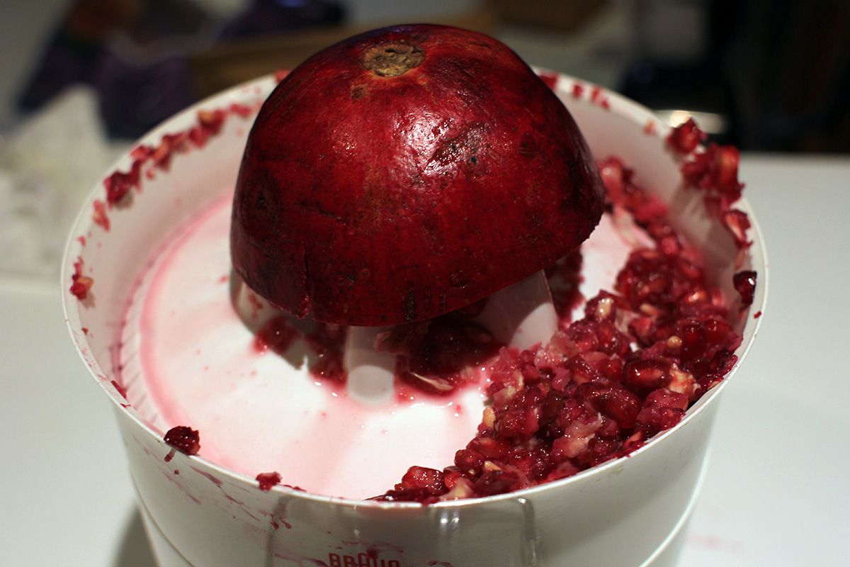 looking to try something different, i decided to juice some pomegranates. i saw a video online which made it look easy, but even before i began, i knew it could be a potential nightmare. pomegranate juice stain is nearly impossible to remove. so i wore only dark clothes and even put on an apron. i then sliced 2 pomegranates in half. although pomegranates are juicy and make a fine juice, the inside of a pomegranate is completely different than an orange. an orange has a fleshy pulp that more or less stays in place during juicing; a pomegranate is all seeds inside that has a tendency to fall off and fly away. stray seeds are wasted since they can't be juiced anymore even though they still contain plenty of juice. worst of all, the juice stained the lip of the juicer and i only managed to clean most of it off using a magic eraser sponge. pomegranates are better for pressed juicers than spinning juicers. that's how they do in xi'an, where they grow a lot of pomegranates, they use a pneumatic press to extract the juice. i did the best i could with my equipment and only got 6-8 oz. of juice, which i managed to find a small glass sauce bottle to keep it in. i also squeezed a fresh container of orange juice.