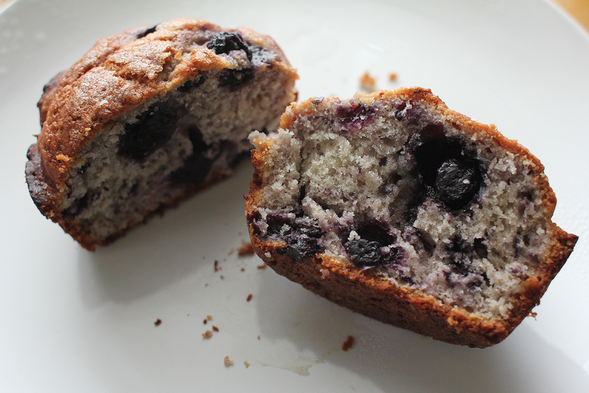 my mother called this morning asking how many more blueberry muffins i had. apparently the ones i made yesterday - the ones that she thought were sort of throwaways and gave 2 to my 2nd aunt - were amazingly delicious when my mother finally tried it today. i asked her what was the difference. she said it wasn't very puffy, but the balance was just right, not too sweet, with a lot of blueberry flavors. i finally tried one myself for lunch. the crust and sides were a little hard, but i actually like a thicker crust/sides. though not puffy, the muffin inside was still very soft, and the combination of normal and wild blueberries along with some crushed blueberries mixed into the batter gave it a strong blueberry flavor. though the batter was purple, the muffin interior wasn't purple at all.