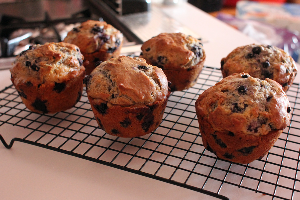 i baked at 425°F for 10 minutes then 375°F for 30 minutes. if i really wanted to be lazy, i would've just baked at one temperature. the final product looked like. i packed up 4 of them immediately and left for the cafe to deliver them to my mother. however when i arrived she wasn't there, having gone out for a walk. also because i didn't have a good container, two of the muffins got crushed a little bit. my father and i shared one of the broken muffins, still warm from the oven. they tasted like the muffins i made last time (v4), it'd be difficult to tell them apart. the butter chunks didn't seem to matter in the end, since all the butter melts anyway during the bake.