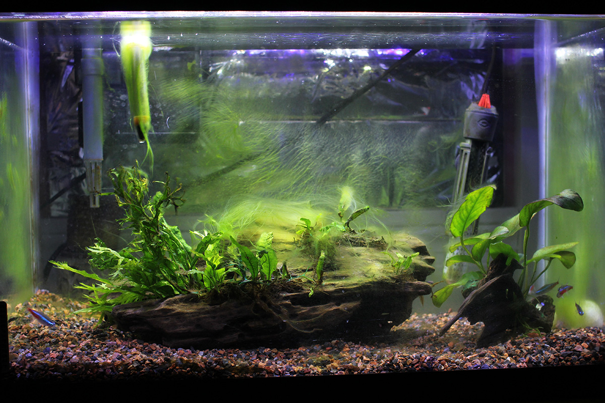i cleaned my aquarium in the late morning. it's only been a week and a half since the last cleaning, but in that time there's been an outbreak of green thread algae. unlike hair algae which i've experienced a long time ago (when that stuff starts growing on your plants, it's easier just to throw the plants away), green thread algae is more delicate and actually looks kind of pretty swaying in the water current. the algae has taken up all the excess nutrients from the tank and now i have zero cyanobacterial slime, so it's not all bad. over time, when my plants reach a certain size, they will take up all the nutrients and the algae will disappear on its own. in the meantime, i can continue to do frequent water changes and possibly add more plants if possible.