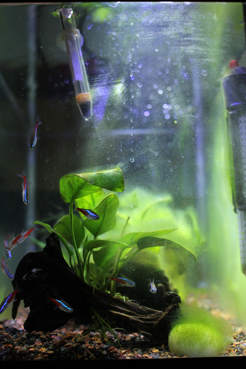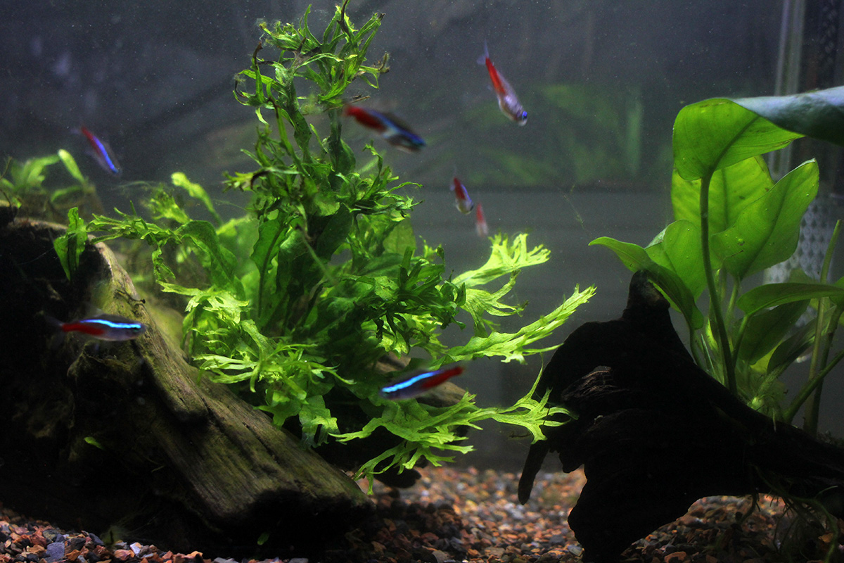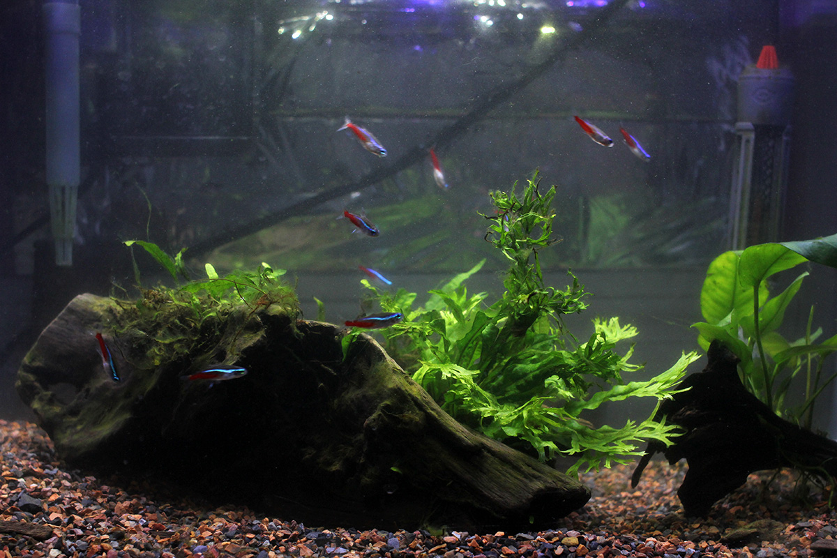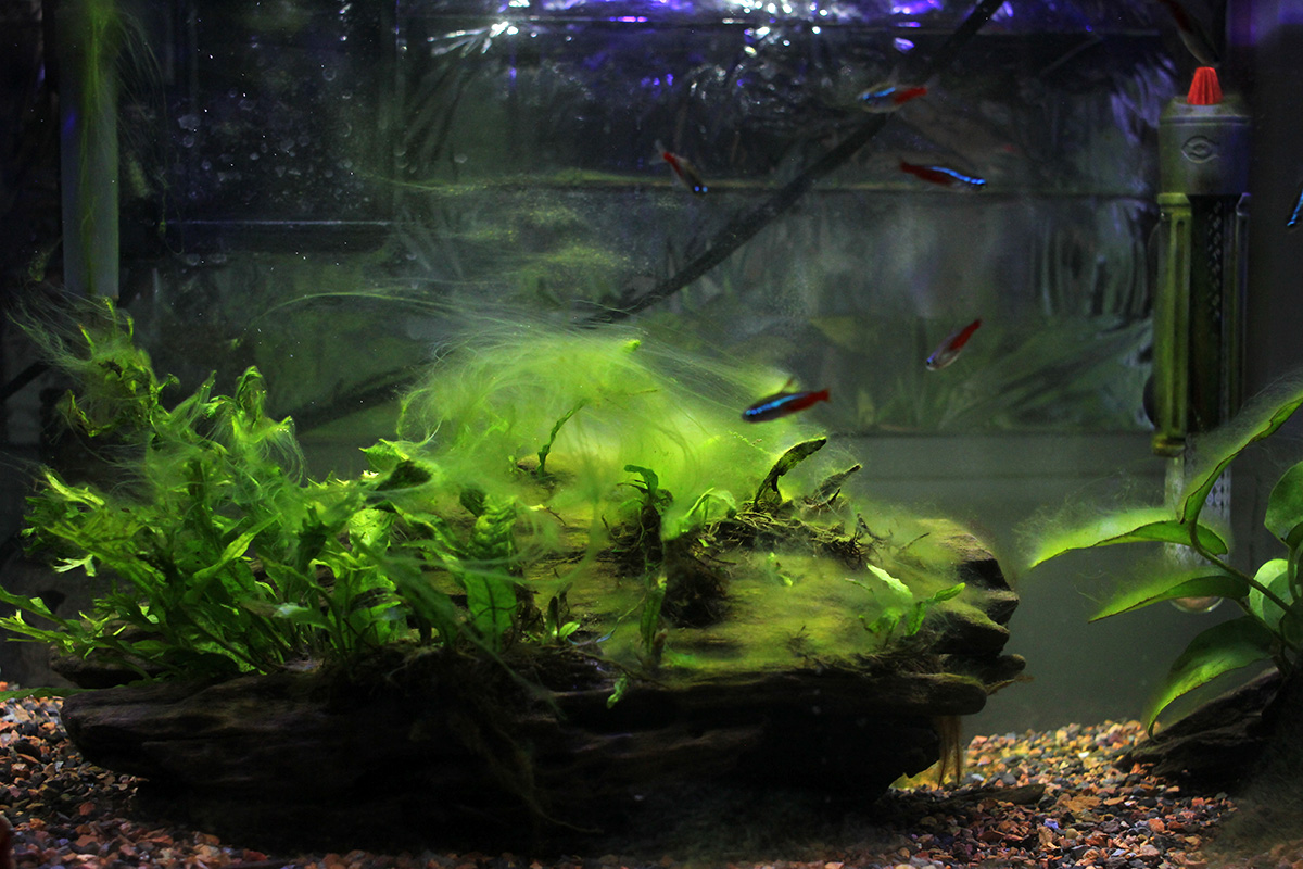 i did a load of laundry and cleaned the fish tank. it takes about 2 weeks for the thread algae to get thick enough that it needed a cleaning. algae really likes to grow on the anbias nana leaves, even though they're so tough and leathery. besides the thread algae, there's also a black algae that looks like rot but can be gently scrubbed off with a sponge. i also took out the larger driftwood with the various java ferns and cleaned it in the sink before putting it back into the tank, switching the direction.