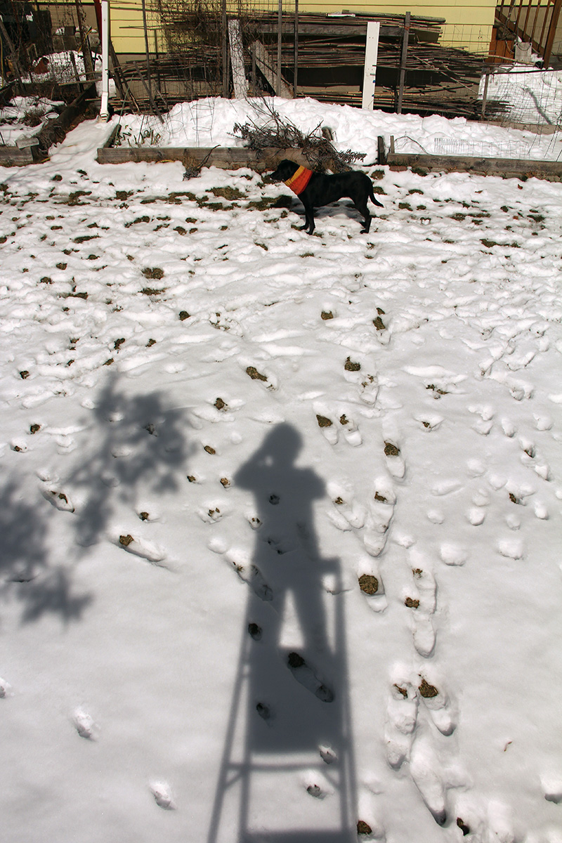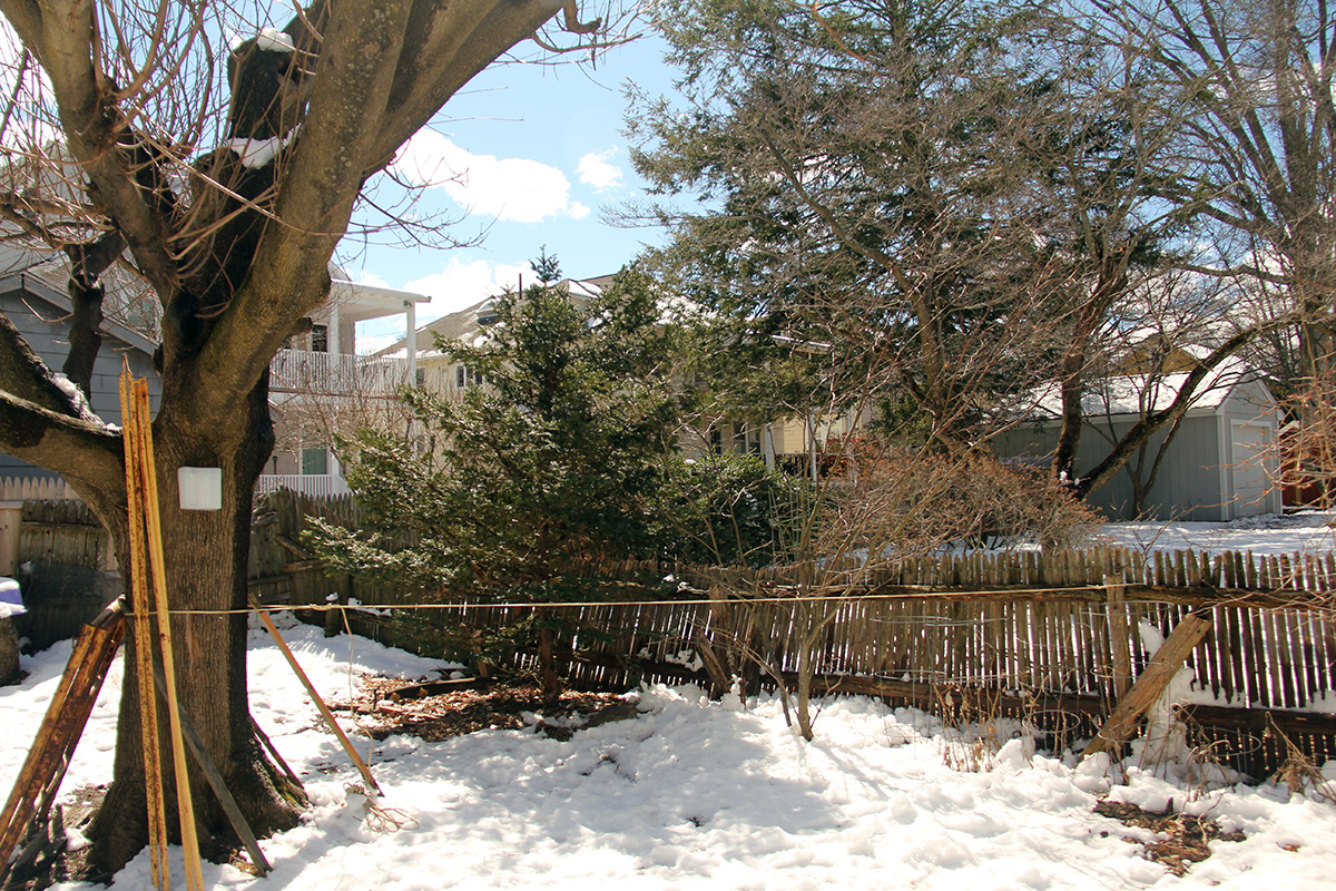 i had my sister help me upright the collapsed fence. it's a two-person job, my sister to hold the fence up while i tied a rope from the fence to a tree to keep it upright. it's not the most elegant solution, but at least it'll keep the snow off until we can replace the broken posts when my father gets back.