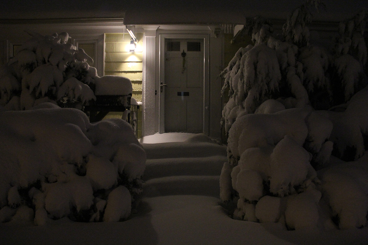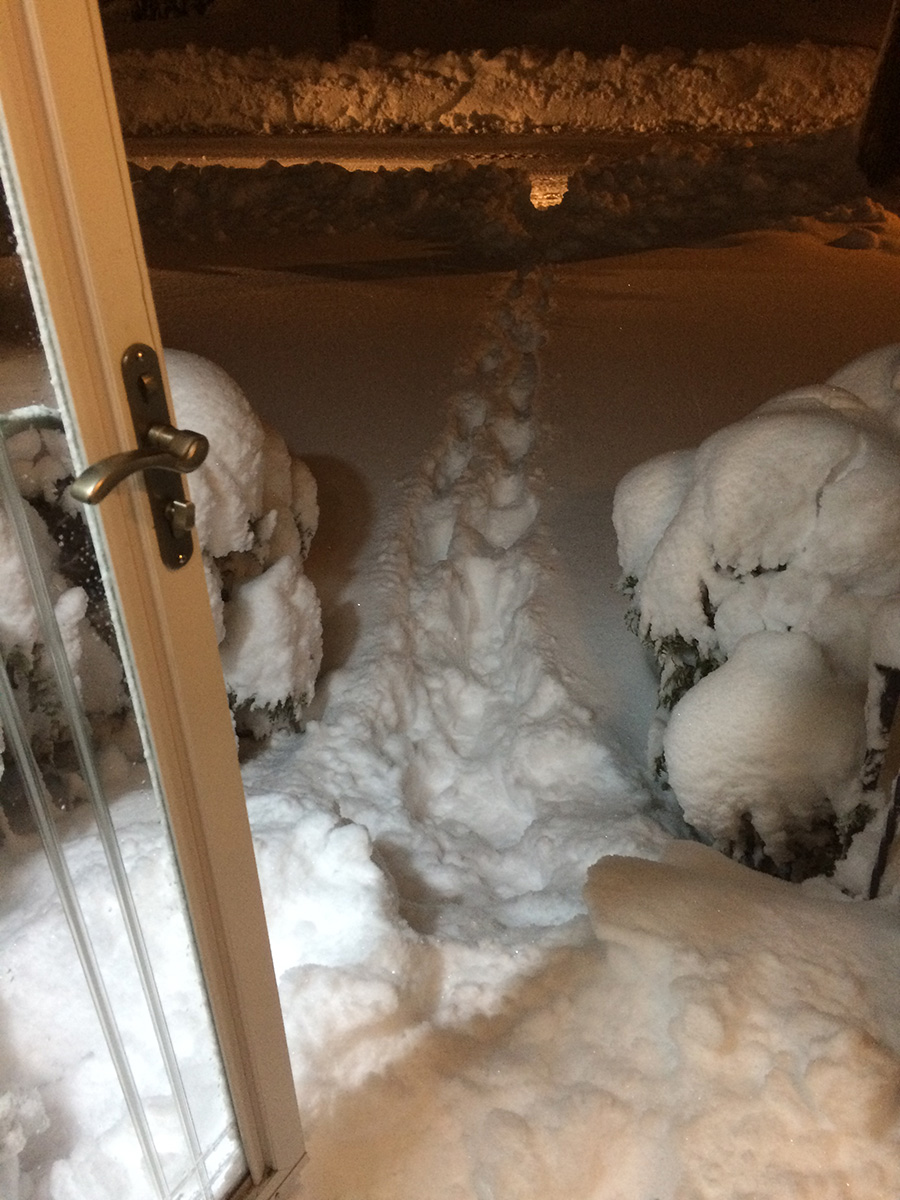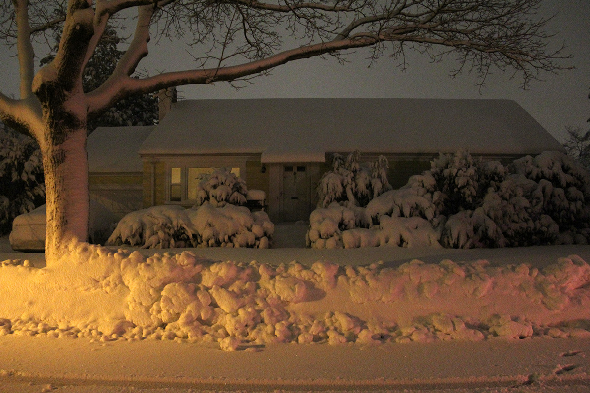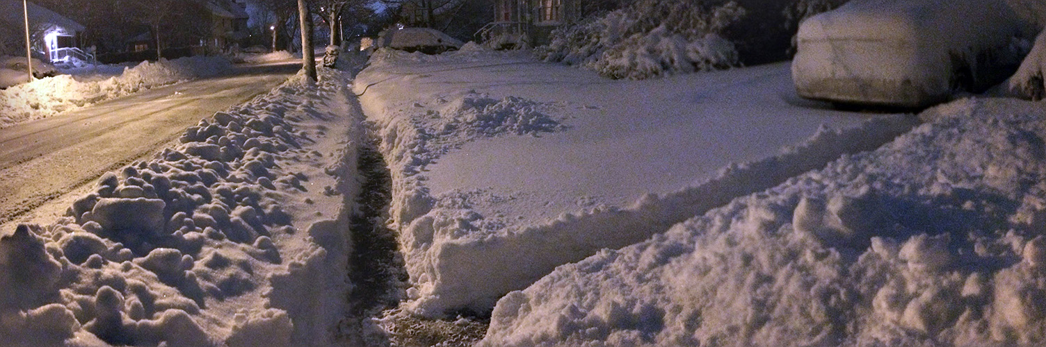 when i got to my parents' place, i had to dig out a trench with my boots over the plow-created snow bank, then walk in snow that was nearly knee deep to get to the front door. i spent the next 1-1/2 hours digging out, first the walkway, then the sidewalk, and finally a path to the trash bins as there was trash pickup scheduled for tomorrow. i also went into the backyard and cleared the steps. i finally finished by 10:30pm.