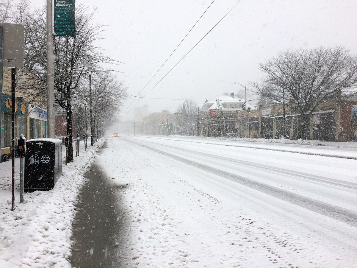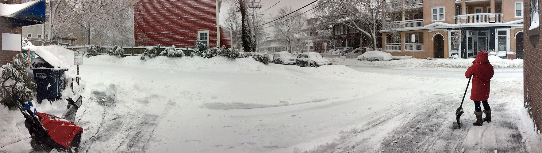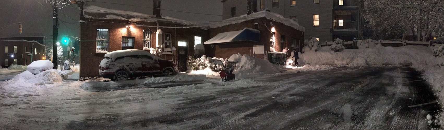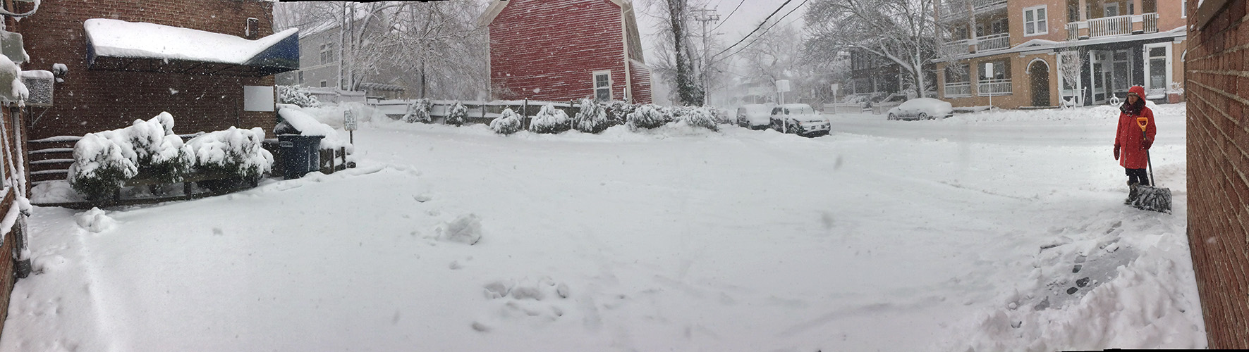 we began our first round of cleanup around 9:00am. of the few businesses that were opened today, i saw they already had crew working to clear the snow. my sister worked the shovel while i manned the snowblower. you'd think the snowblower would make the work easier, but the initial stage of this nor'easter was wet snow, which clogged up the chute (despite my snow-jet treatment) and i had to manually break apart the slush every so often. we worked from my sister's place down to the cafe and to the parking lot. most of the businesses had closed for the day so there was no cars parked, which made the work of the hired snowplow truck much easier as he cleared the parking lot. but his vehicle couldn't get to the corners so we had to manually do those areas ourselves. returning back to the house, one of the astrophysicist tenants from upstairs came down to help us shovel. originally from beijing, they get snow there but nothing like this, and he seemed to be enjoying the novelty of it all (though he'd probably think otherwise if he's lived through new england winters for nearly 4 decades). we finished by 10:45am, nearly 2 hours later.