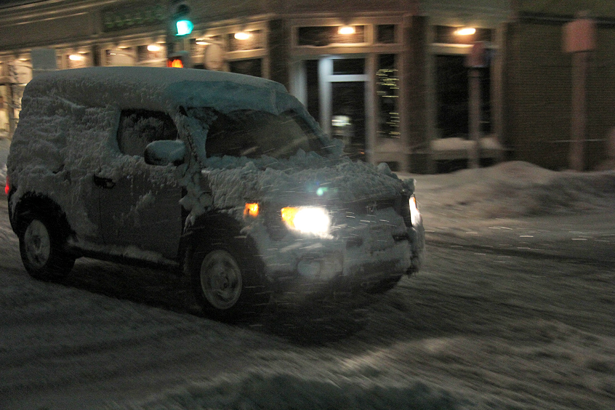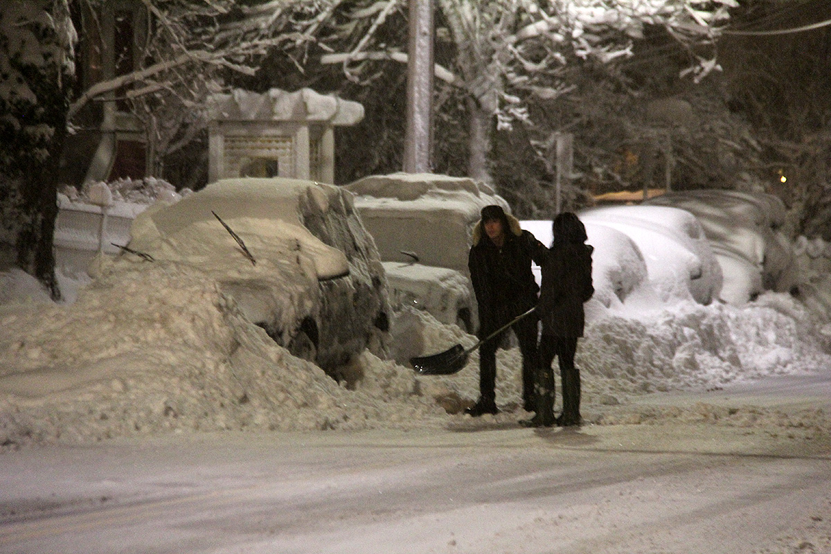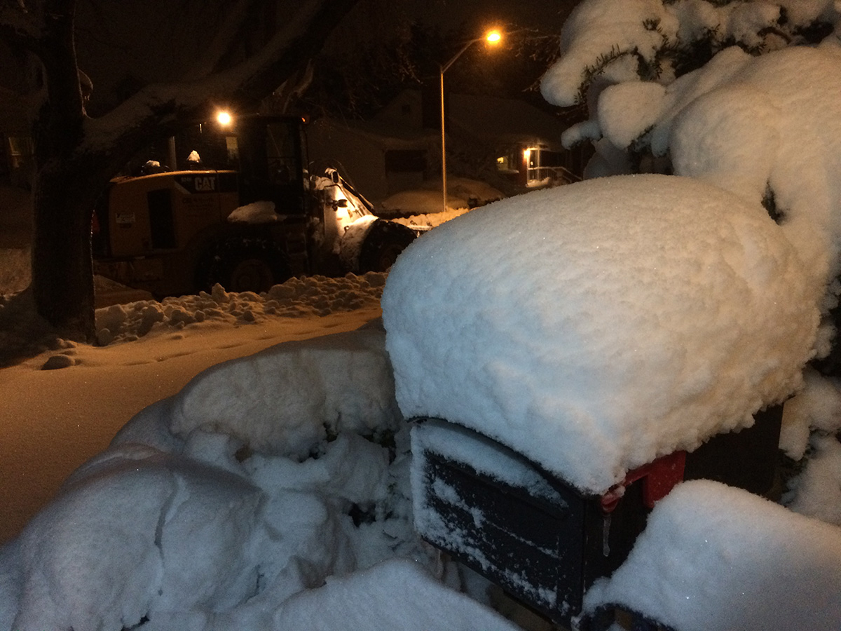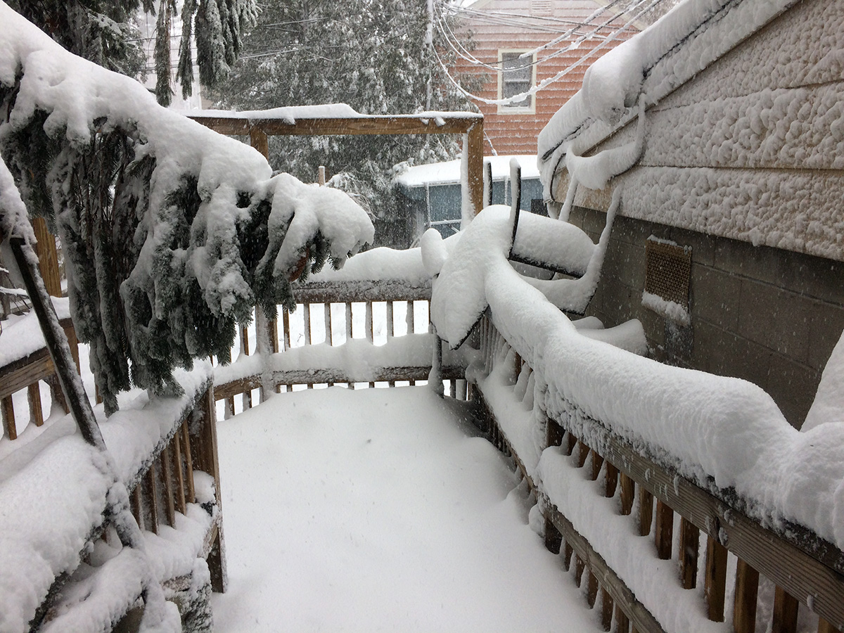 we began our first round of cleanup around 9:00am. of the few businesses that were opened today, i saw they already had crew working to clear the snow. my sister worked the shovel while i manned the snowblower. you'd think the snowblower would make the work easier, but the initial stage of this nor'easter was wet snow, which clogged up the chute (despite my snow-jet treatment) and i had to manually break apart the slush every so often. we worked from my sister's place down to the cafe and to the parking lot. most of the businesses had closed for the day so there was no cars parked, which made the work of the hired snowplow truck much easier as he cleared the parking lot. but his vehicle couldn't get to the corners so we had to manually do those areas ourselves. returning back to the house, one of the astrophysicist tenants from upstairs came down to help us shovel. originally from beijing, they get snow there but nothing like this, and he seemed to be enjoying the novelty of it all (though he'd probably think otherwise if he's lived through new england winters for nearly 4 decades). we finished by 10:45am, nearly 2 hours later.