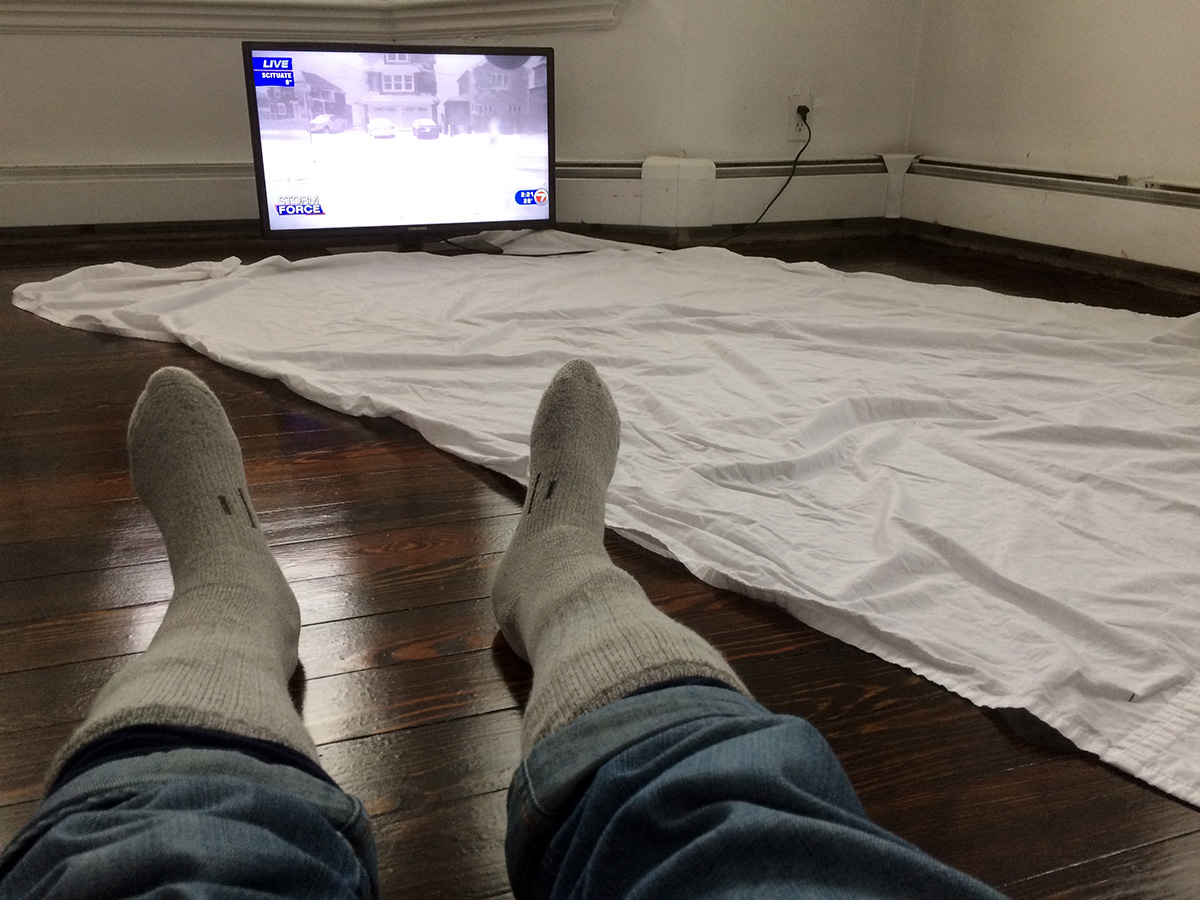 waiting without the internet was like being stuck in boredom hell. all my beautiful plans - surf the web, download some movies, stream a few shows - were out the window. i could get the free xfinitywifi from neighboring routers, but the connect was weak and intermittent. the only thing left to do was to watch the non-stop nor'easter coverage on television, but even that was short-lived when my sister wanted to play one of her dvd's. her place also wasn't very cozy, sort of like a hoarder's apartment, with just a single office chair in the back of her bedroom where i could barely see the tv. the living room (my grand uncle's former room) was empty, the floor newly sanded/stained/treated, but it reeked of polyurethane. in fact, the whole place smell of it. i found myself pacing around the empty room, wishing time would go faster, or maybe a miracle might happen and the internet would come back. my jeans were also wet, but i wore a layer of wool underwear underneath that kept me warm. i figured i would just dry the jeans in situ using body heat. it finally got so boring i got the second HDTV which used to belong to my grand uncle and hooked it up in the living room. i got spotty reception using a paperclip antenna and watched the news sitting on the floor with my back to the wall.