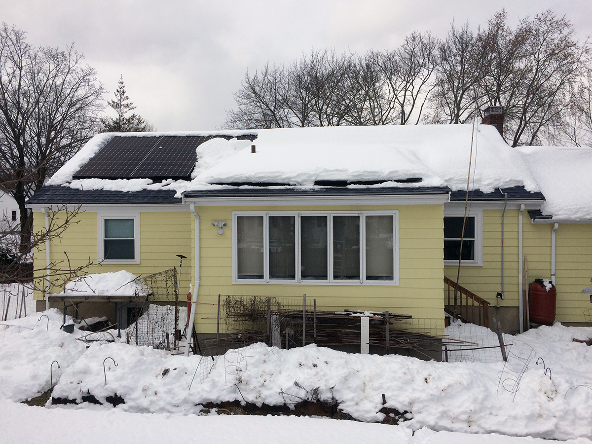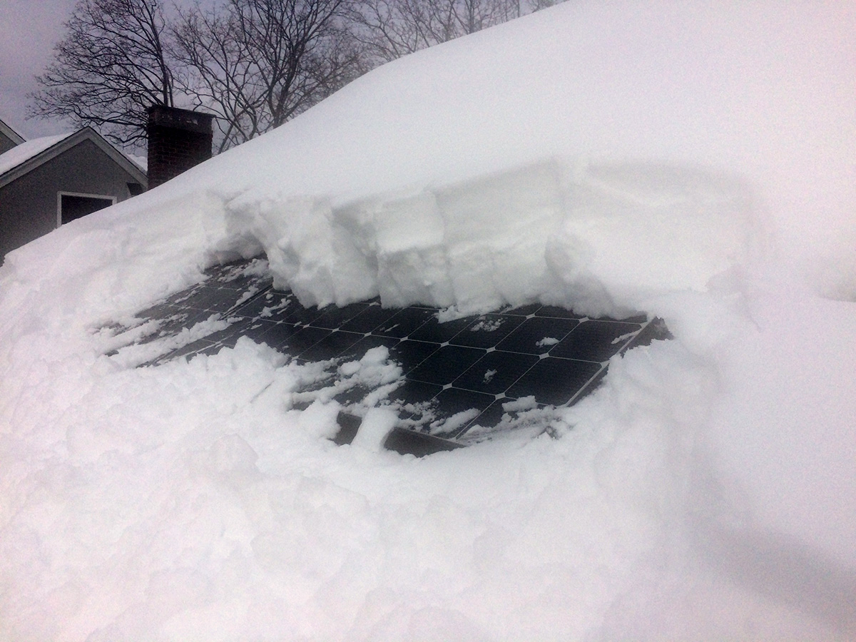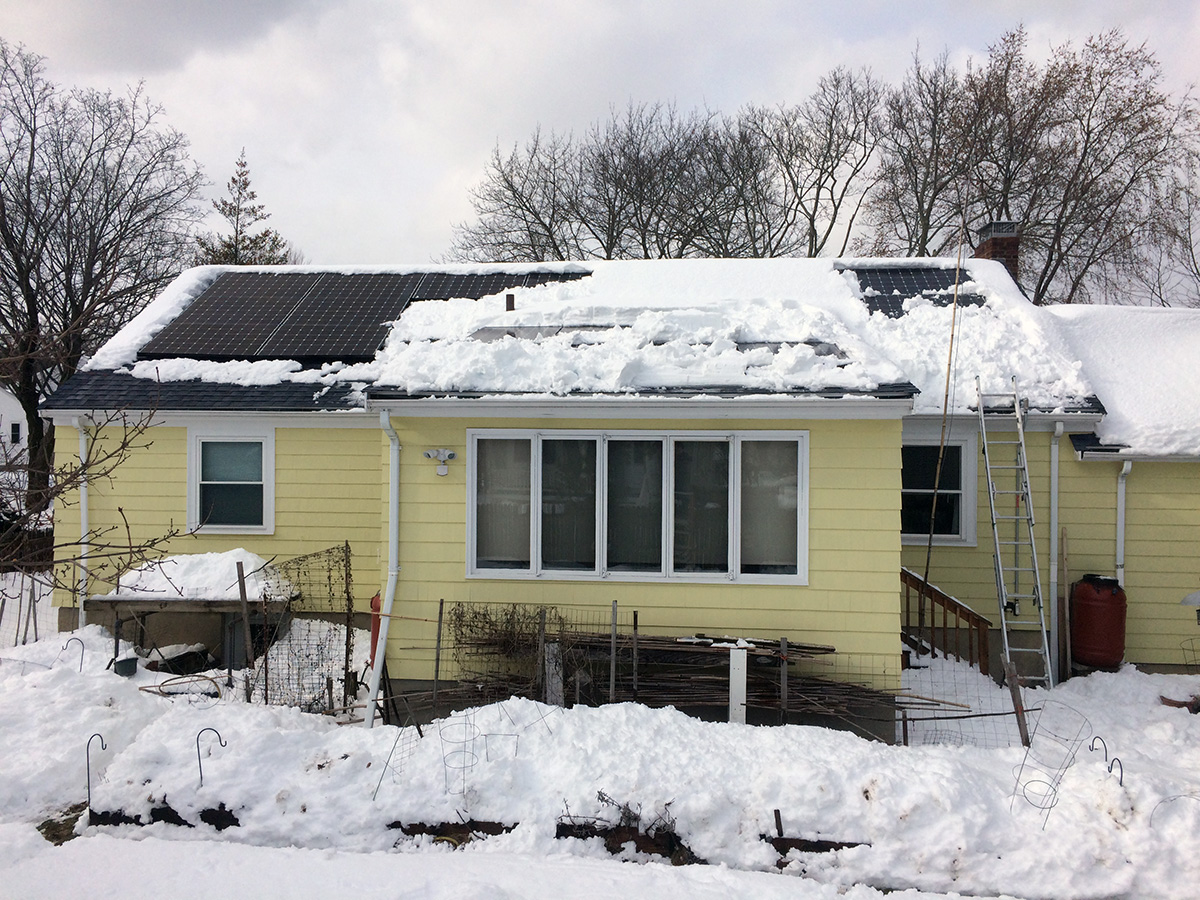 i rested for a few minutes, enough to catch my breath, before i went back outside to clear the snow from the solar panels. despite the overcast, temperature was in the 40's and there was considerable melting today. what little snow i cleared from the panels earlier this morning had melted and slide off the roof, free about 6-7 panels. i worked the roof with the foam panel, but the snow was just too dense. tired, soaked, i decided to call it a day, and continue working on it tomorrow morning.