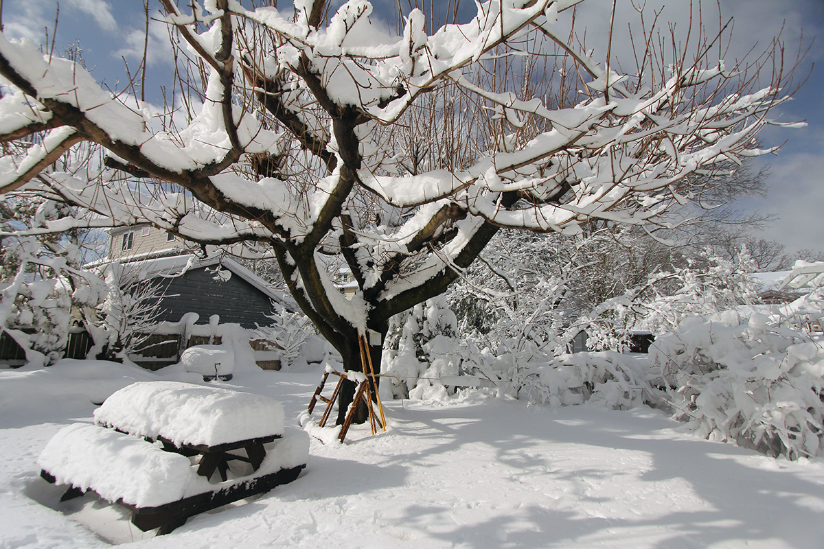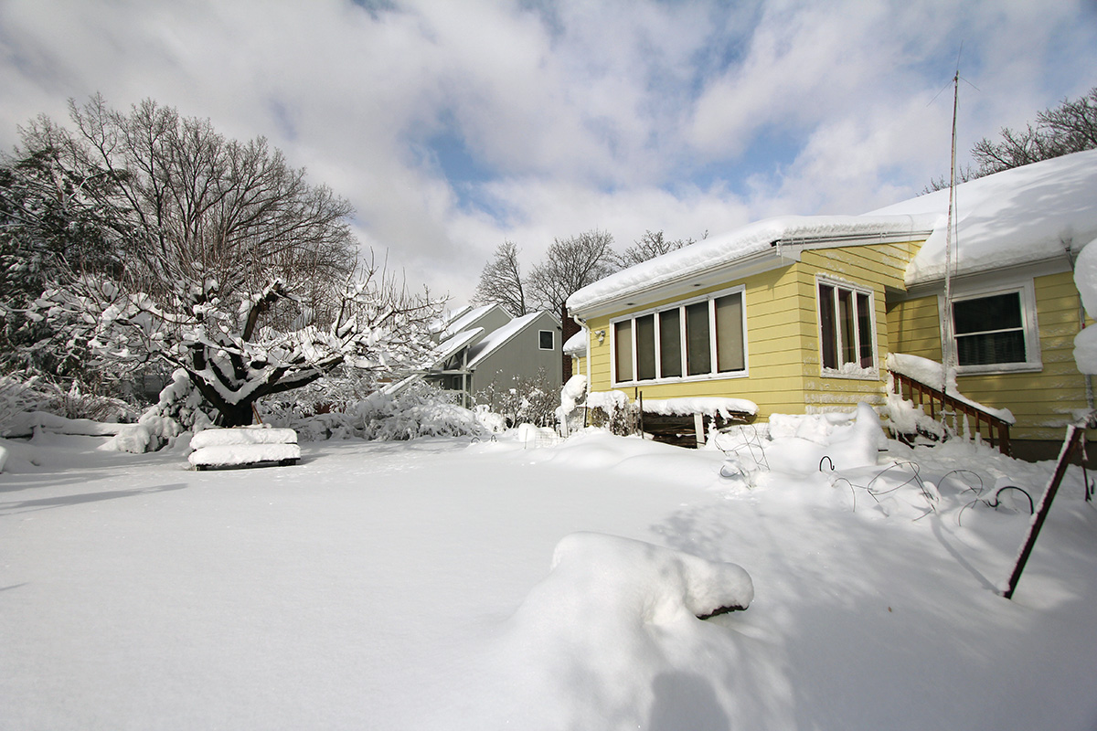 it took me an hour to finish the front of the house before i moved onto the back (9:30am). up until this point i hadn't even been in the backyard, just enough to clear the snow off of the back steps last night. i assumed the panels were buried under thick snow so i dug a trench to the step ladder so i could climb it and get a good look.