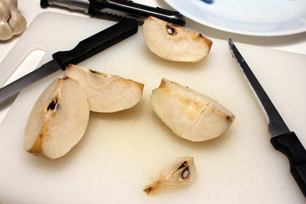 ingredient-wise i was following the same as last time, except i didn't have garlic chives so i used scallions, and didn't have an asian pear so i used an apple. however, when i was down at the cafe earlier, my 2nd aunt just happened to have an old asian pear she didn't want anymore.
