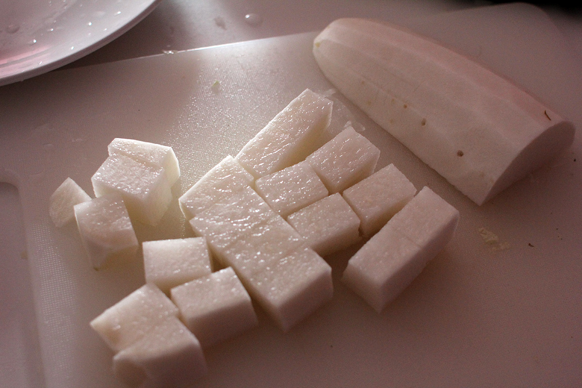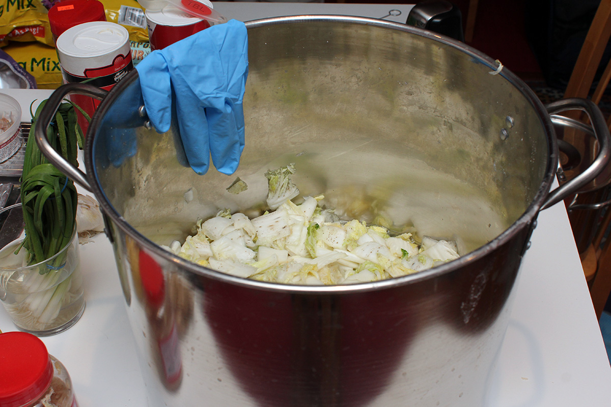 i cut the napa cabbages into squares (removing the core) and cubed the peeled daikon radish. the napa cabbage were the right size (not too large) which made cutting easier. i had about 9 lbs. total worth of vegetables, about the same amount as the last few times i made kimchi, so i used the same portion of salt to reduce, 5 tbsp. if i really wanted to be accurate, the exact portion is (6.83 lbs. napa + 2.16 lbs. daikon) * 0.54 tbsp of salt = 4.85 tbsp total. so roughly 5 tbsp. wearing a glove (i learned my lesson when i made sauerkraut yesterday) i mixed the vegetables and salt and left it to reduce in the 20 qt. stock pot for the next 6 hours.