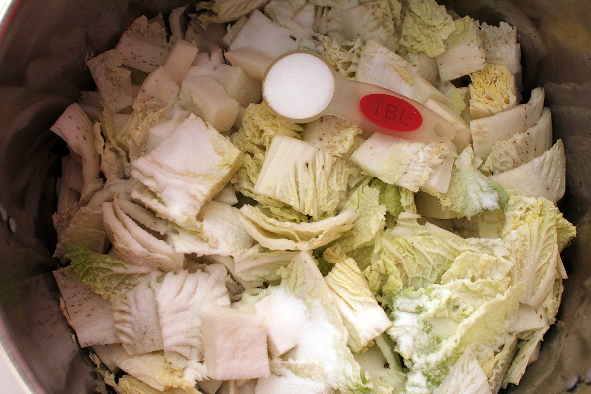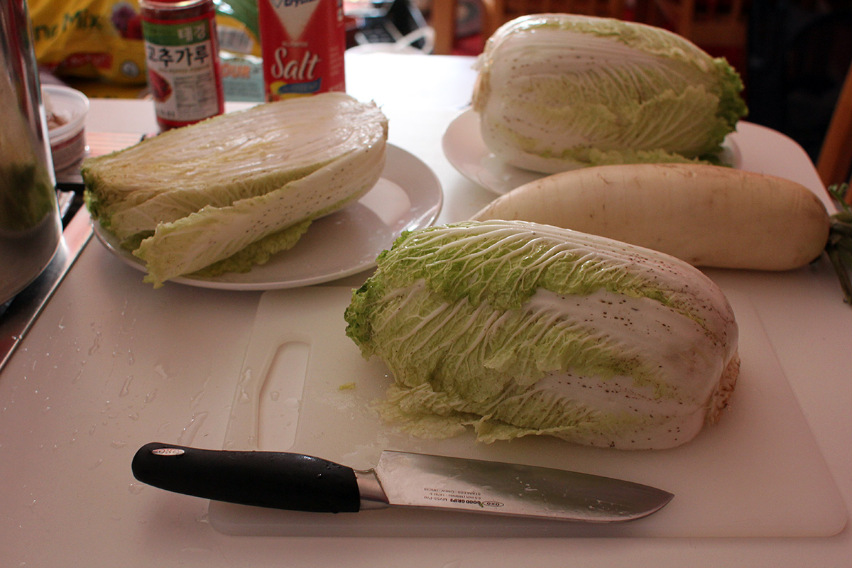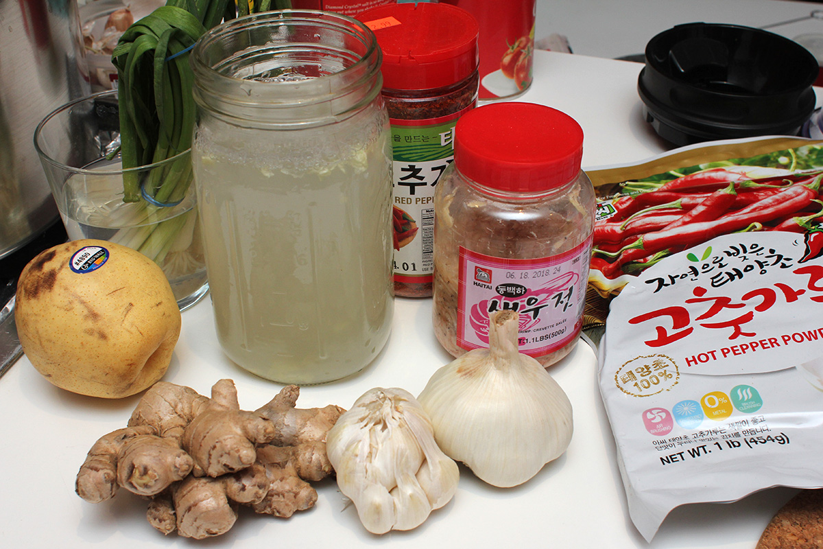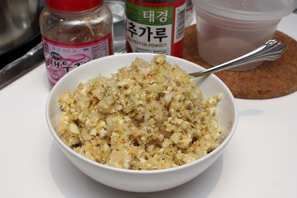6.83 lbs. napa cabbage 2.16 lbs. daikon radish 5 tbsp fine salt 2 tbsp salted shrimp paste 12 tbsp red pepper powder |