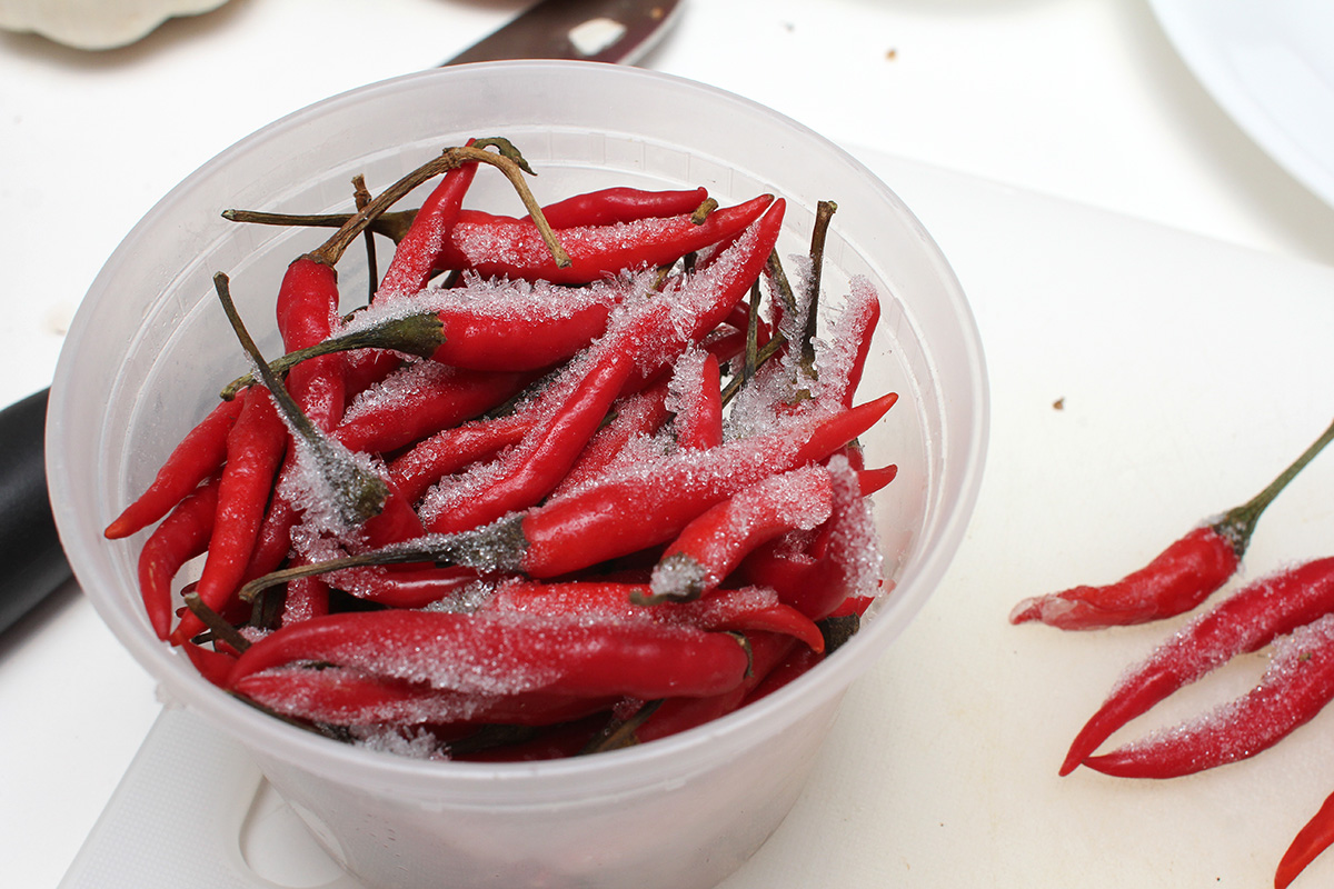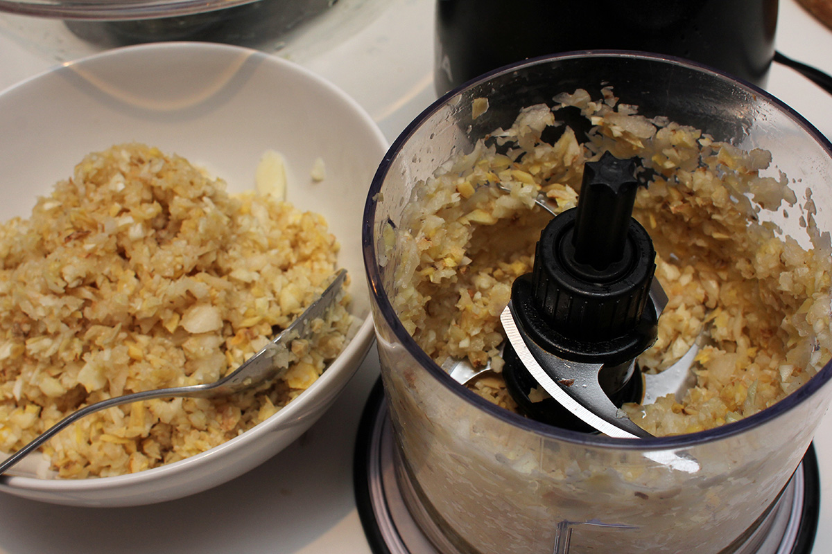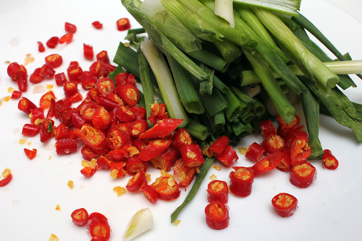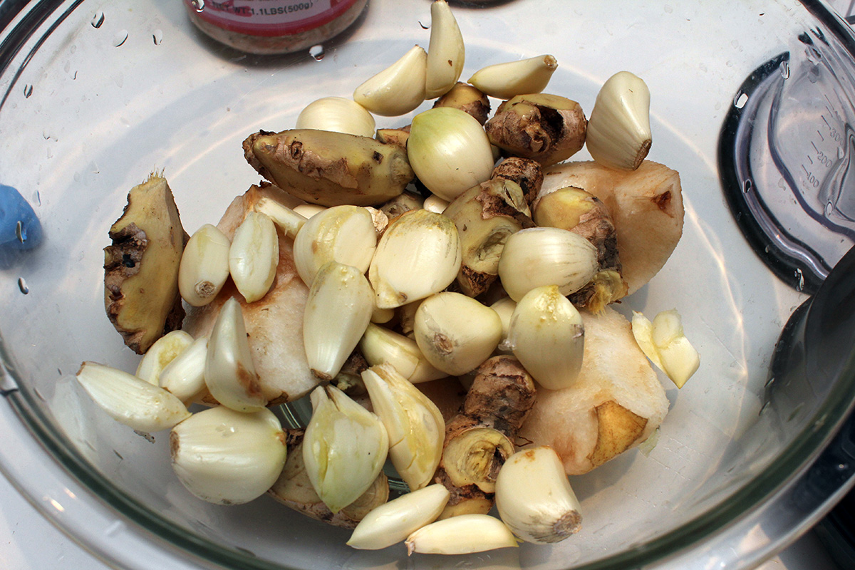 0.30 lbs. ginger, processed 2 heads of garlic, processed 1 asian pear, processed 15 thai hot peppers, chopped 2 bunches scallions, chopped |