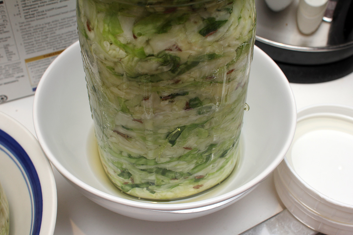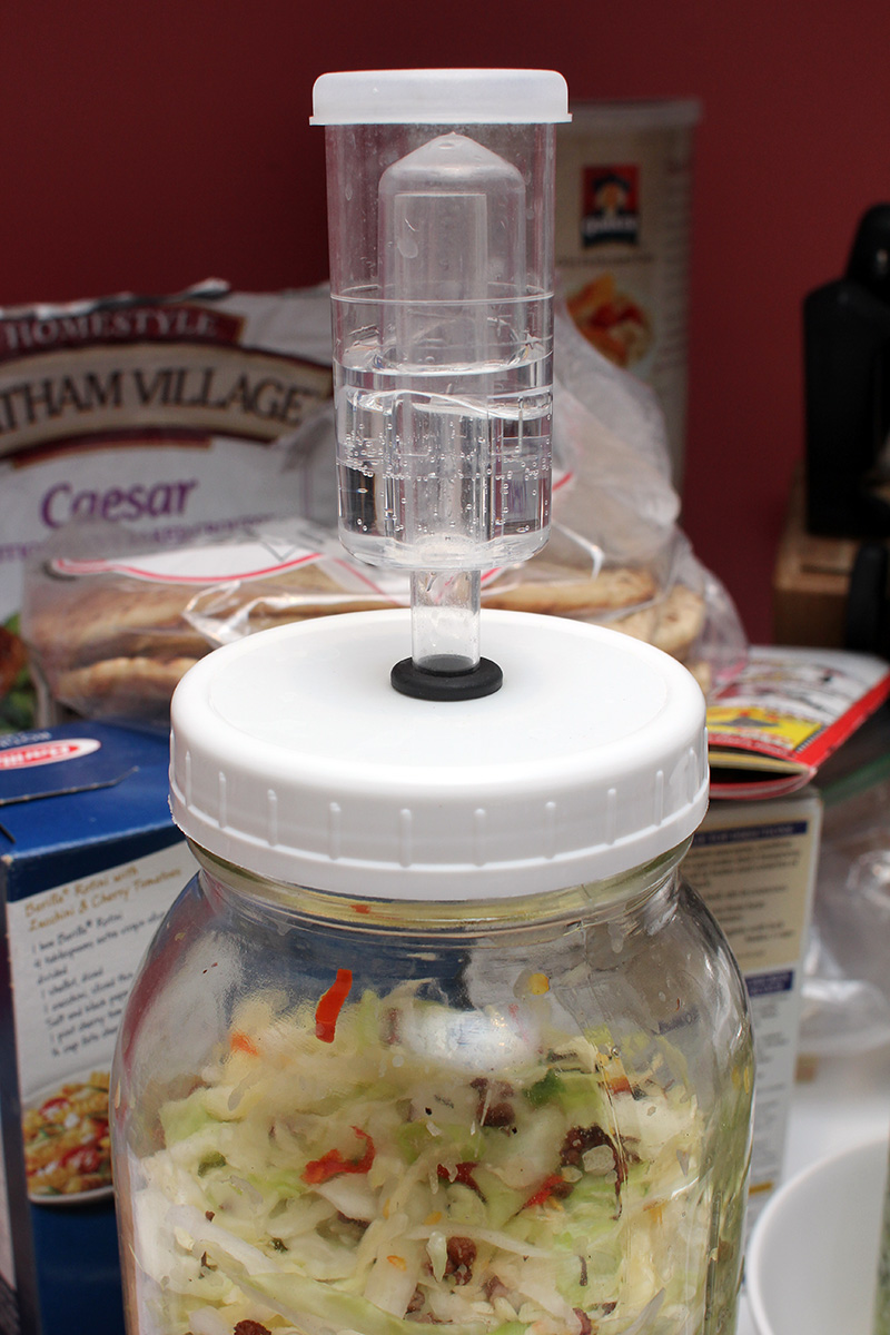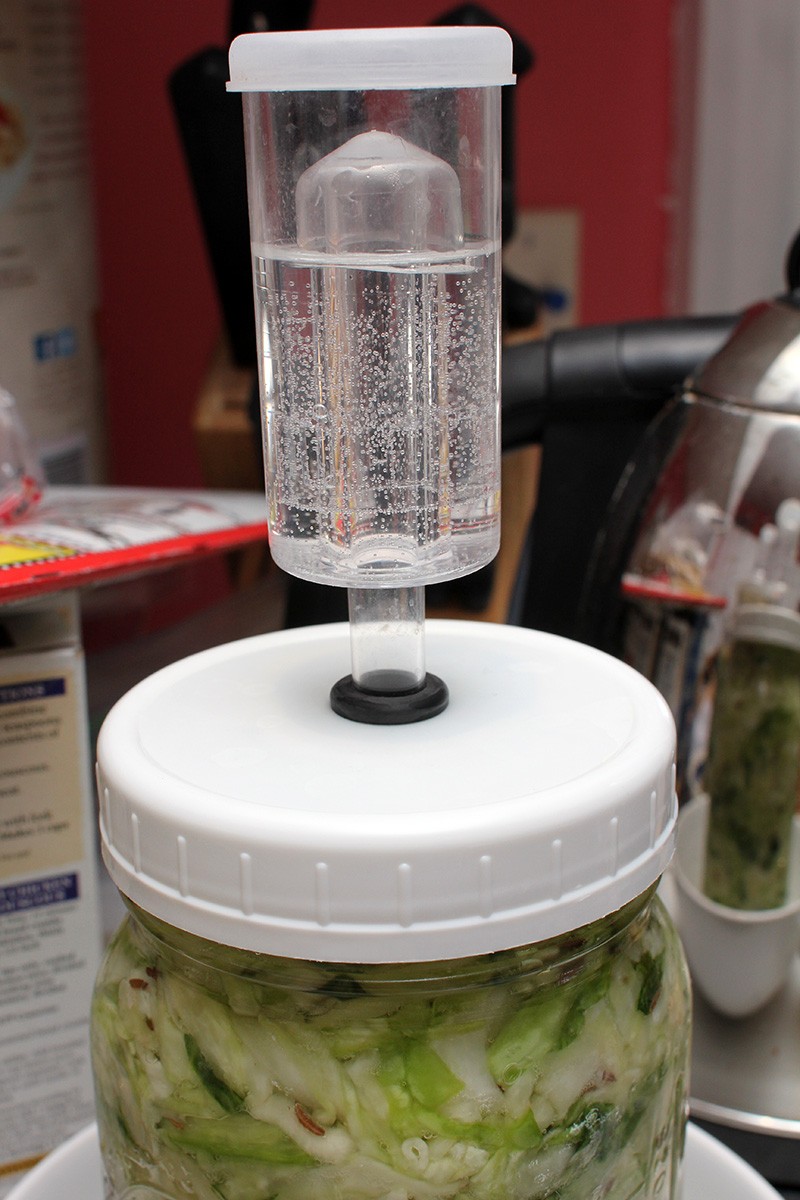 elsewhere, on the sauerkraut front, the sichuan sauerkraut seems to be fermenting well judging from the airlock. but there's no activity in the traditional sauerkraut airlock, though i've noticed juices already already leaked into the bowl. this jar is so compacted with sauerkraut there's just no space for the air to escape through the airlock so it vented from the side of the lid instead. i opened it up to further compress the sauerkraut before tightening it back up again.
