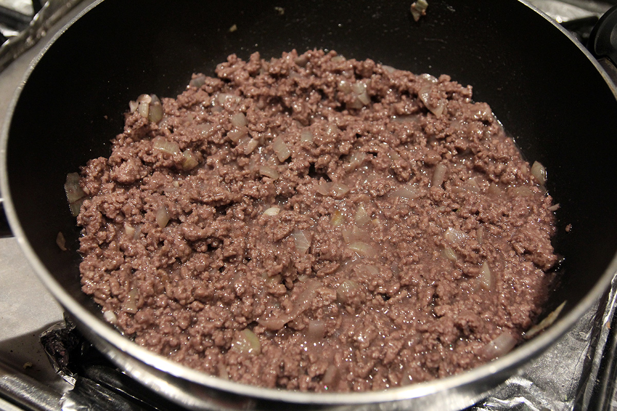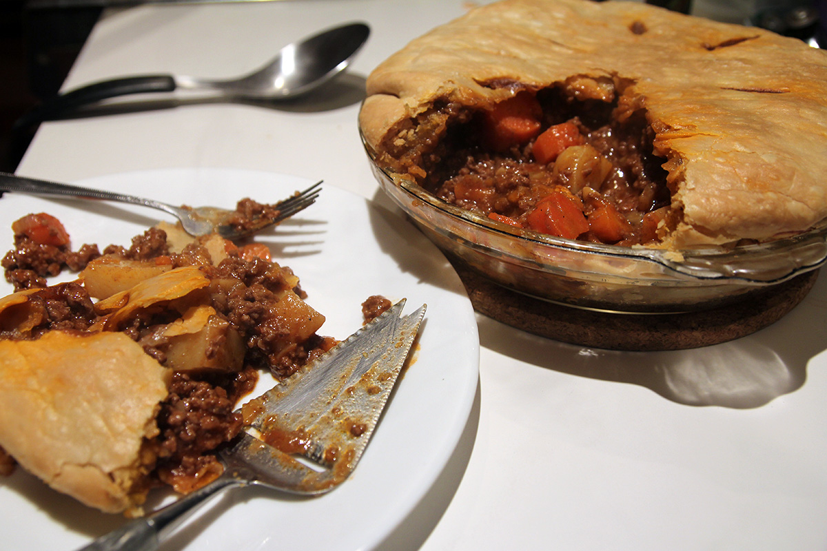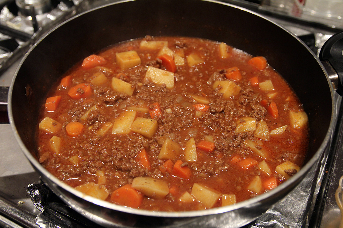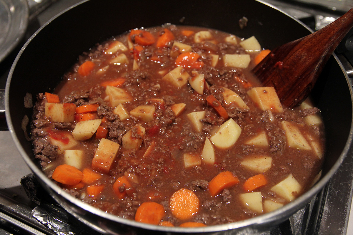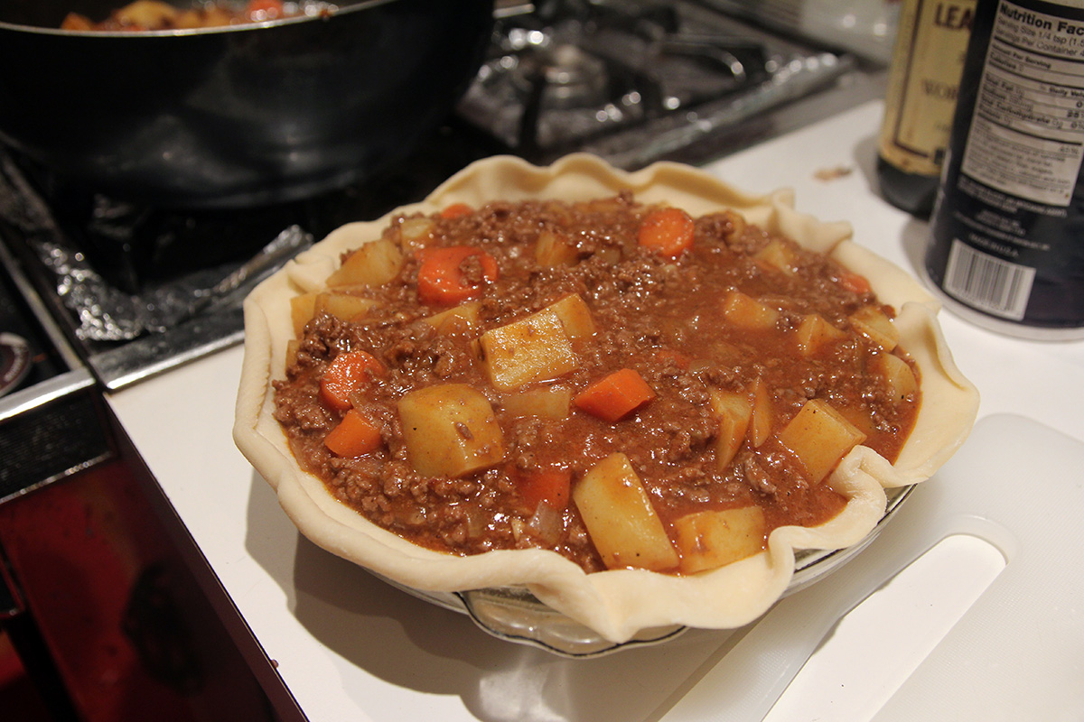 after cooking the onions and garlic in oil and butter, i added the ground beef. the original recipe called for cubed sirloin chunks, but ground beef can also be substituted. i thought the amount of beef (2 lbs.) combined with the eventual chopped potatoes and carrots seemed a lot, and a check of the recipe calls for baking in a lasagna dish, not a pie dish, even though the photo shows the pie in a round dish. i figured i'd stuffed as much as i could into the pie and save the rest for either another pie or something else.