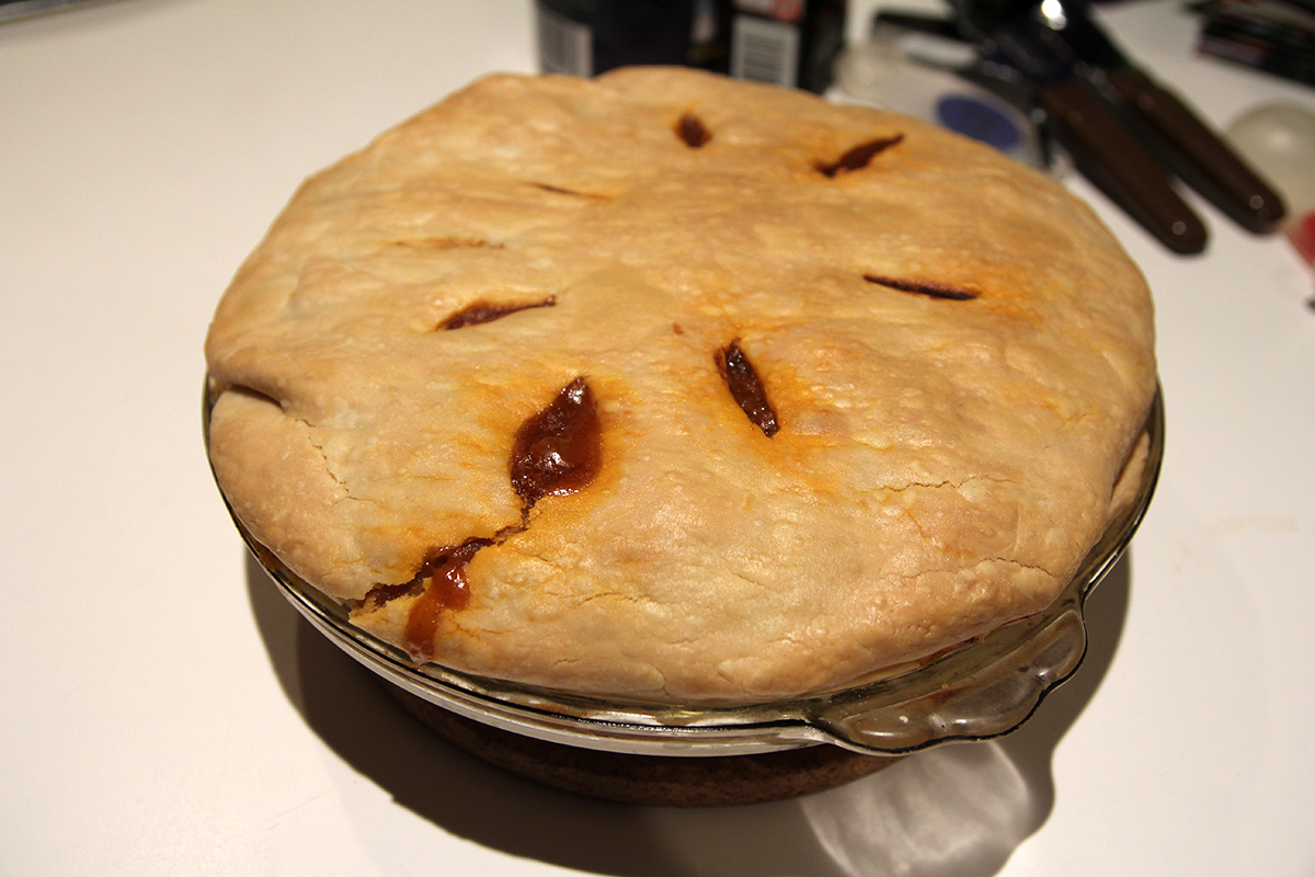 after 30 minutes i began scooping the filling into the pie crust. the filling was a little soupy and i was afraid it'd melt the raw crust, but nothing i could do at that point. i then put the second crust on top and sealed the edges, cutting a few slices into the crust before putting it into the oven for 45 minutes at 400°F.
