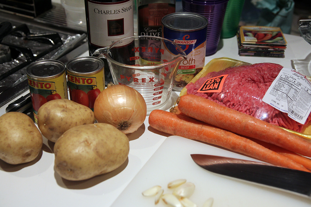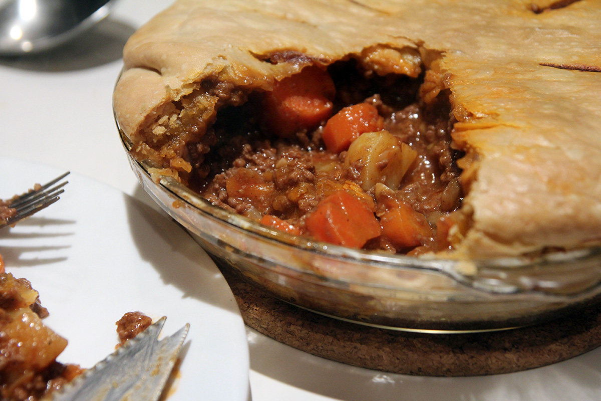 i was in the mood to make something hearty for dinner. there was a sale on ground beef at market basket, and originally i thought i'd just make a simple spaghetti sauce. then i went online and did a reverse recipe search by ingredients and found some savory meat pies. the recipe i followed was for a beef and potato pie. the recipe is a little suspect, with only 3 people having ever made it before, and the instructions rife with errors, like preheating the oven before simmering the pie filling for nearly an hour, or the amount of time to add and cook certain ingredients. having said that, the final result wasn't bad at all. the only ingredients i needed was the ground beef, the pie crusts, tomato paste, and beef stock; everything else i had, including the carrots and the potatoes.