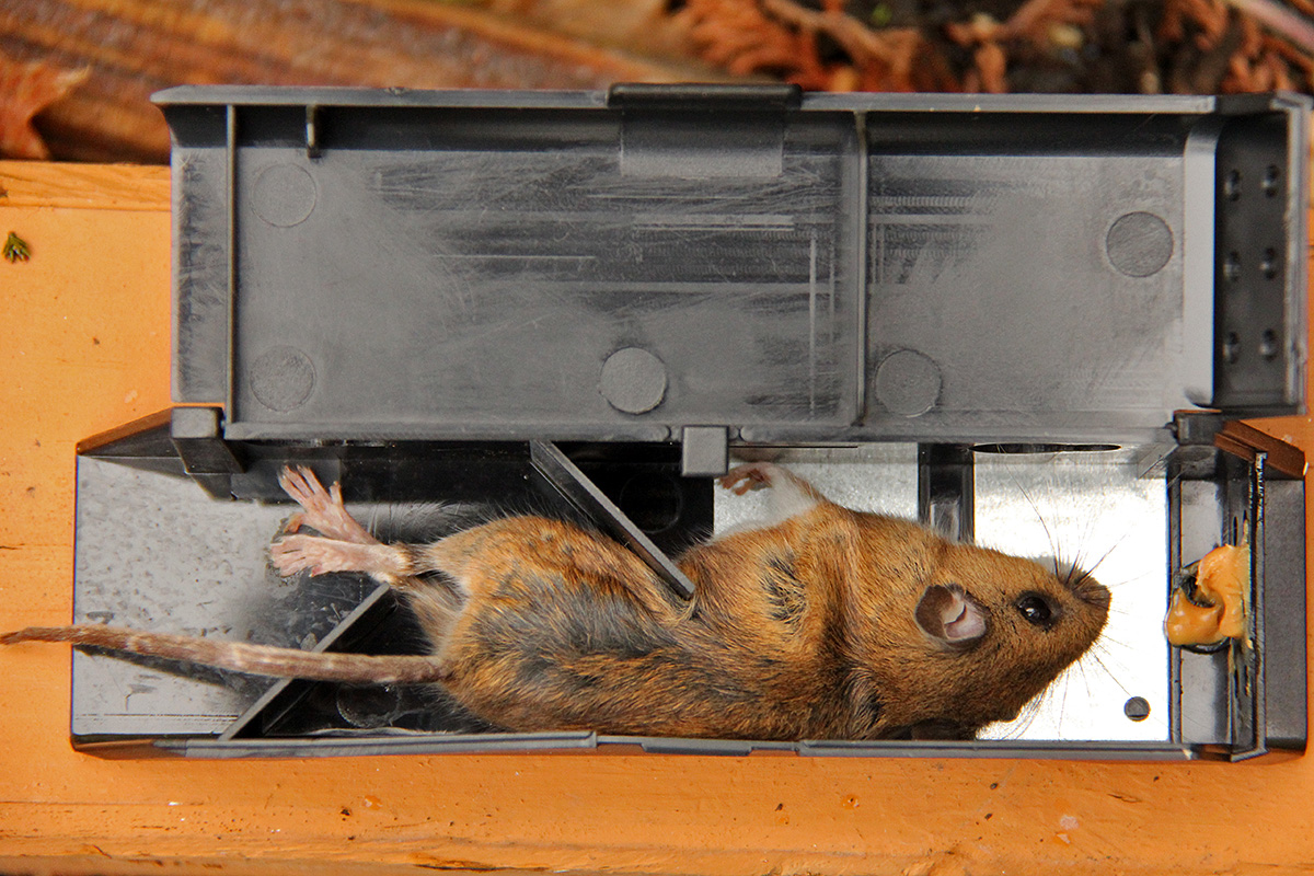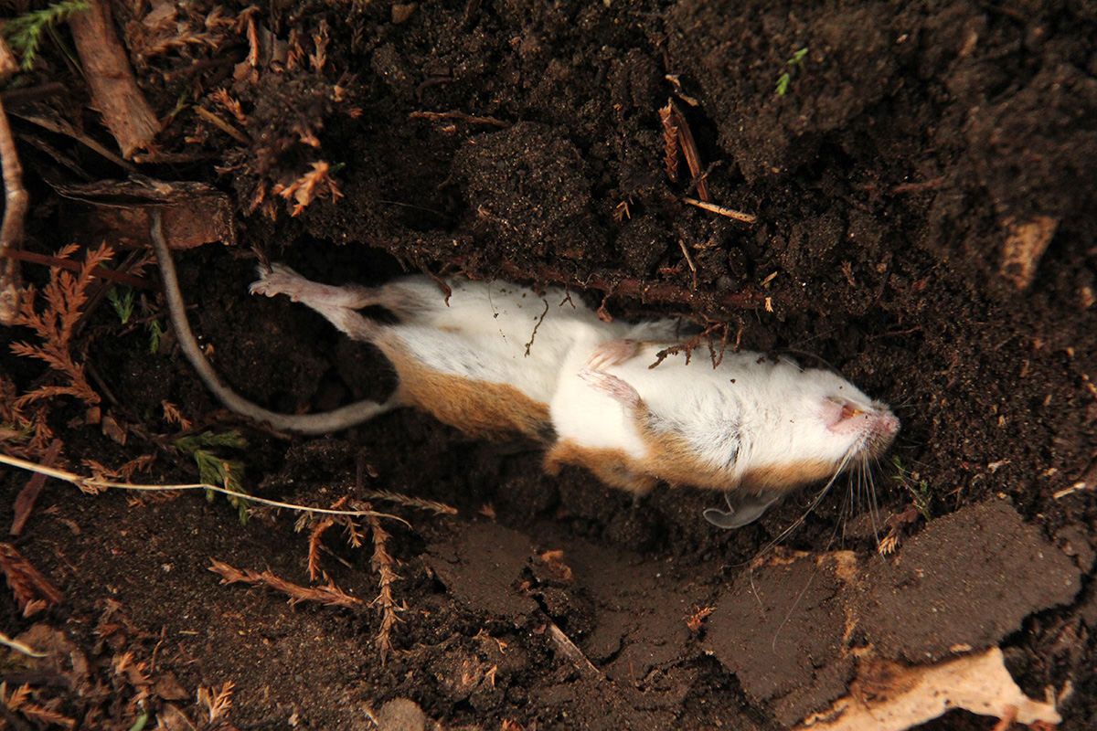 this one was bigger, its tail sticking out of the trap. hard to say how long it's been dead, but there were new scratch marks on the trap lid, either causes by this mouse, or another mouse that tried to get to the bait afterwards. it was still stiff when i went to bury it, so it couldn't have been dead for that long. i also learned that these are deer mice, not house mice. deer mice are orange brown, with an all-white underbelly, bigger eyes and ears. they're wild mice but they do come into houses looking for food and shelter.