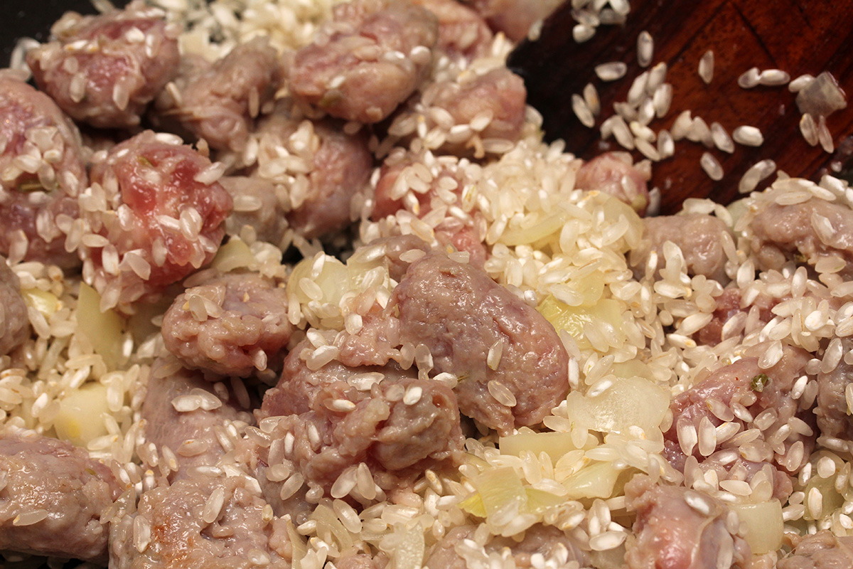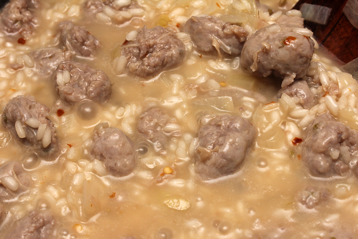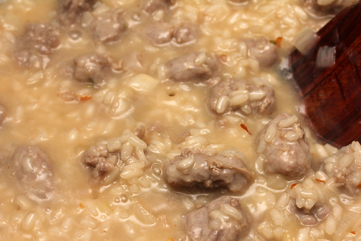 i finally made my risotto tonight. normally i just use half the package of italian sausages (3 sausages) but i used up the whole package. instead of squeezing out the meat from the casings and forming into tiny meatballs, i simply cut the raw sausages into smaller pieces, casing and all, to save time. i was afraid the sausage pieces would be too big, but once properly cooked, they shrink down in size anyway.