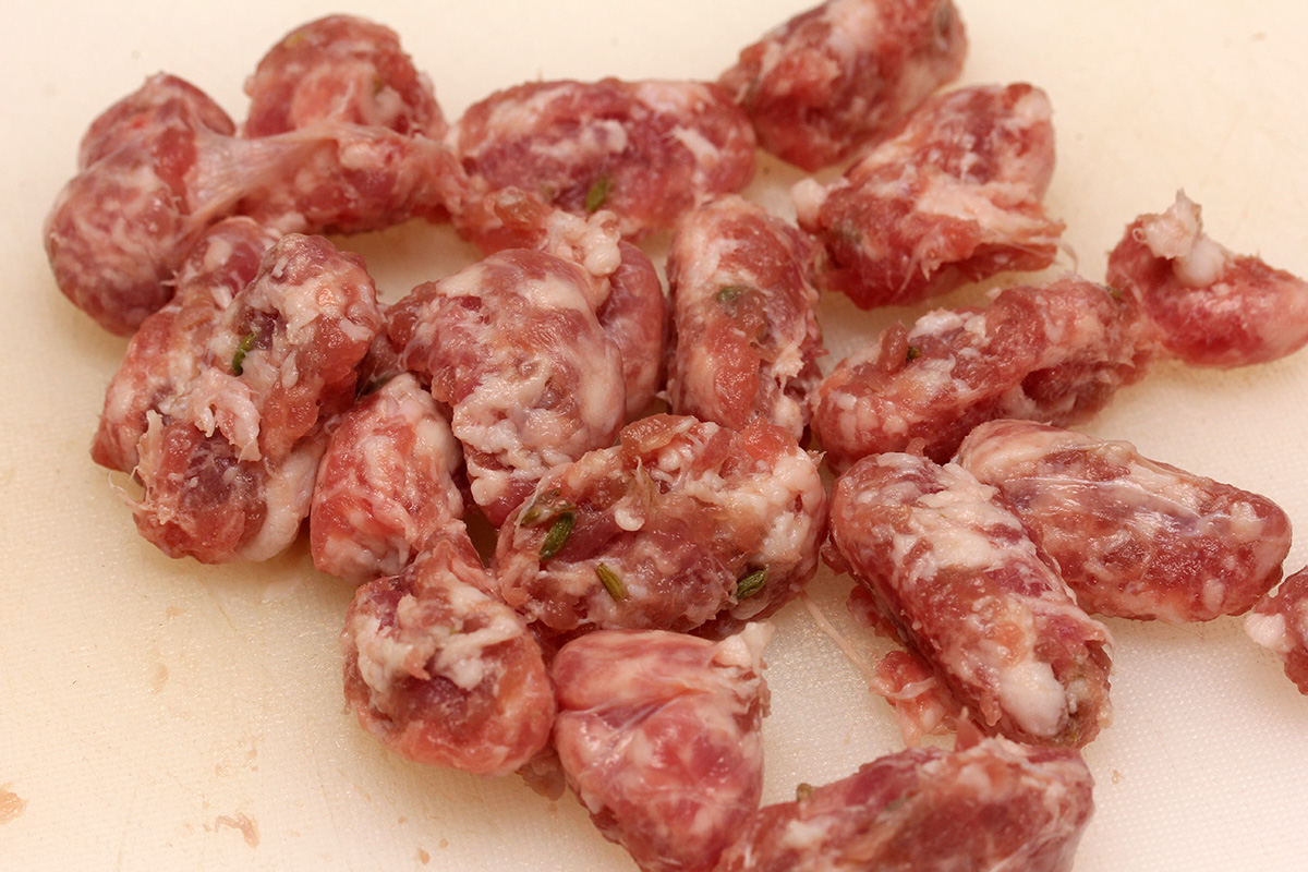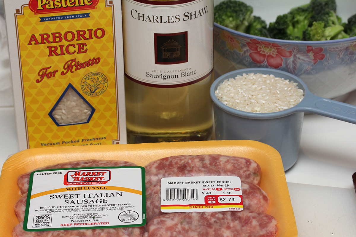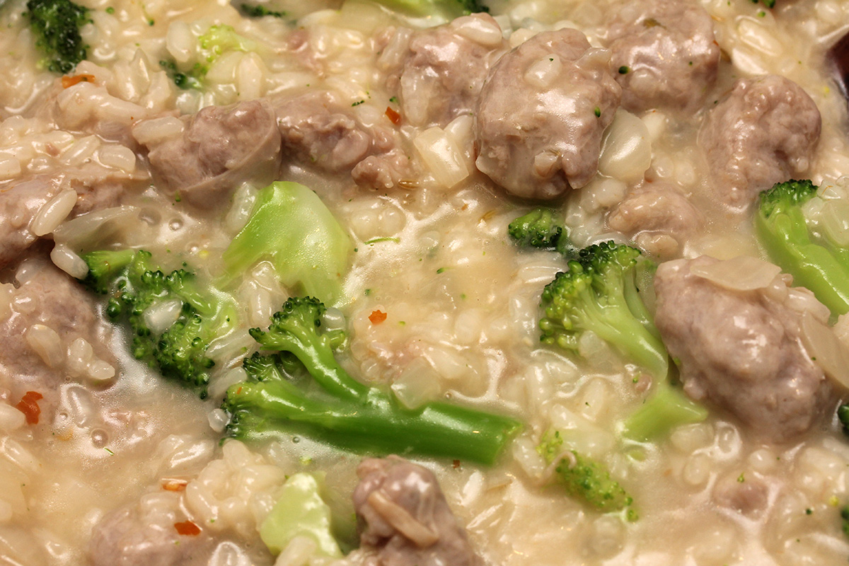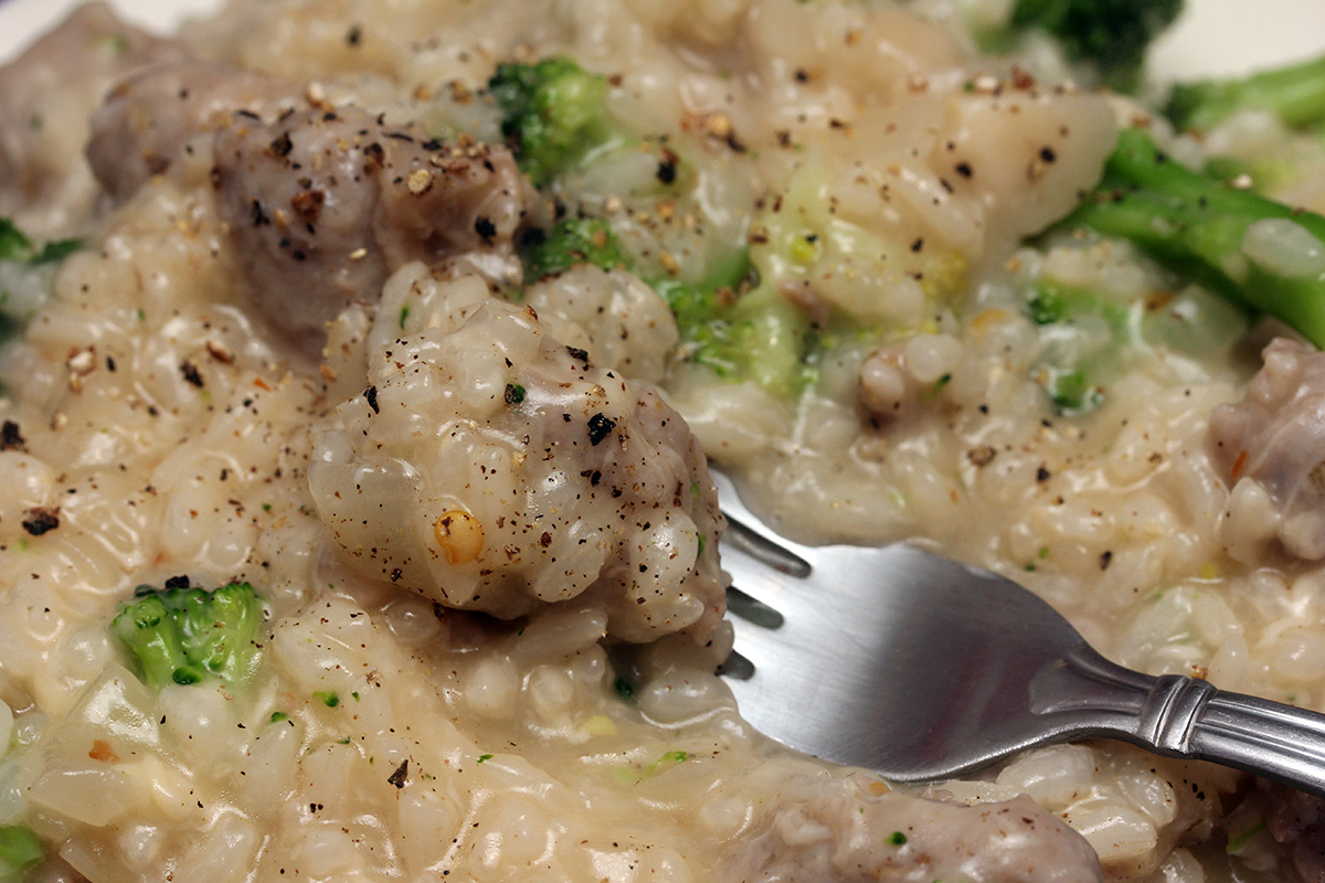 i finally made my risotto tonight. normally i just use half the package of italian sausages (3 sausages) but i used up the whole package. instead of squeezing out the meat from the casings and forming into tiny meatballs, i simply cut the raw sausages into smaller pieces, casing and all, to save time. i was afraid the sausage pieces would be too big, but once properly cooked, they shrink down in size anyway.