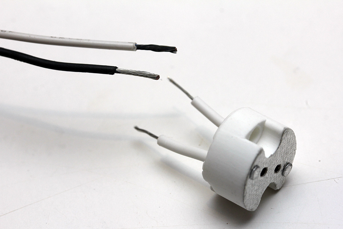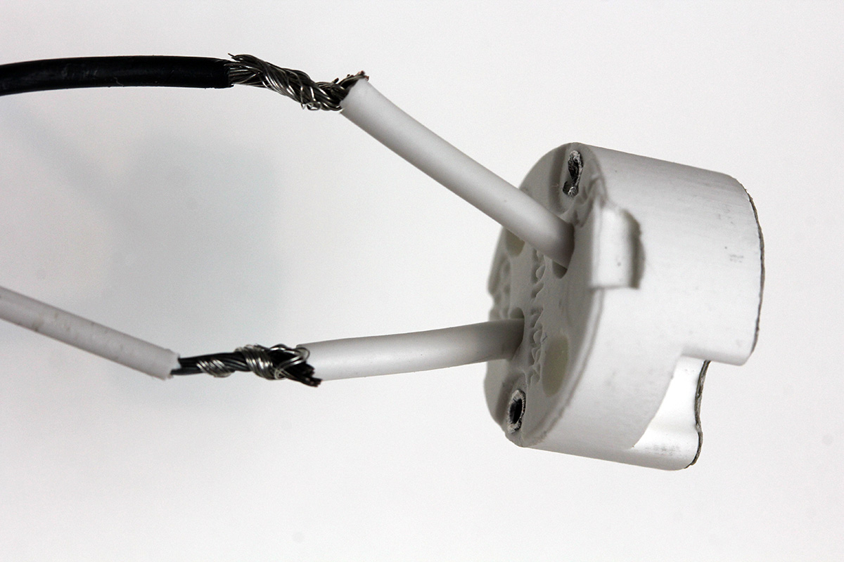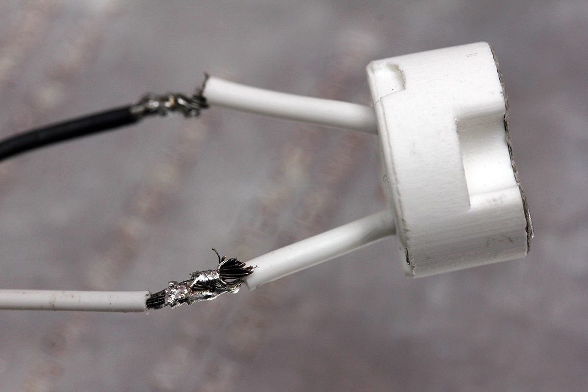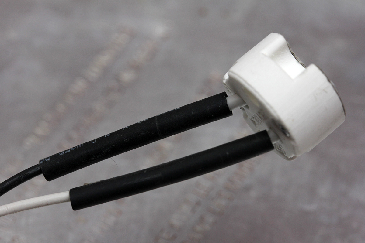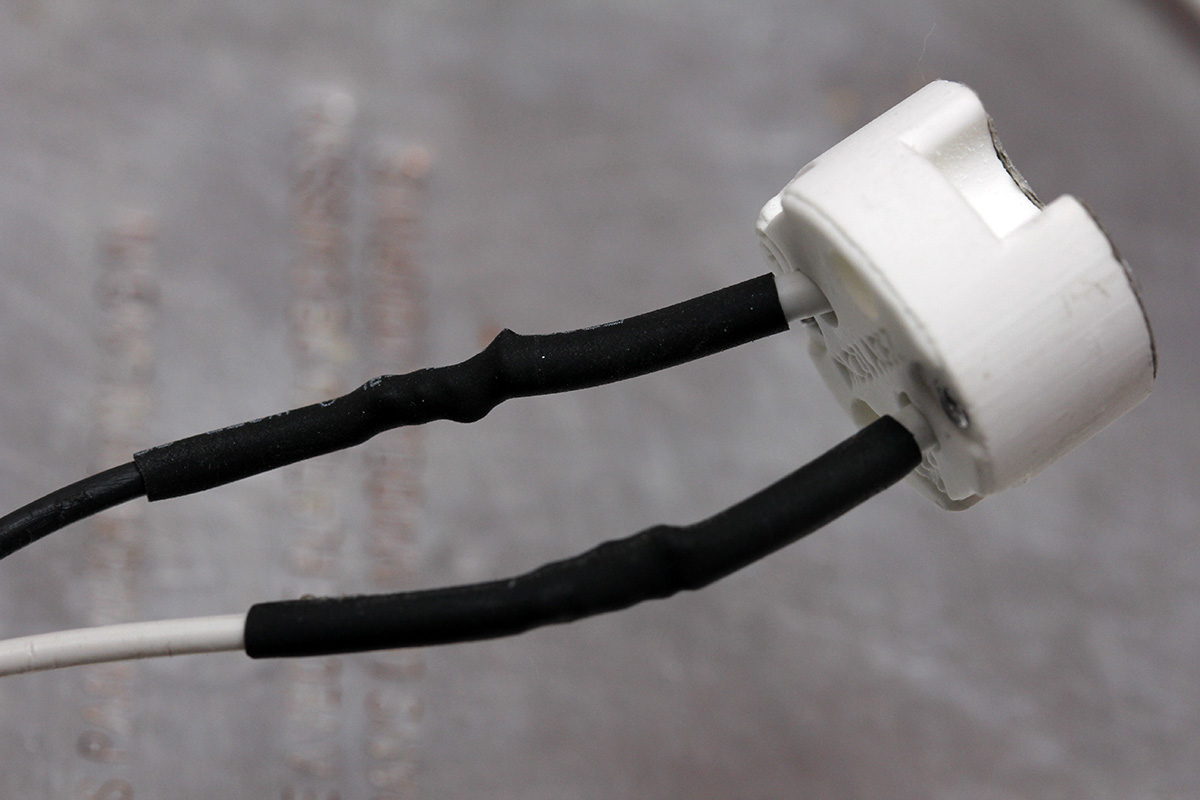 first i had to splice the new bi-pin socket to the old wires, since the wires that came with the sockets are too short. i snipped off the wires from a socket, but while i was stripping off the rubber covering, i pulled too hard and ended up pulling loose the entire sheath. also the wires are cheaply made, not copper, but some other material that's easy to break apart. the socket became useless and i had to toss it; good thing i had 9 other sockets. on the second socket i did a better job snipping the wires and removing the rubber covering. next i removed the plastic covering on the old wires, which wasn't so easy because the plastic had vulcanized over the years and didn't want to come off. the white wire was fine, but i mangled the end of the black wire and had to trim it back so i could get a fresh start. once that was done, i slipped on some heat shrink tubing before i wrapped the wires around each other. this was also difficult, because i didn't have a lot of exposed wires to work with (less than a centimeter each) and the socket wires were crap while the old wires (copper) didn't really want to wrap. i did the best i could, since i'd solder the connections anyway.