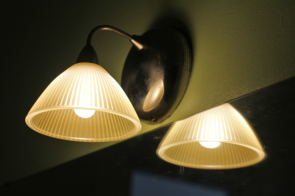 i connected the remaining loose wires with wiring nuts and went to the basement to switch off the bathroom electricity. i double-checked with the voltage tester just to be sure. i had the fixture reconnected to the wall wires and ready to mount, when i noticed the plastic covering on the wires coming out of the transformer were flaking off. this was not a good thing, because these are live wires once i flip the circuit breakers back on. so i removed the fixture and decided to cover up the exposed areas with some more heat shrink tubing. that worked very well, makes me feel safer knowing i did this. i didn't realize how hot the heat gun was and when i touched the metal fixture base it was pretty warm, so i had to let it cool down before mounting to the wall. with that done, i turned on the electricity in the basement and came back inside. in my mind i was expecting smoke and fire as my DIY electrician work failed spectacularly. instead, when i flipped the switch, the halogen worked perfectly, no sparks, no fire, just bright light.