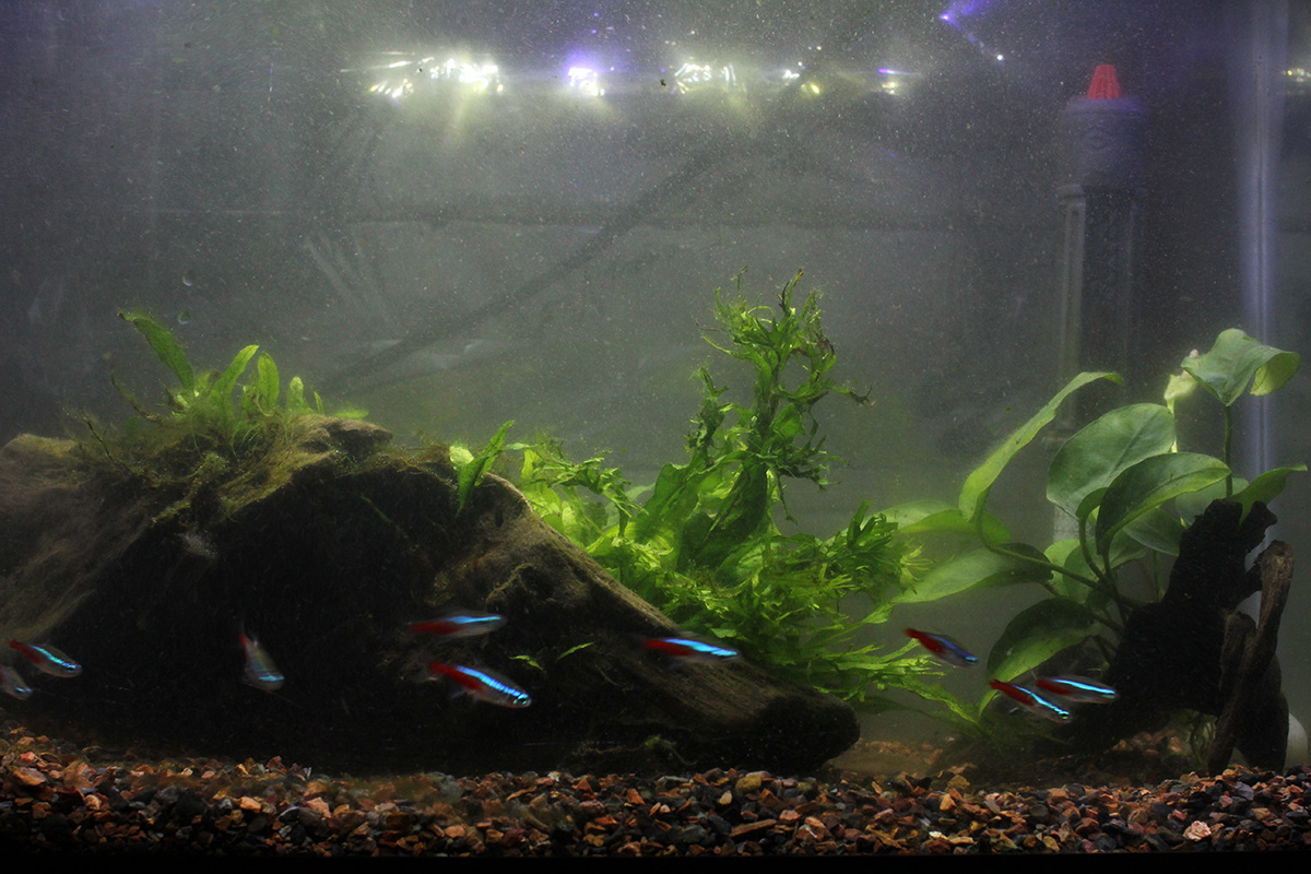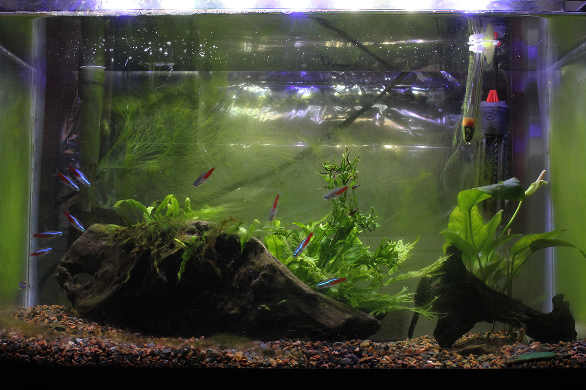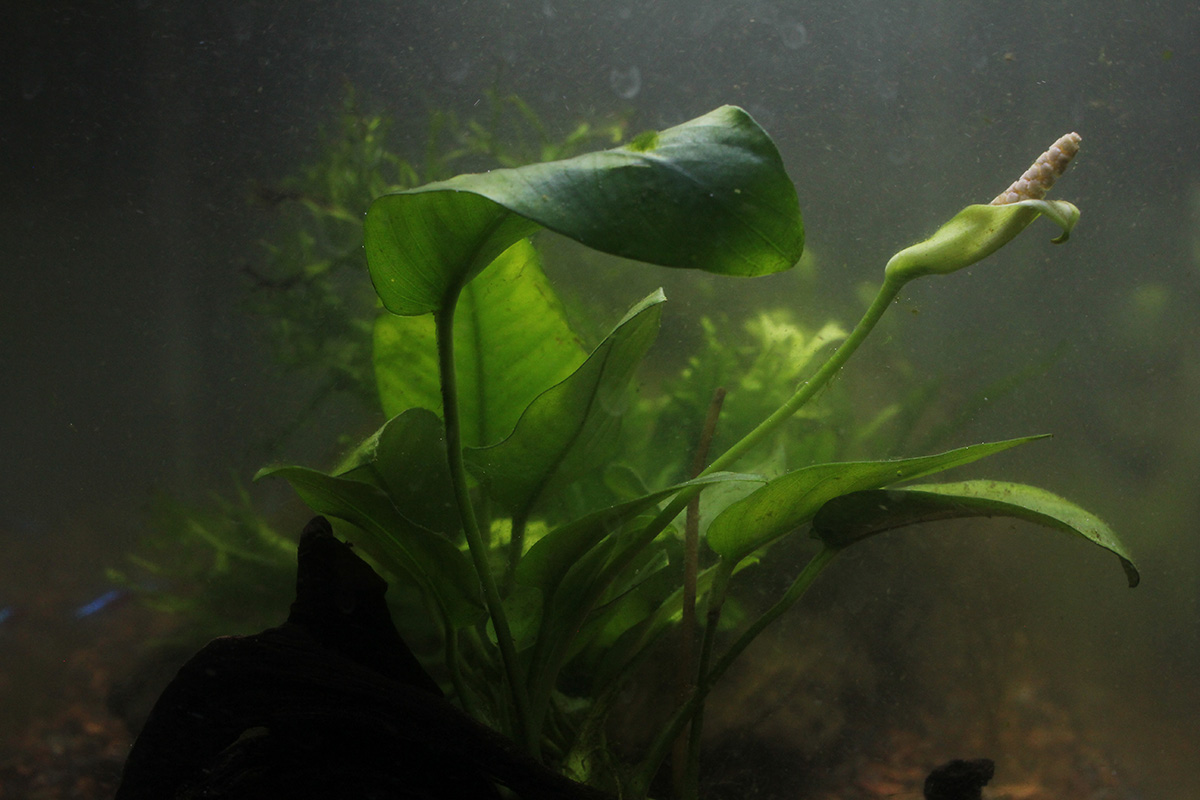 it's been 3 weeks since the last time i cleaned the aquarium. the thread algae didn't seem as thick on the plants as last night, though there was plenty of algae now on the glass. i poured water directly from the bucket after adding a few drops of seachem prime. last saturday the anbias nana sprouted a flower.