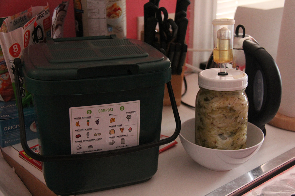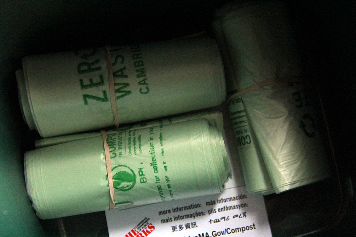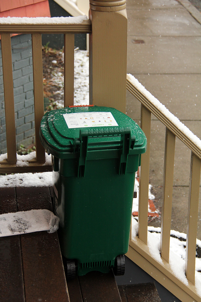 cambridge is introducing curbside composting throughout the city; up until now it's only been in a few select test areas (i think those with monday trash pickups). today they delivered the composting bins to my neighborhood. because our address is listed as 2 family, we only got a small green composting bin (up to my knee) while others got bigger bins (up to my hip). inside the bin was two even smaller bins, which we're supposed to keep indoors to store our compost until we collect enough to put in the larger bin outside.
