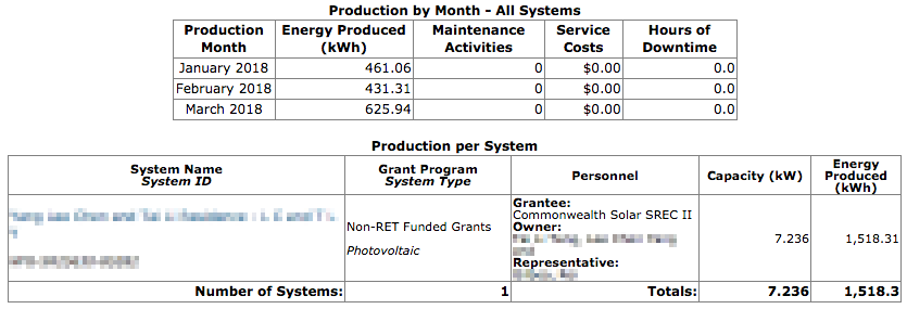i e-mailed lucas today, asked him if he had an update on the status of our energy production reporting, asked him if i could write to our SREC agent directly. he said there was no problem if i contacted adam. so while i was drafting an e-mail - asking if our old production numbers from january and february were accepted by massCEC (massachusetts clean energy center) since when the revenue grade meter automatically reported on 3/27 it only had the data for march - i suddenly remembered i had an account with massCEC-PTS (production tracking system) and could check the numbers myself. so i did that and saw they did input january and february production. however, the number they came up with was 892 kWh when we actually reported 982 kWh. i think they used some sort of formula because the january and february production numbers were not from the revenue grade meter (which was offline at the time).