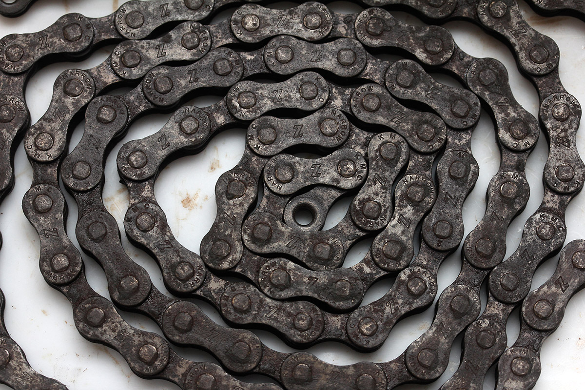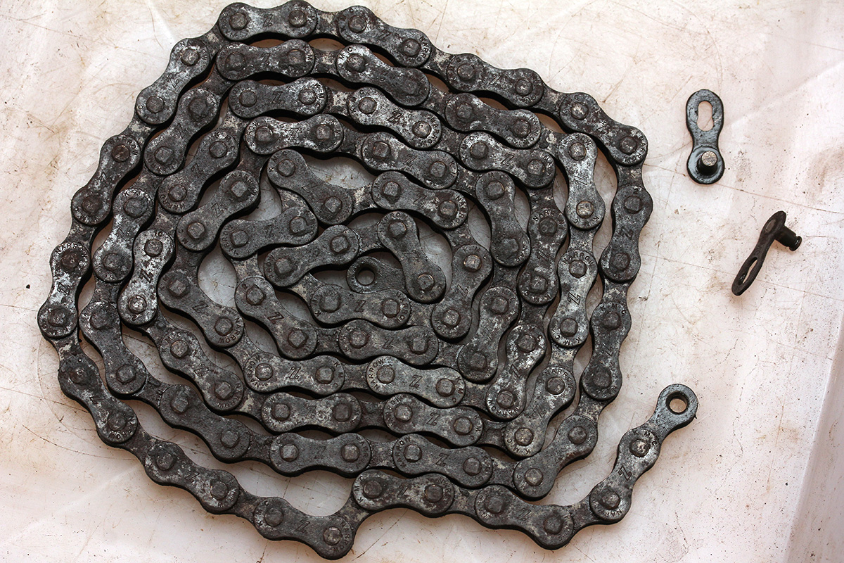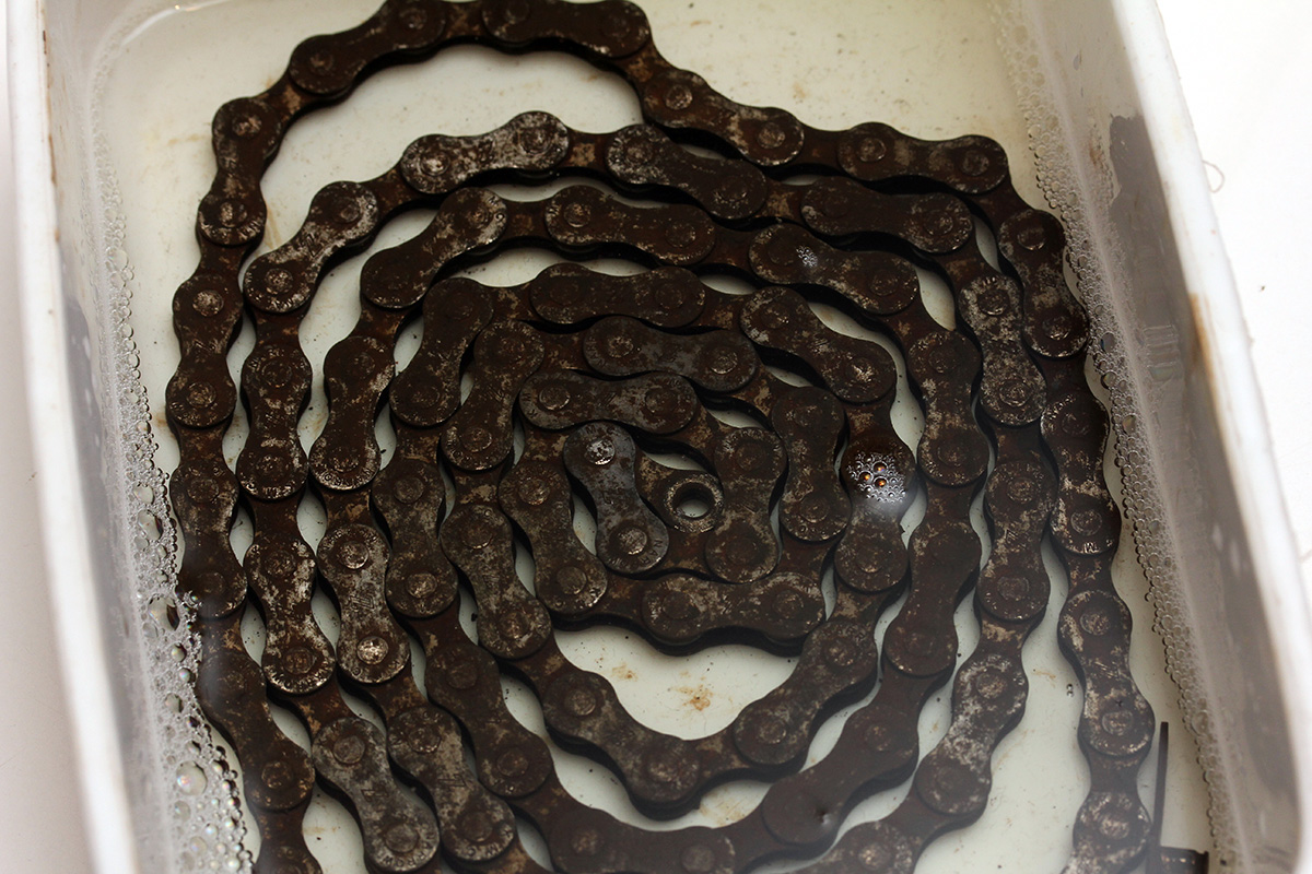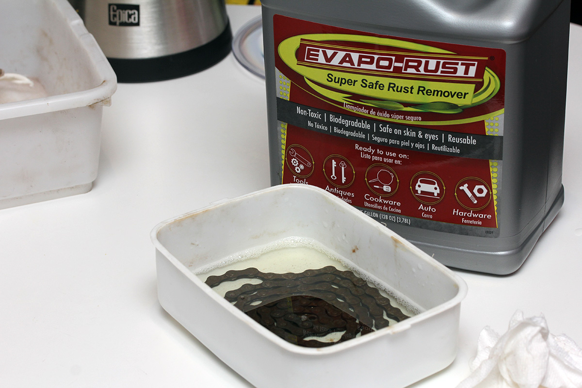 i tried evaporust on my bicycle chain. the chain itself didn't seem all that rusty after i took it off my cargo bike. maybe because i recently oiled it and rode the bike a few times, which is typical how i get rid of chain rust. i also wiped down the chain with a rag to get rid of any residual grease. i found a small enough plastic container to hold the chain and poured in some evaporust. i'm a real klutz when it comes to pouring so of course i spilled some on the floor. but being that evaporust is supposedly super safe, i wasn't that worried. i poured enough just to cover the chain.