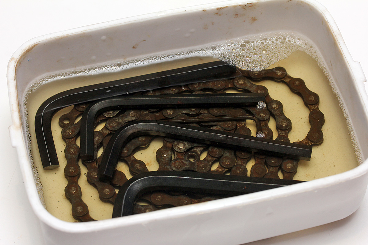 later i added a few hex wrenches i had lying around that had a tiny bit of rust. the evaporust solution went from clear to yellow to rusty brown then almost black as the day wore on. looking at the chain and the wrenches, i didn't really notice any improvements, but in order for maximum rust removal, i'd have to let everything soak overnight (12 hours).
