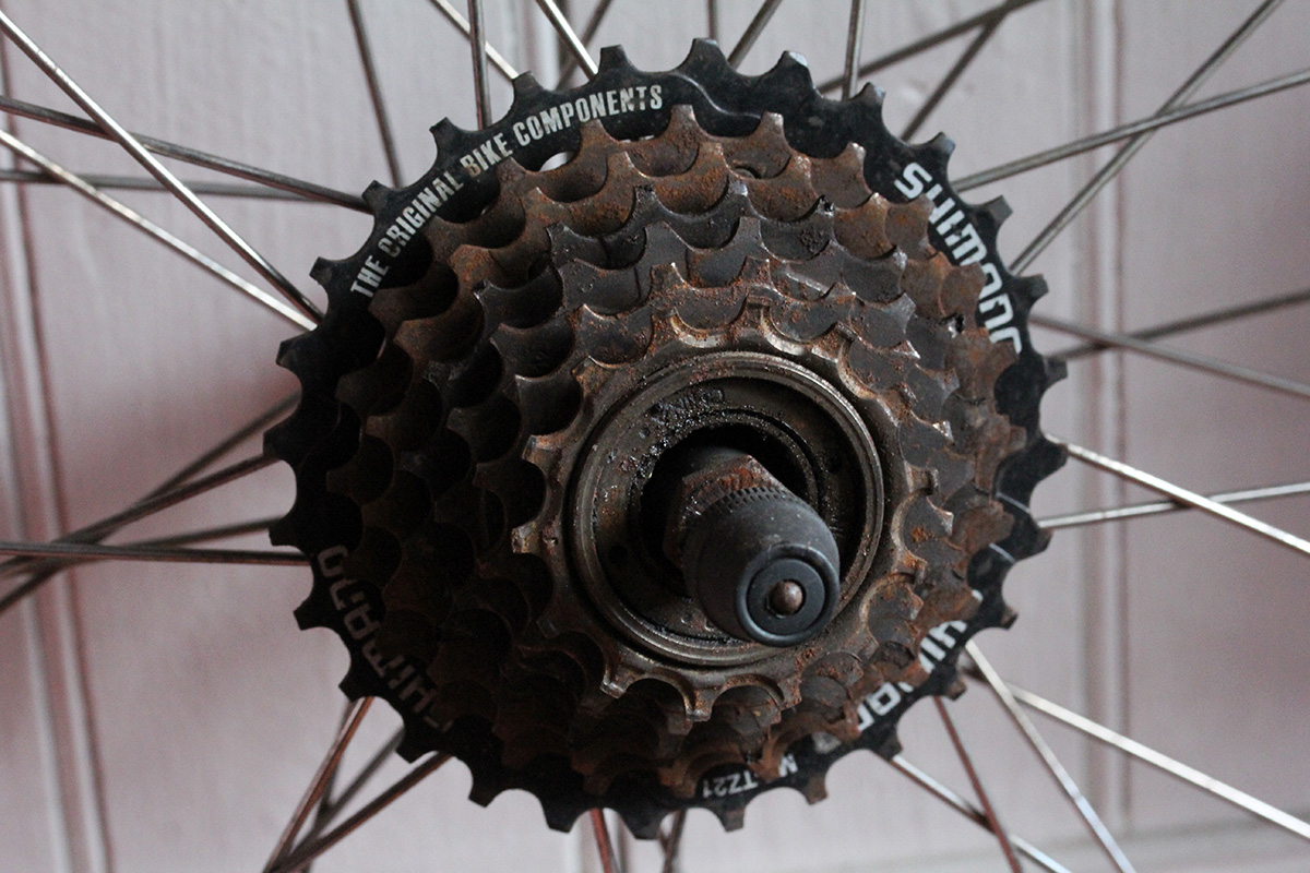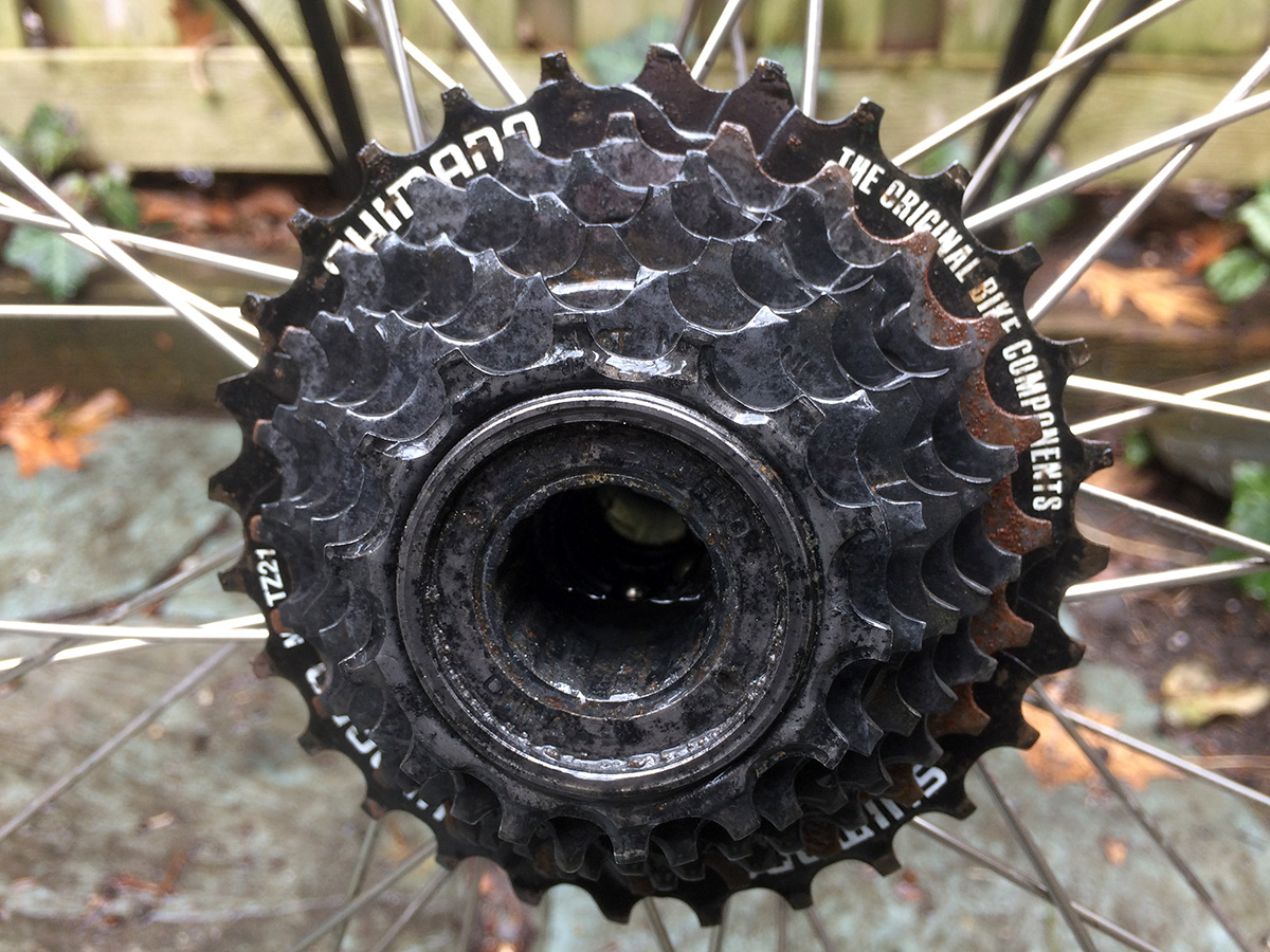 in the late morning i went down to the basement to take my bike wheel out of the rust removal solution. what i saw was pretty startling: the rust was gone! the freewheel had also seemed to change colors, before it was a dull black speckled with reddish brown rust, now it was silver speckled with a few dark stains. the largest cog still had some rust on it and that's because it probably wasn't submerged in the evaporust. once i get the freewheel removed, i can properly soak it again to remove and final bits of rust. but evaporust really works!